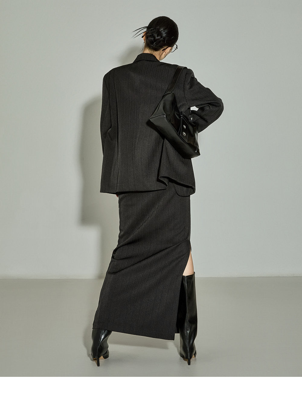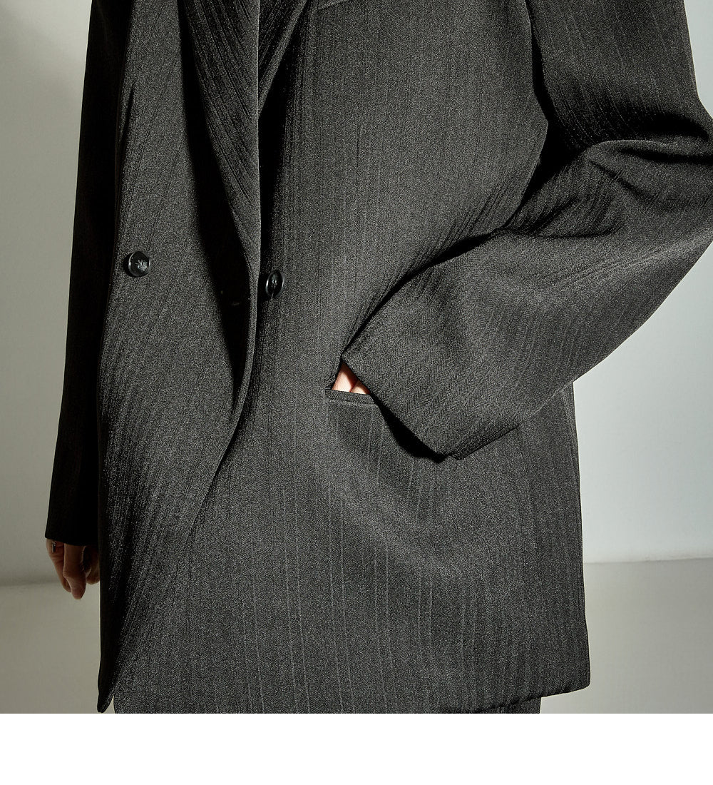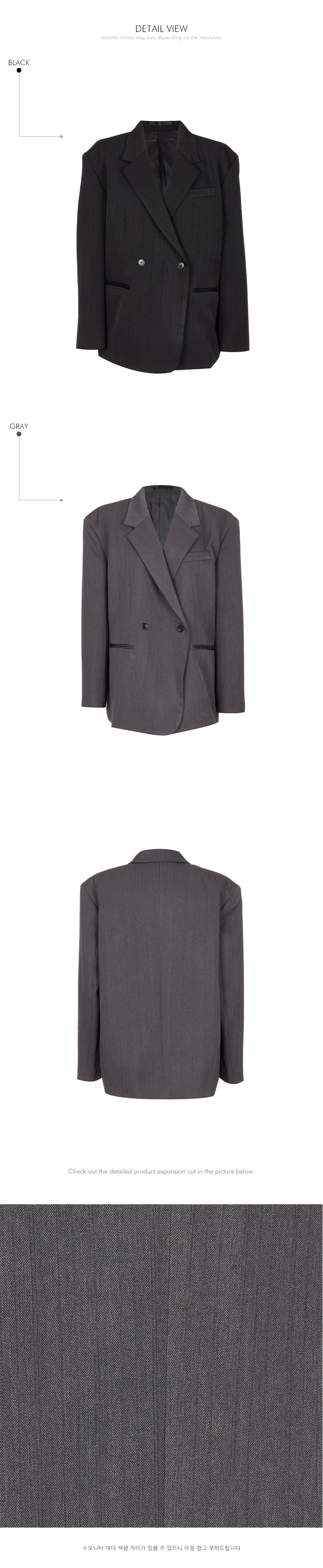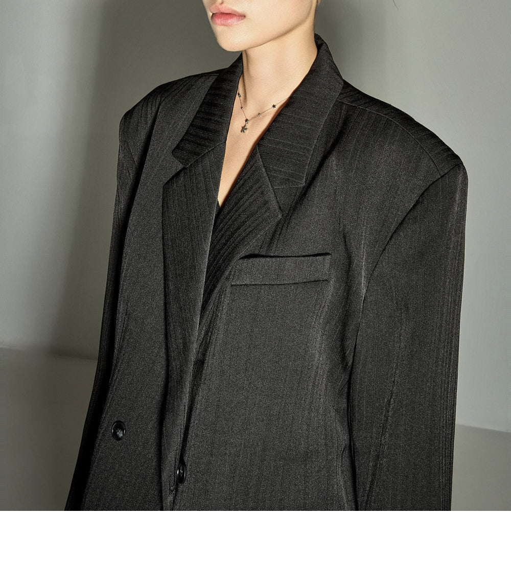 The jacket is crafted from a polyester, rayon, and polyurethane blend,
