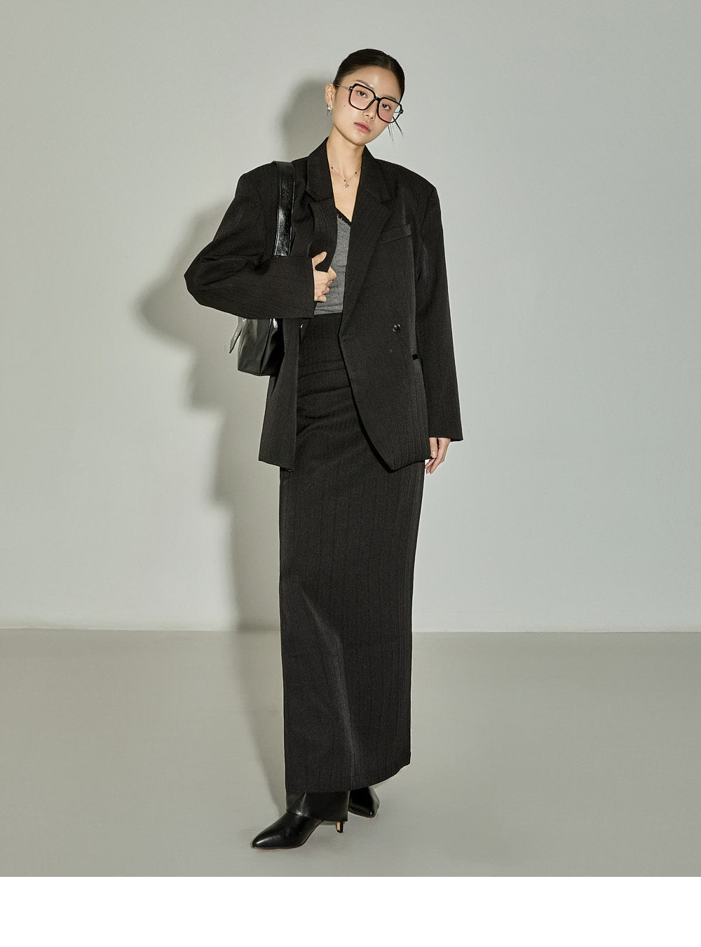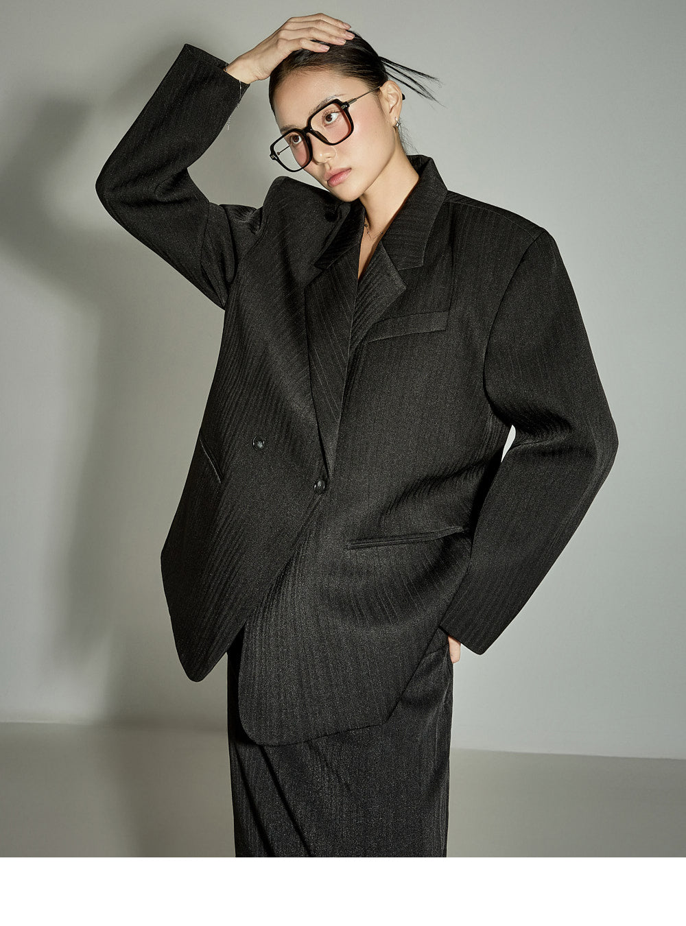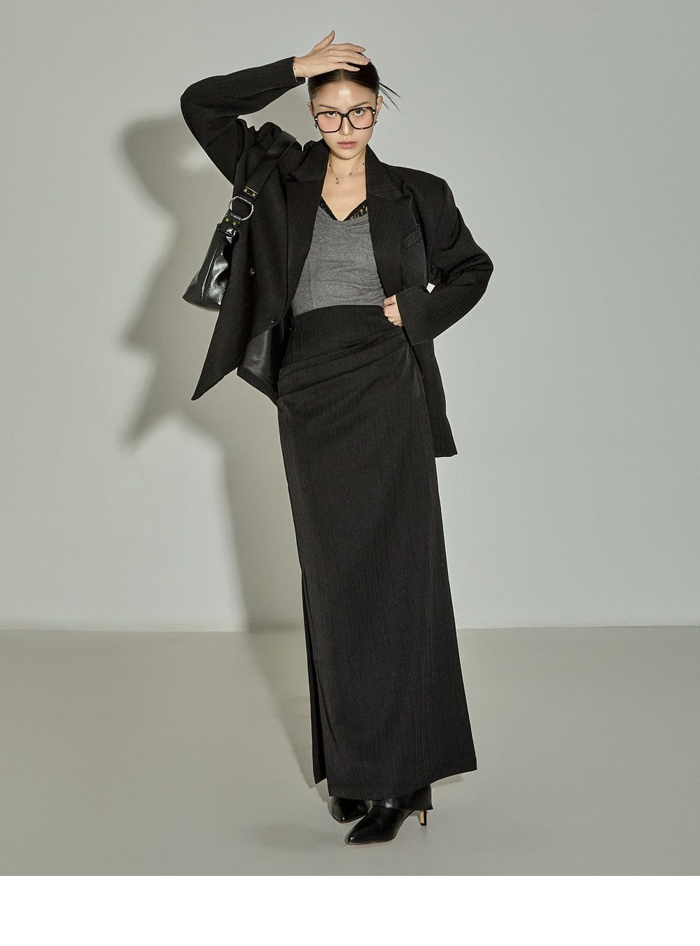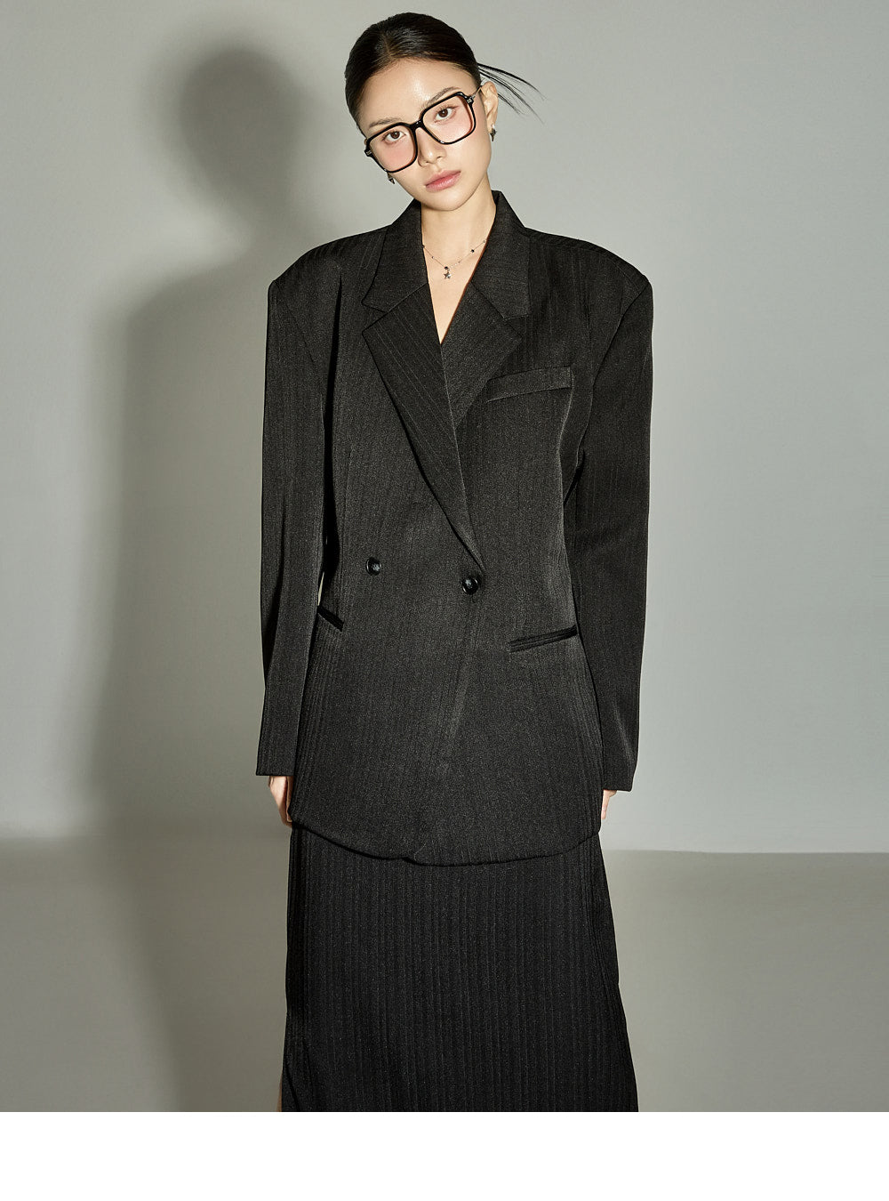 The jacket is crafted from a polyester, rayon, and polyurethane blend,