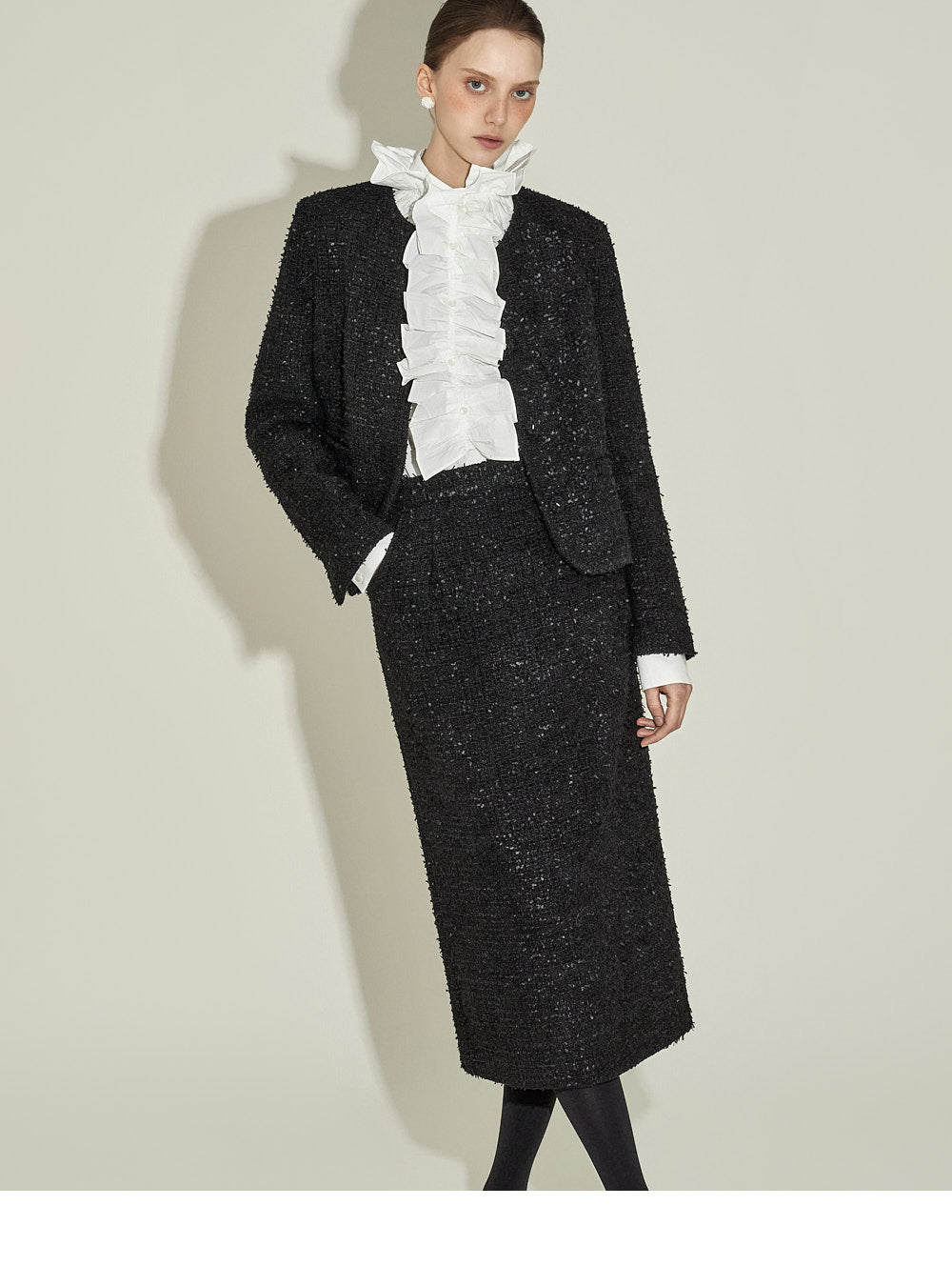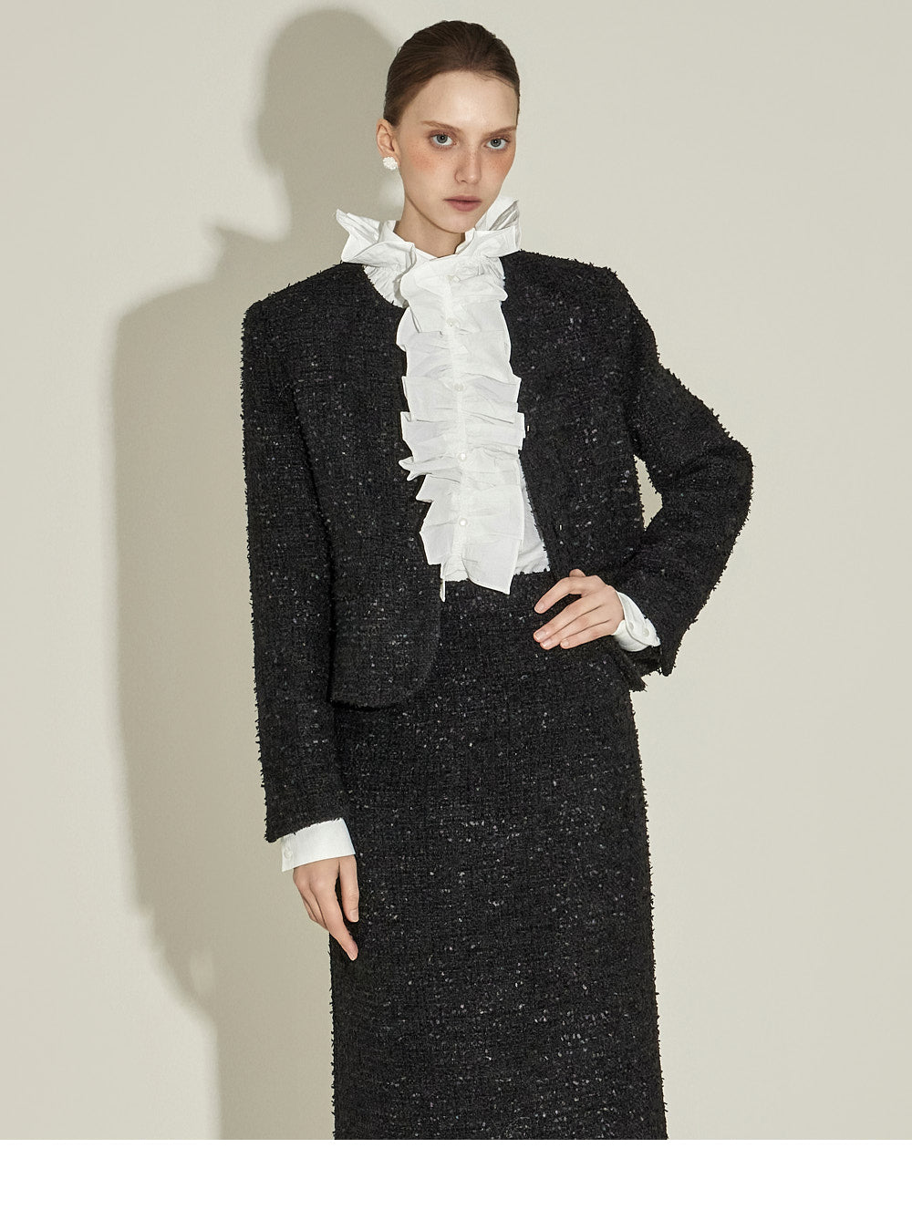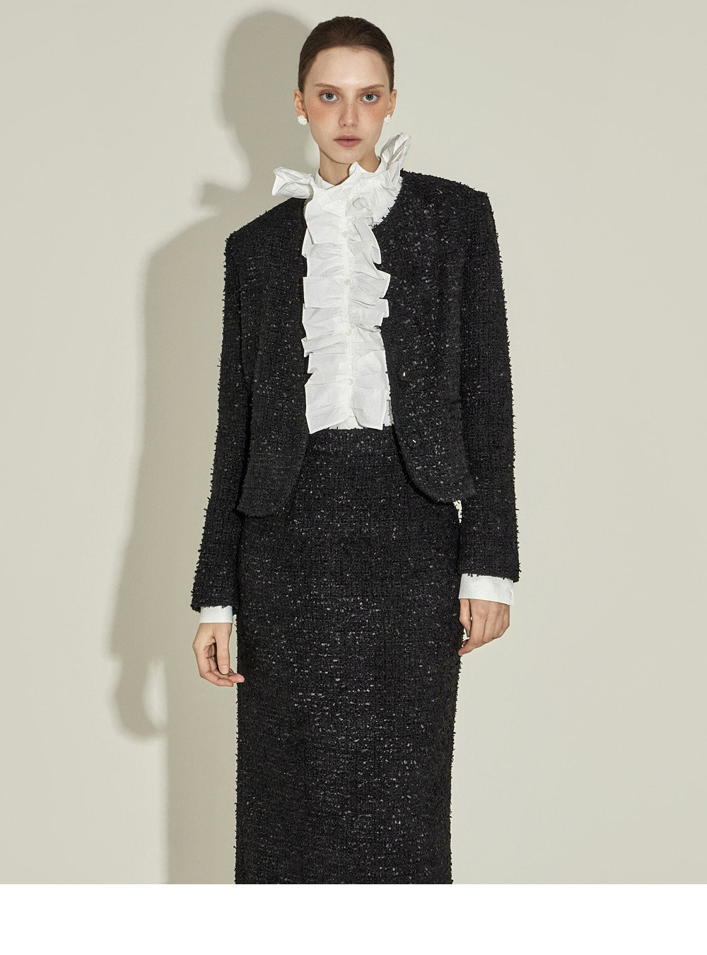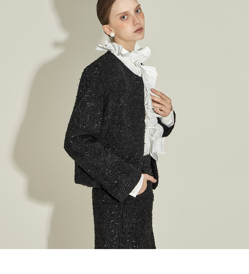 The luxurious tweed fabric creates a classic yet elegant vibe.