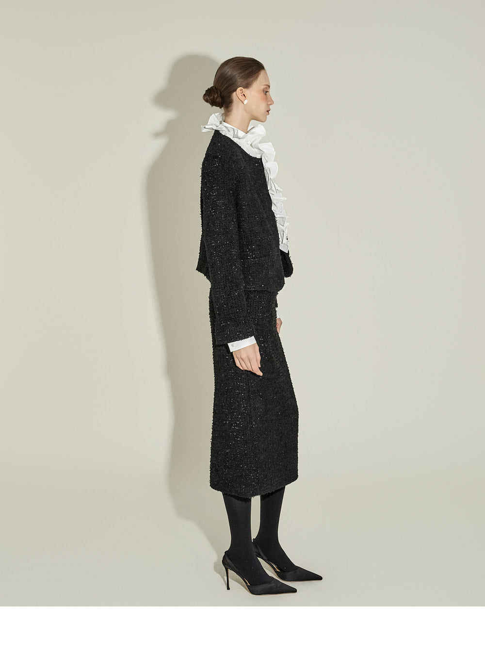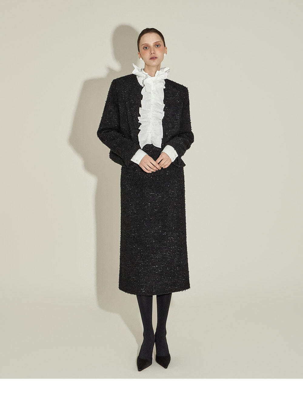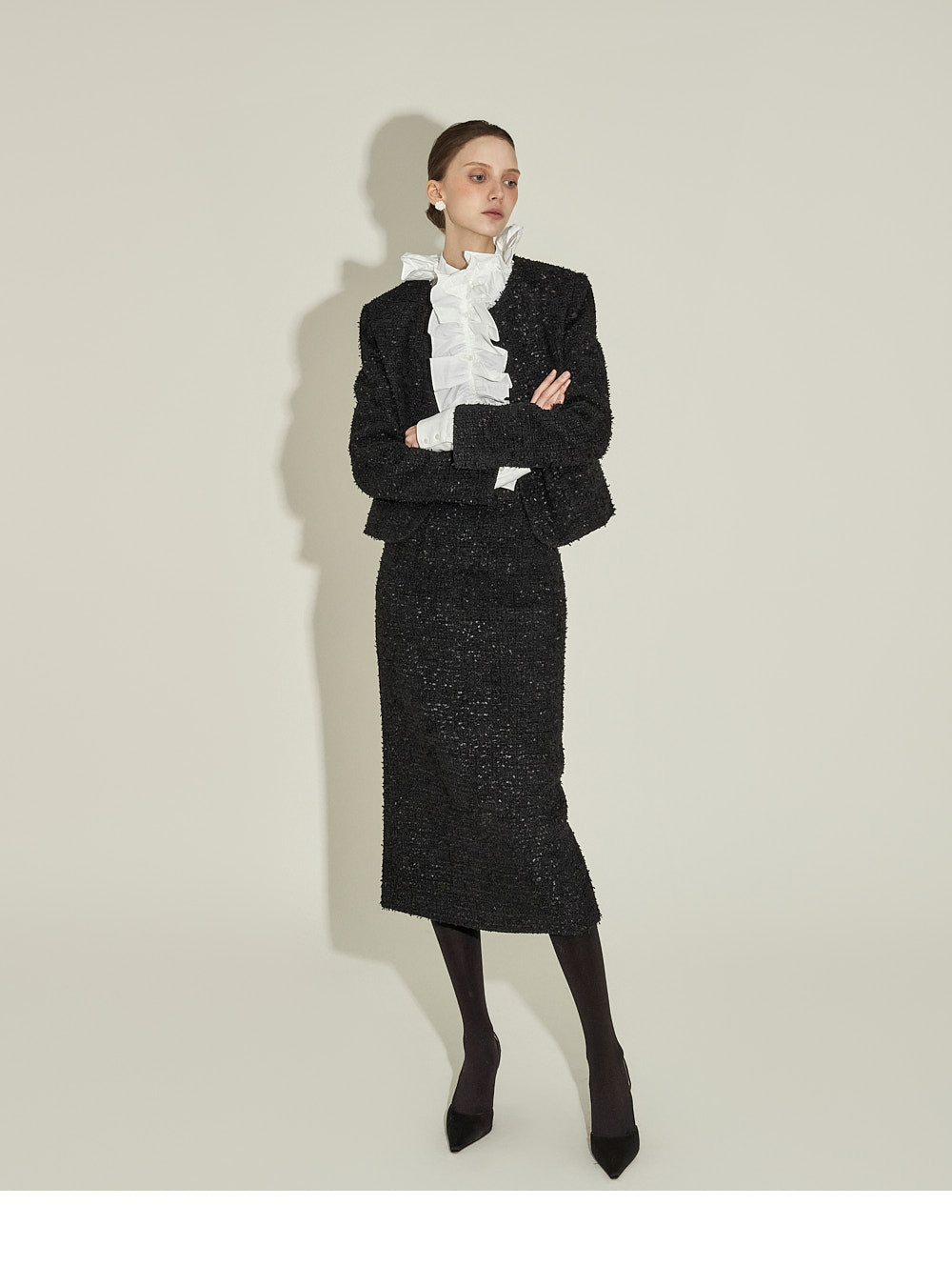The luxurious tweed fabric creates a classic yet elegant vibe.