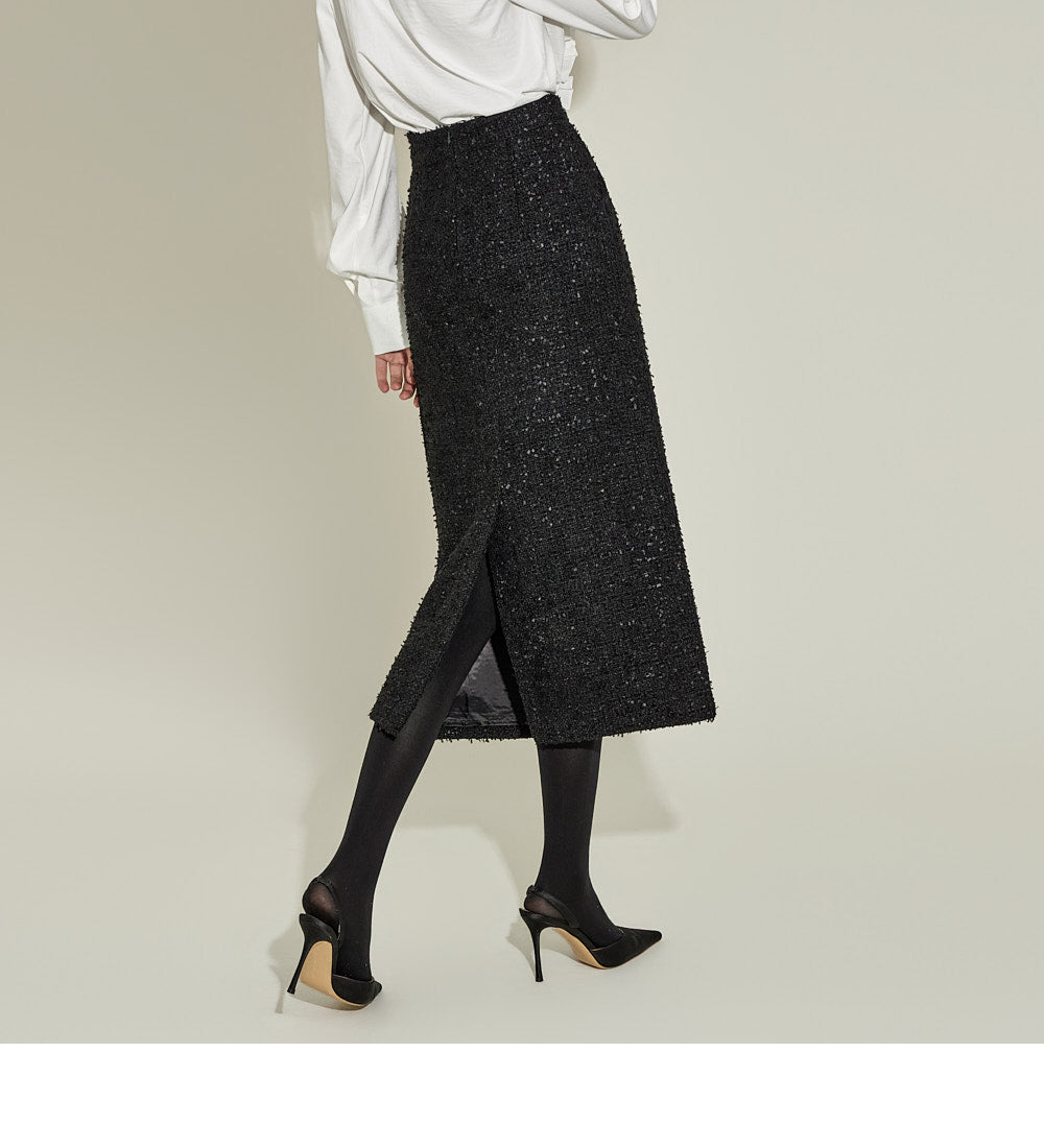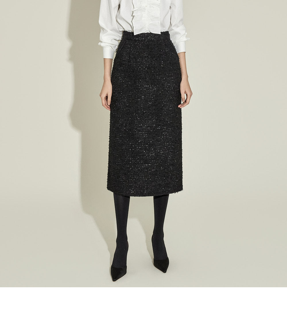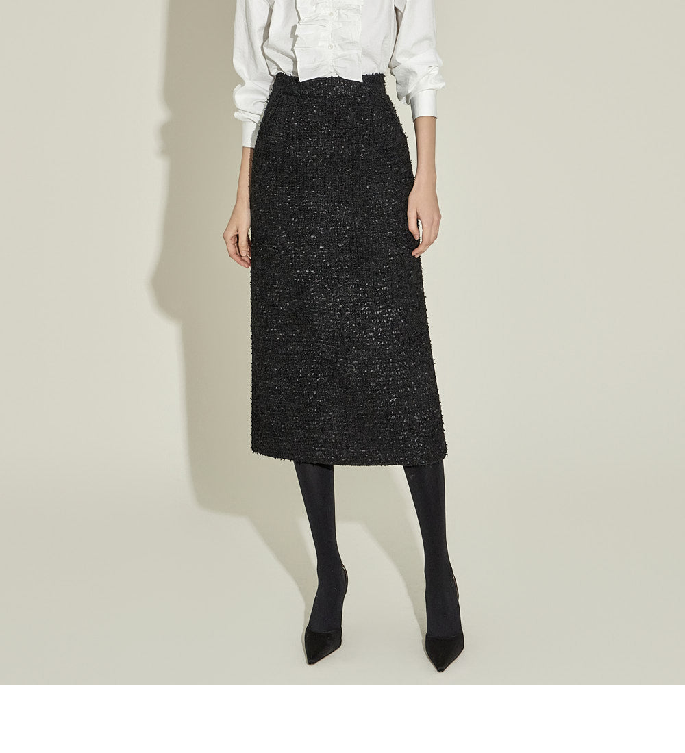 The skirt, with its midi length and H-line fit, creates a refined silhouette.