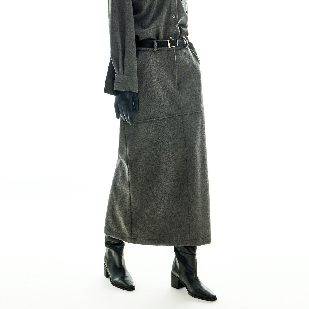 The skirt features an H-line silhouette with a front slit and back slit detail,