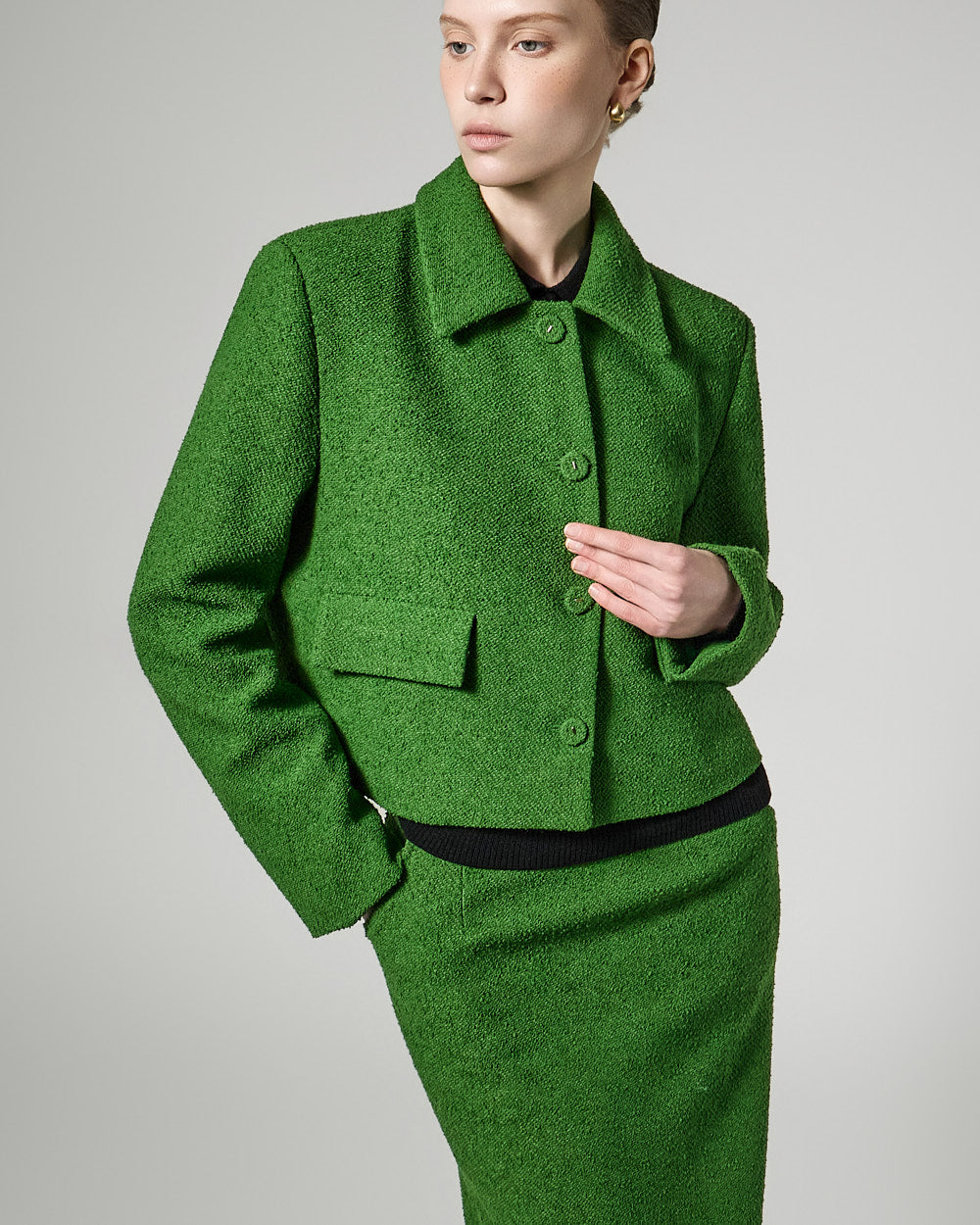 The jacket has a slim fit and a short length,