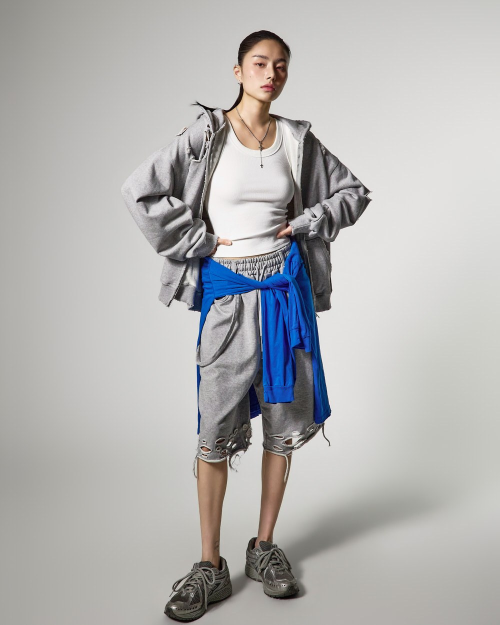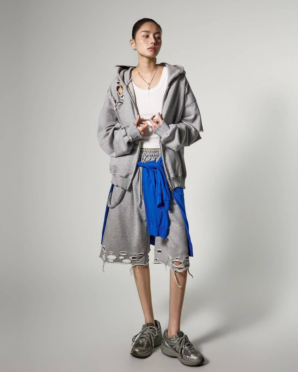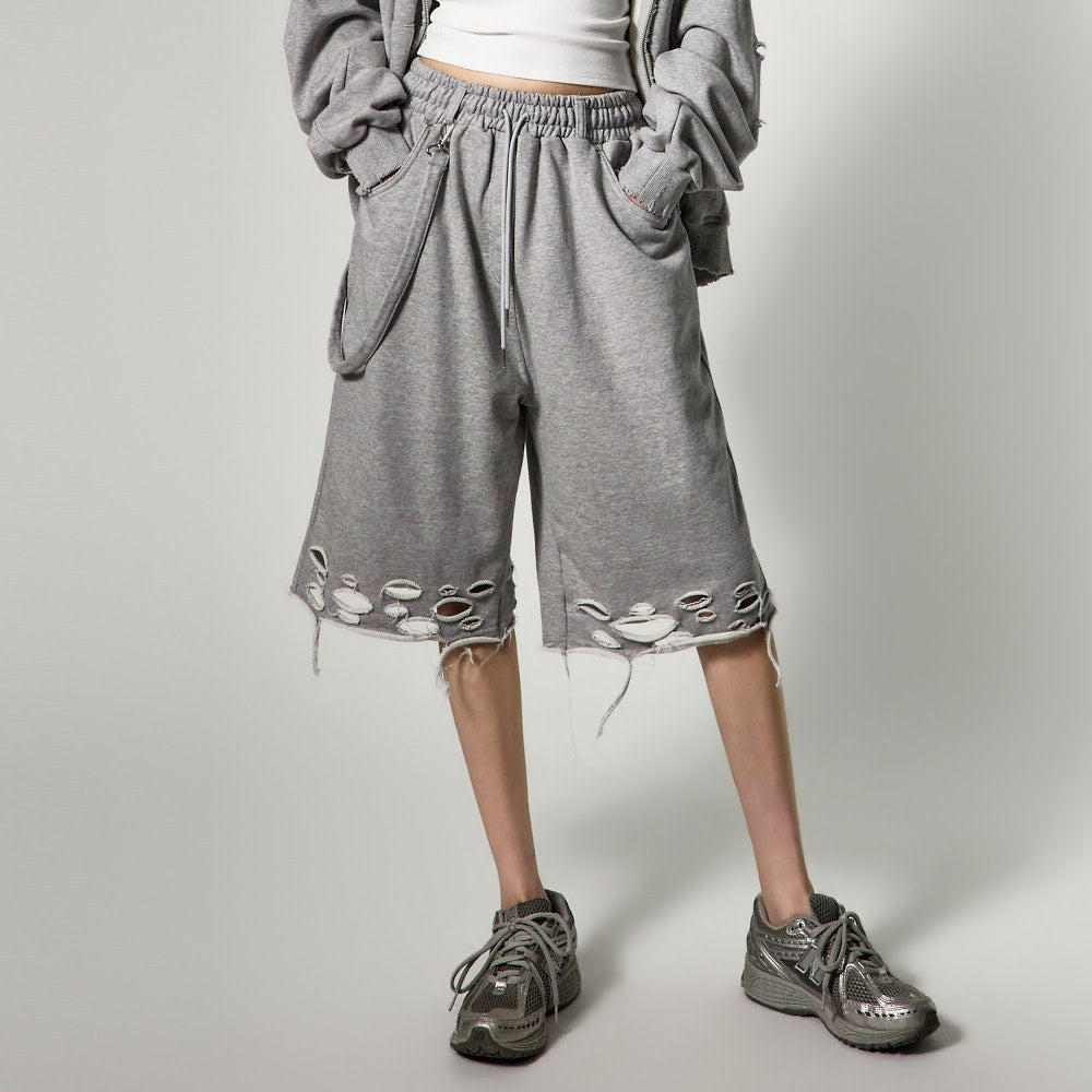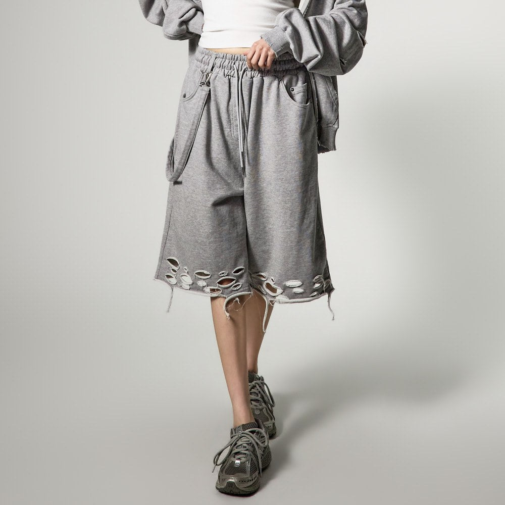 ナチュラルなカッティングとダメージディテールがユニークな魅力を強調し、サイドとバックポケットが実用性を高めます。このアイテムは、単独でスタイリッシュなルックを演出できるだけでなく、