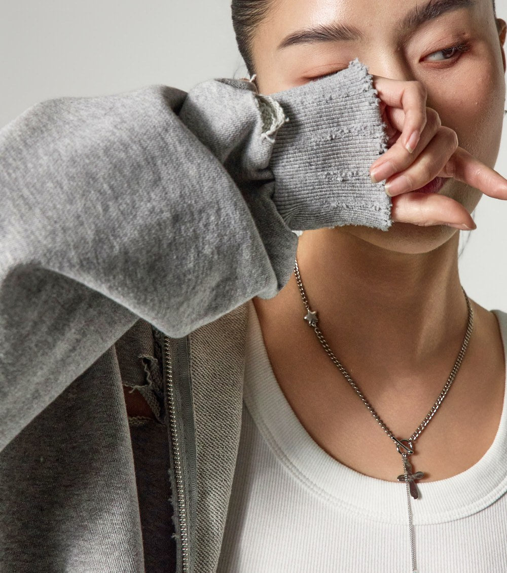 ゆったりとしたフィット感で、イージーなスタイリングを完成させ、自然に加えられたダメージディテールがおしゃれなアクセントとなり、トレンディなムードを演出します。