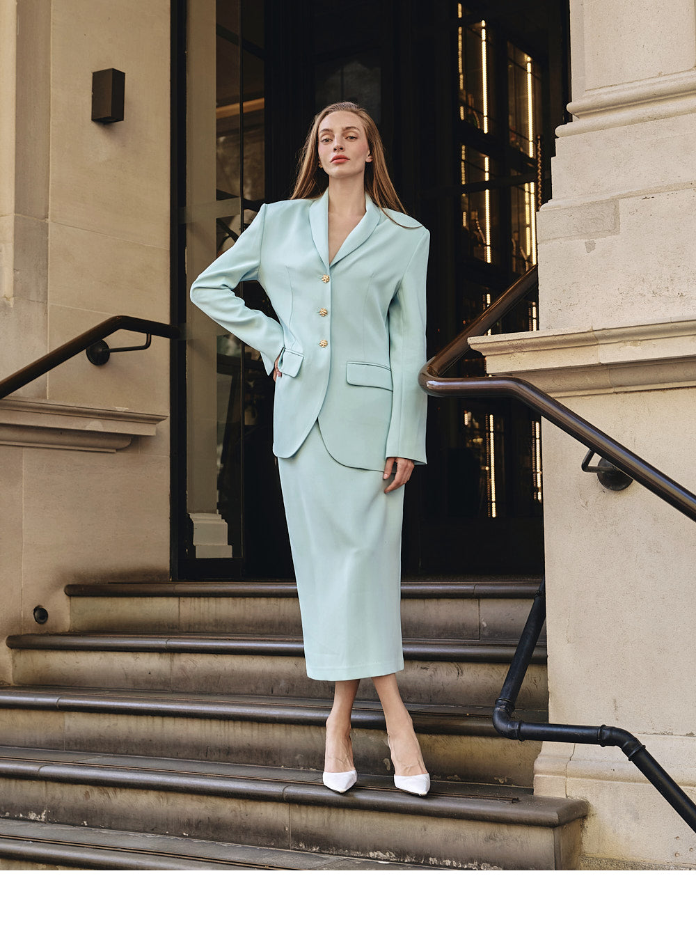 モデルの身長は174cmで、 SKY MINTのジャケットはONEサイズ、スカートはSサイズを着用しています。