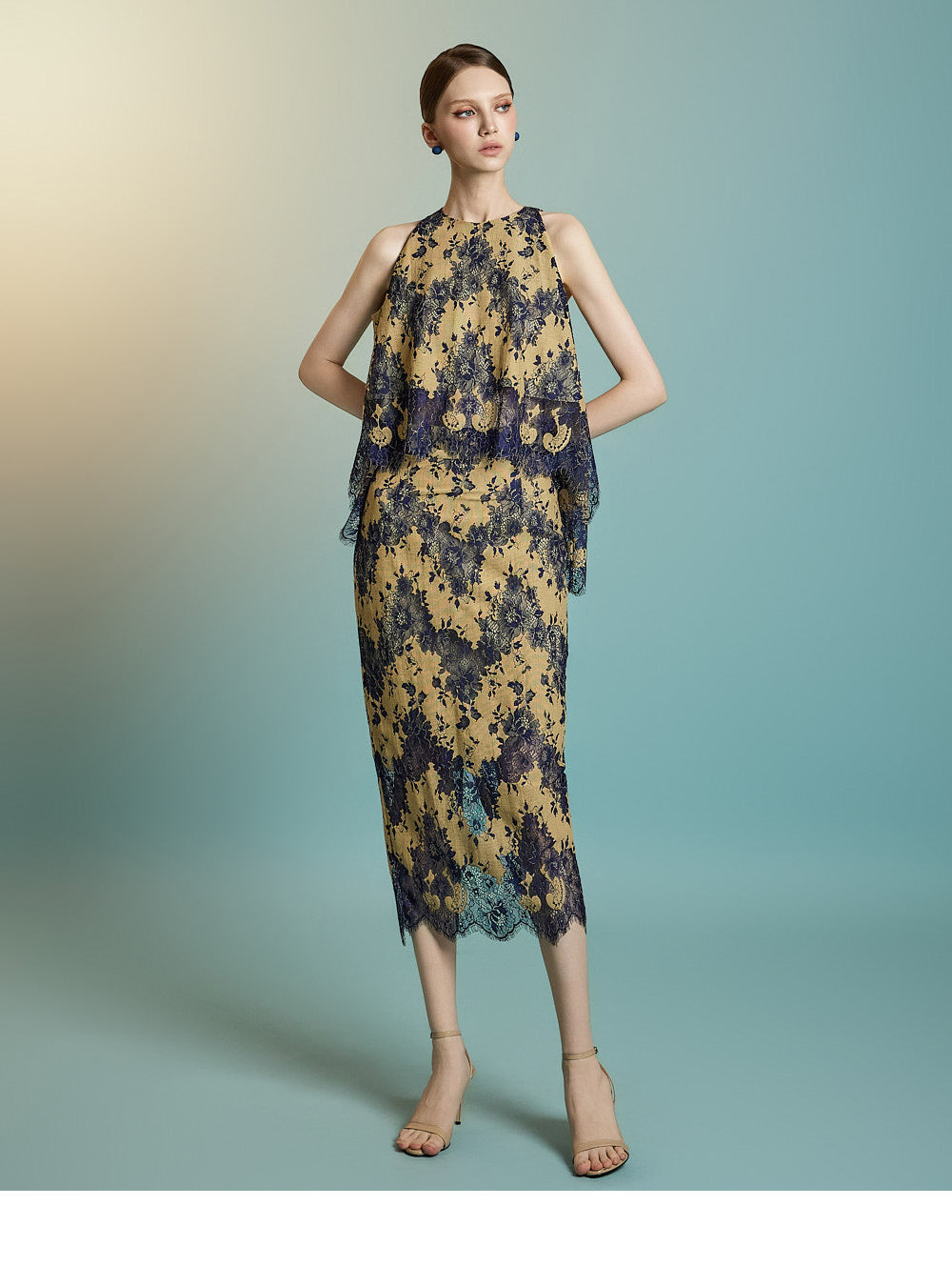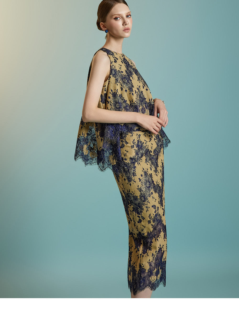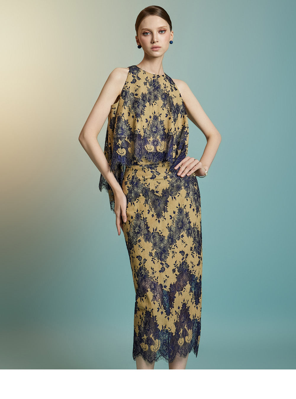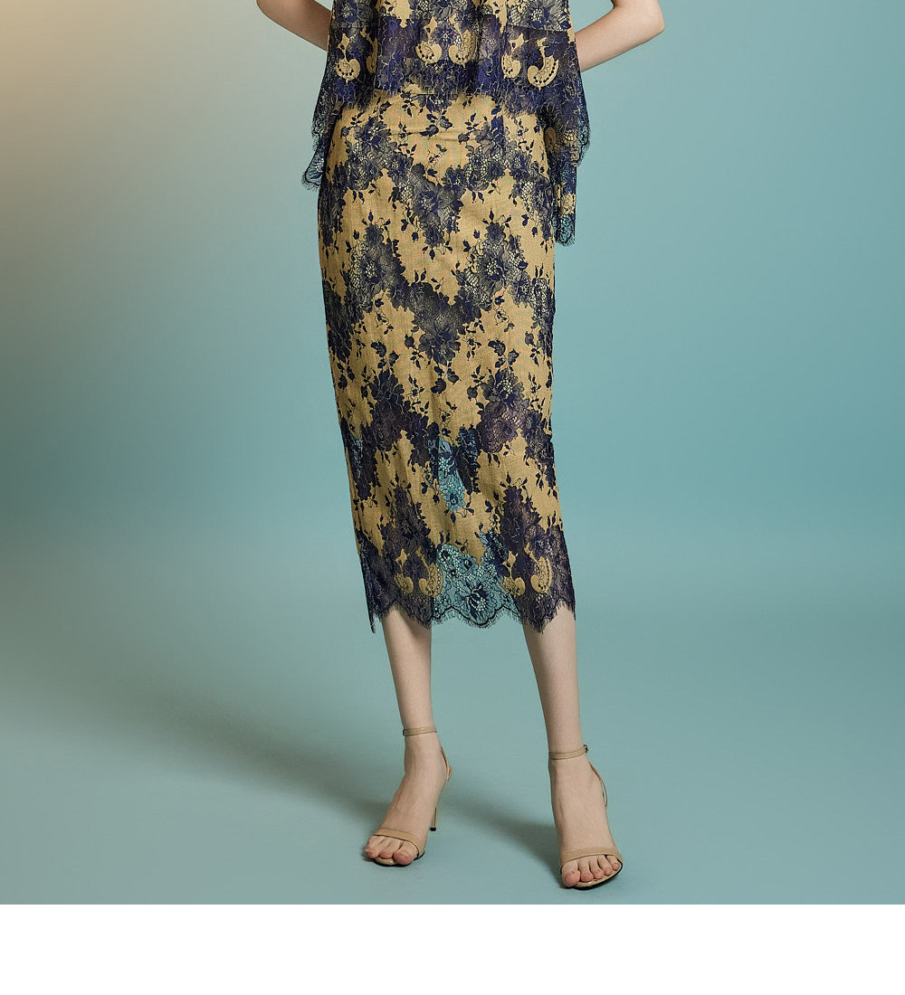 トップスとスカートの両方に施された繊細な花柄のレースが、洗練された洗練された印象を与えます。