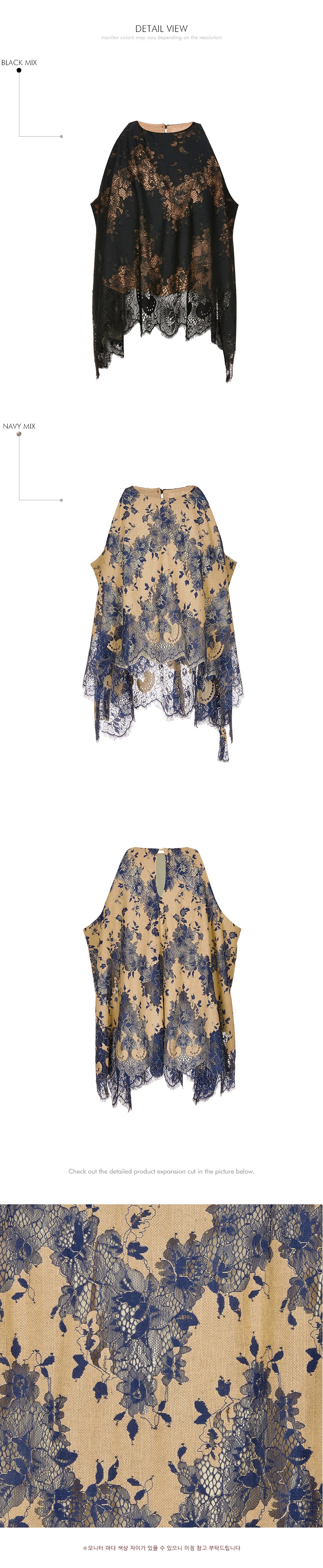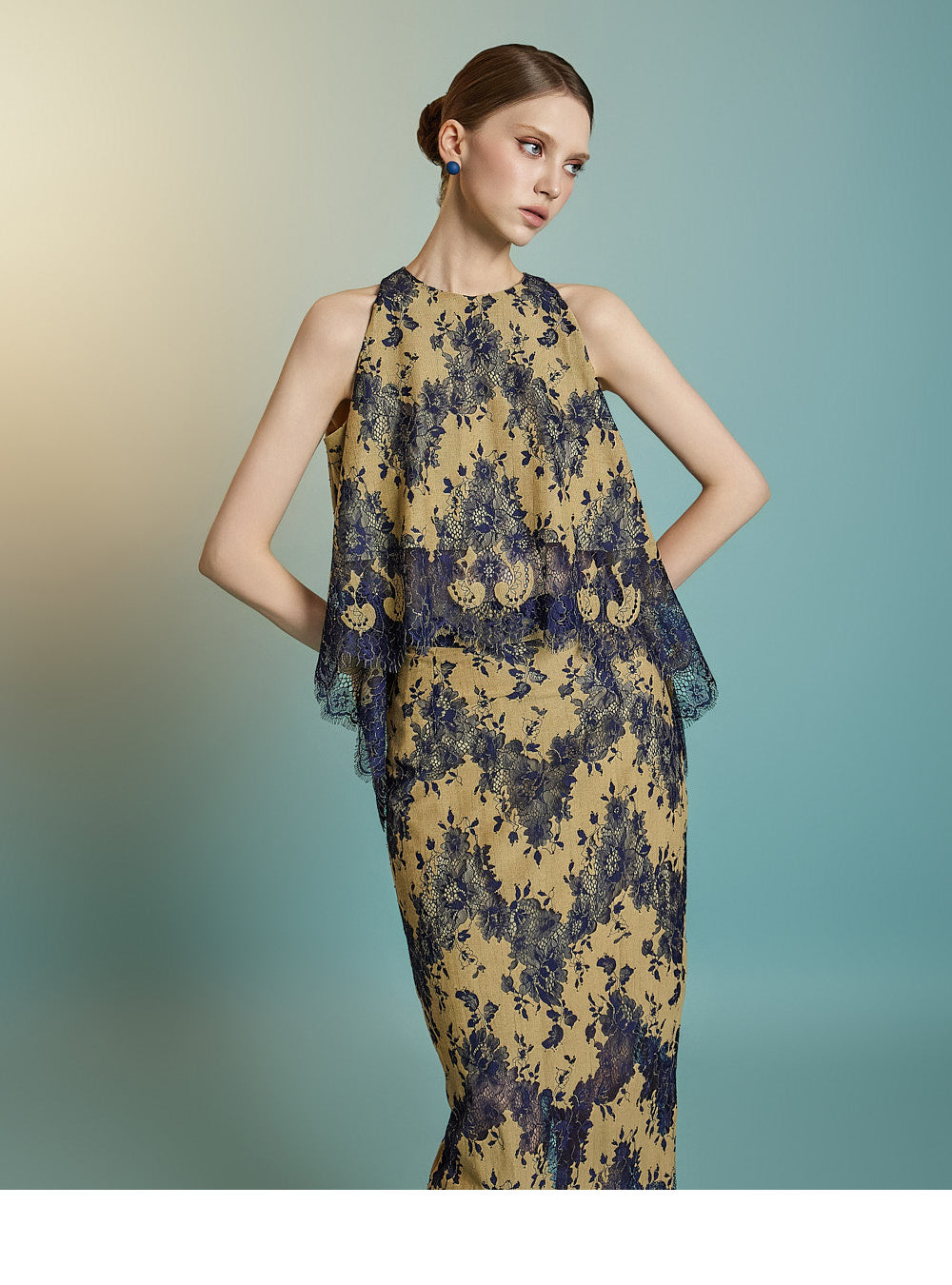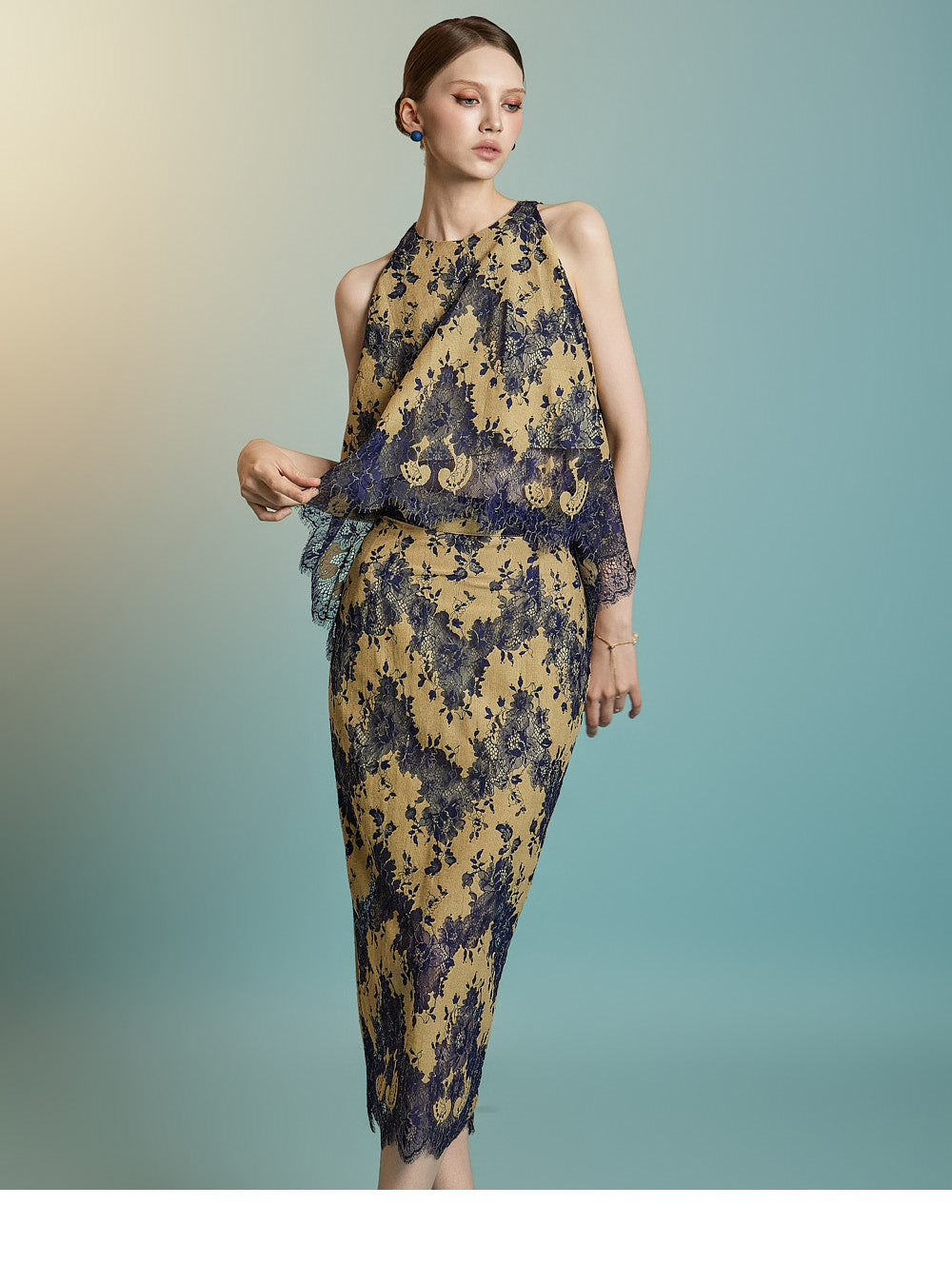 トップスとスカートの両方に施された繊細な花柄のレースが、洗練された洗練された印象を与えます。
