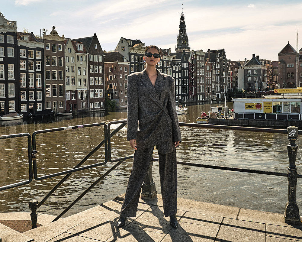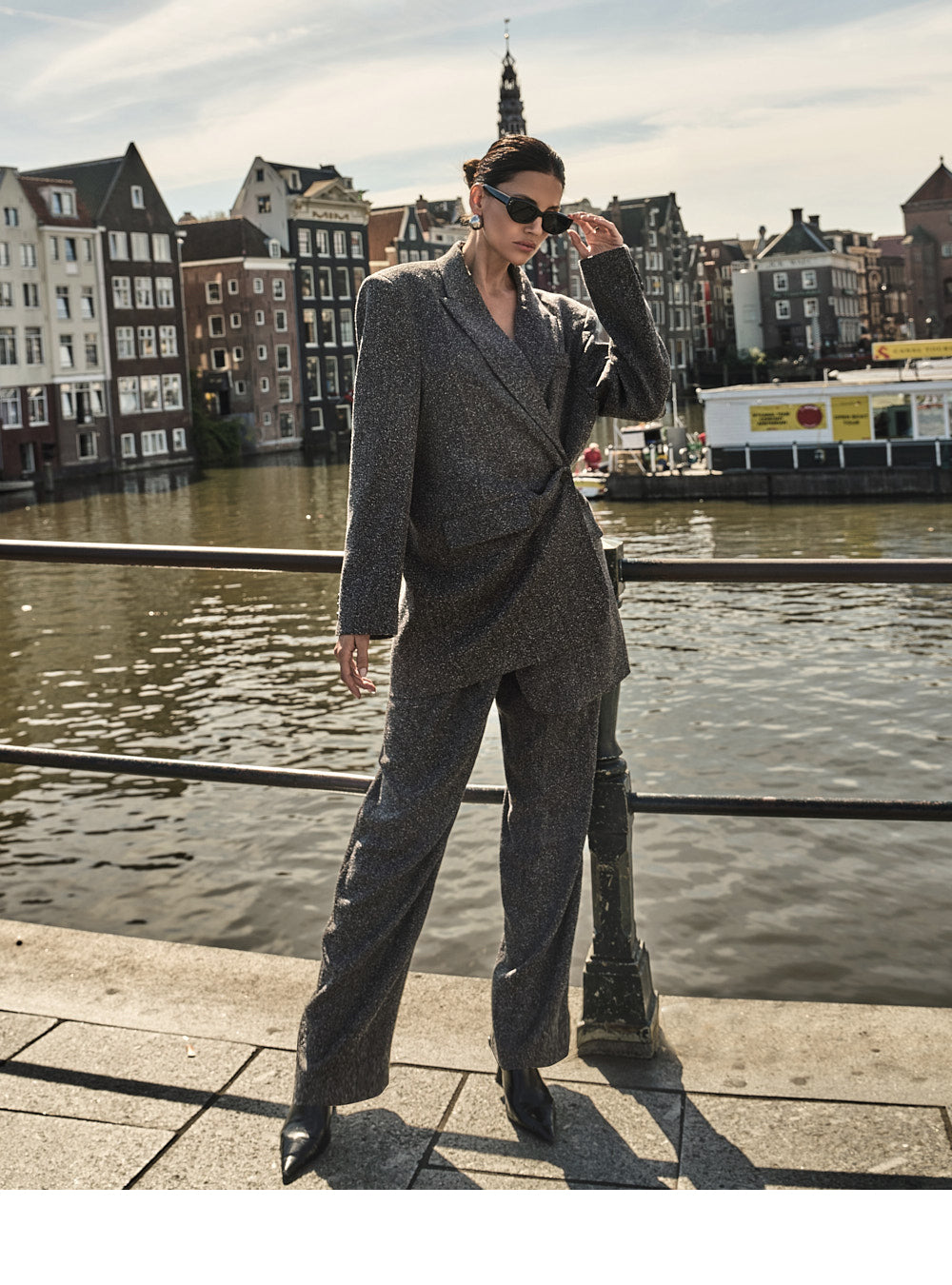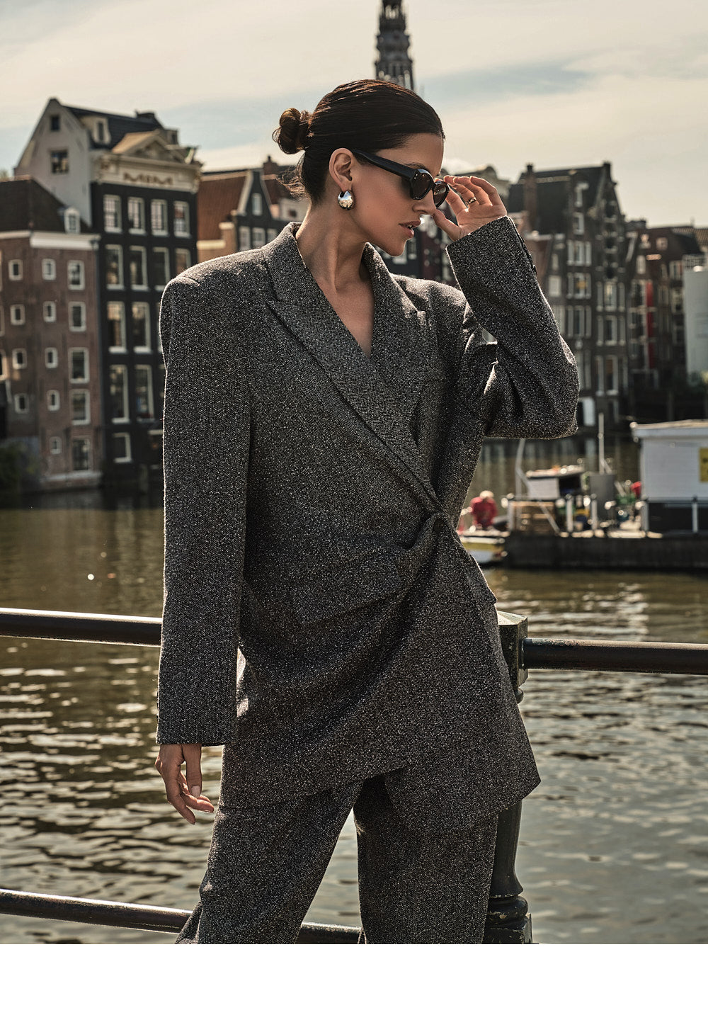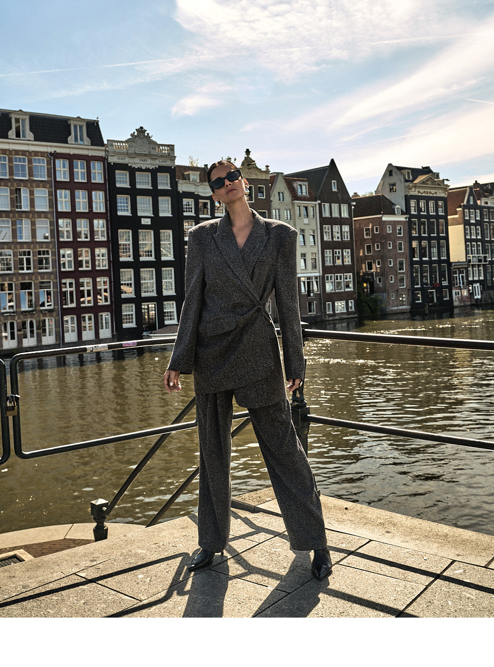 Model is 174cm tall and wears size ONE jacket and size S slacks.