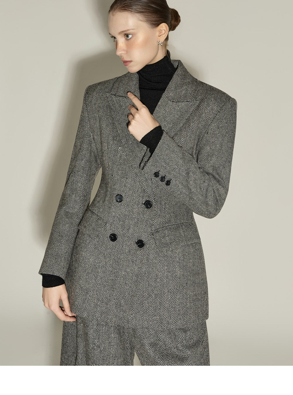 The jacket features a tailored collar and slim-fit silhouette with a defined waistline,