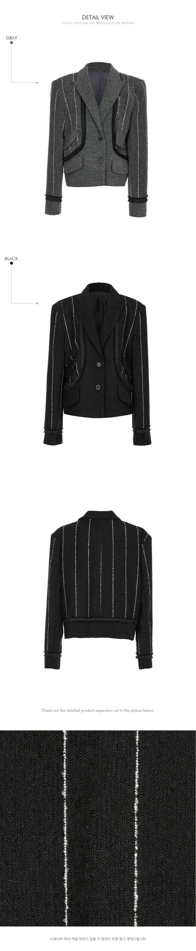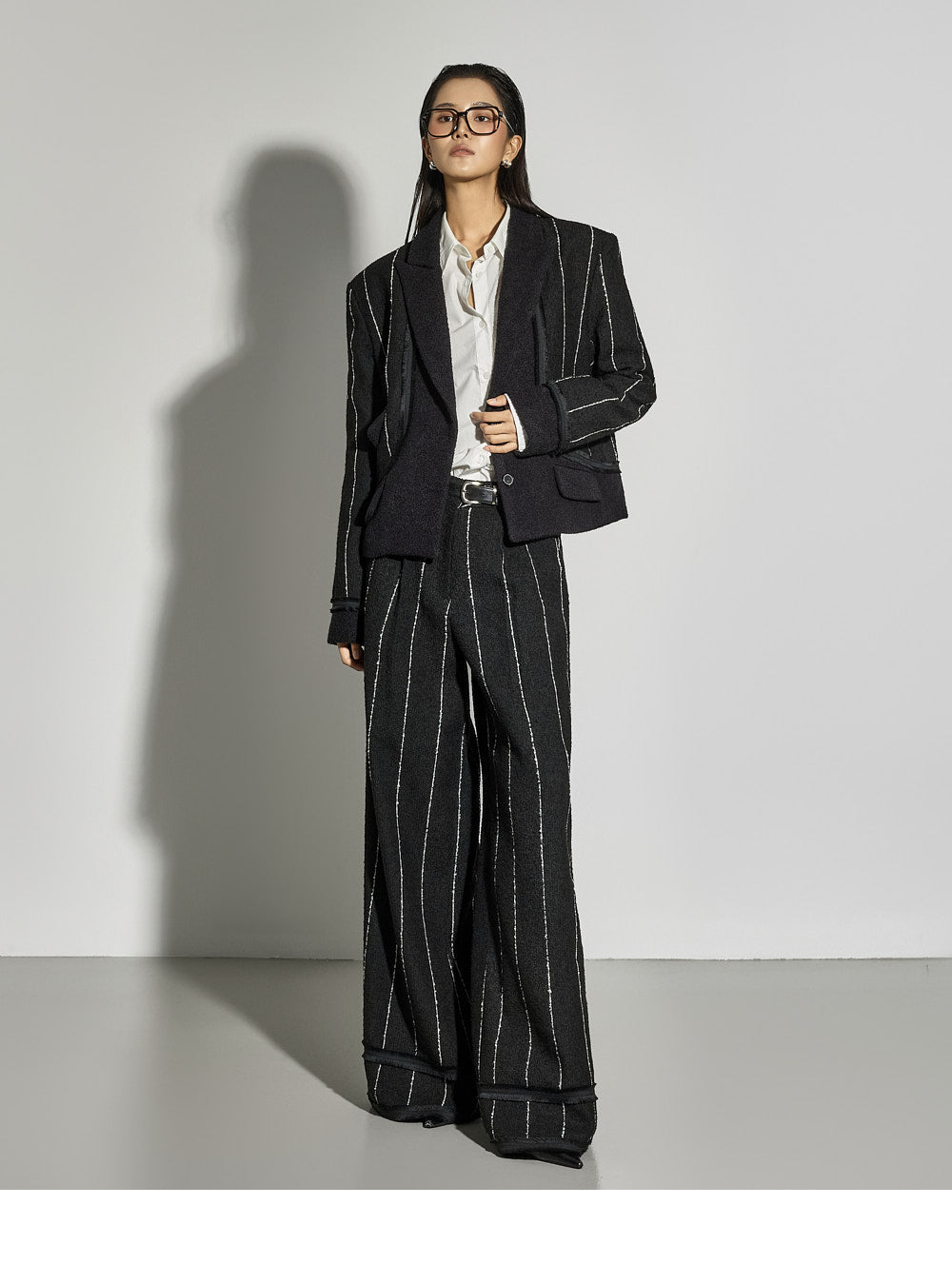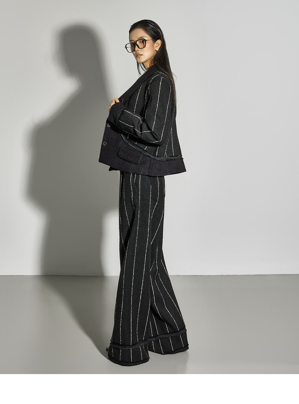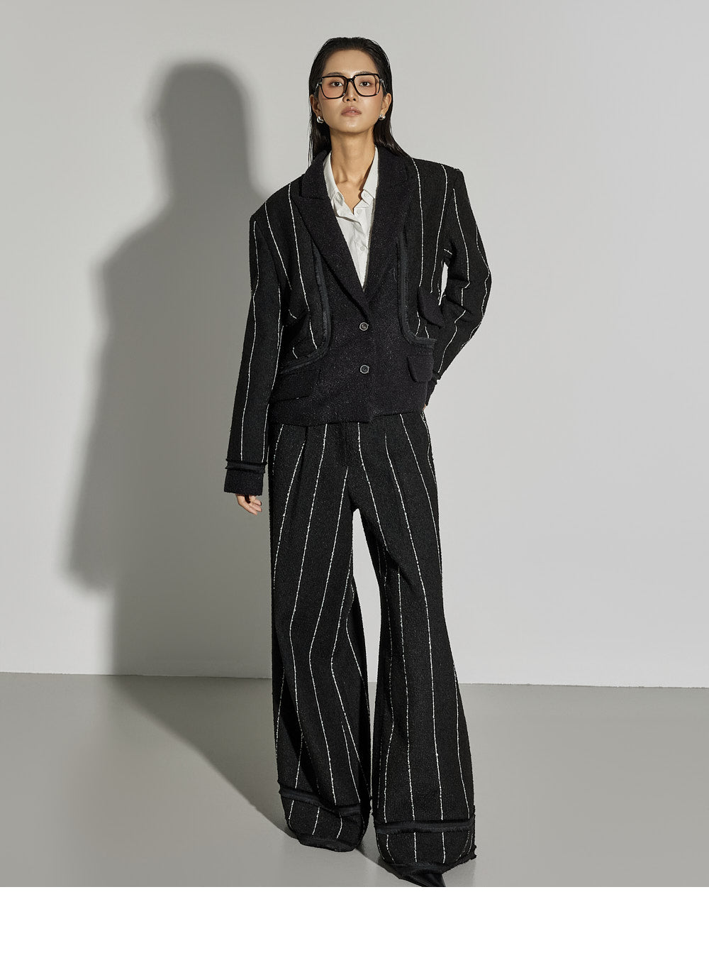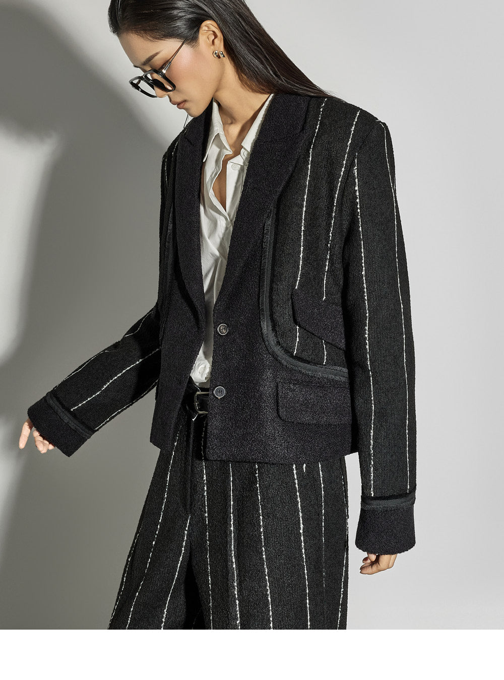 The cropped jacket features a tailored collar and