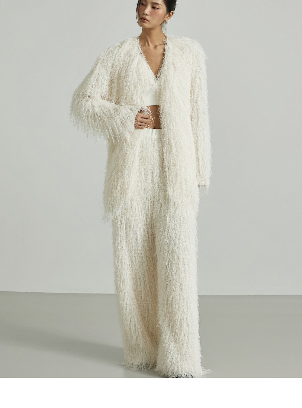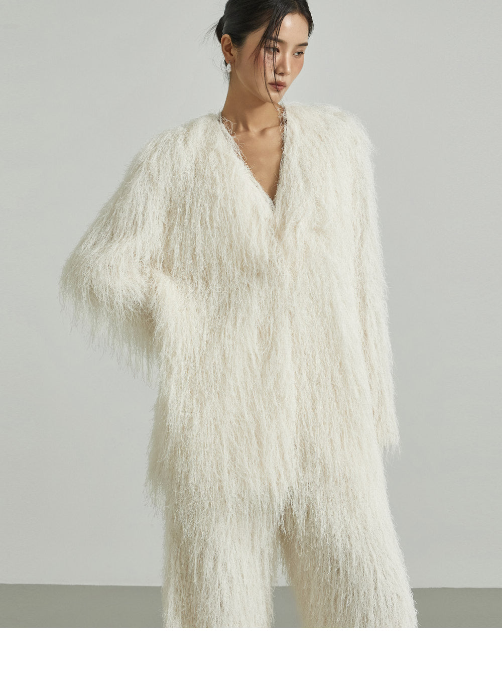 The jacket features a no-collar design and a naturally flowing, fluid silhouette.