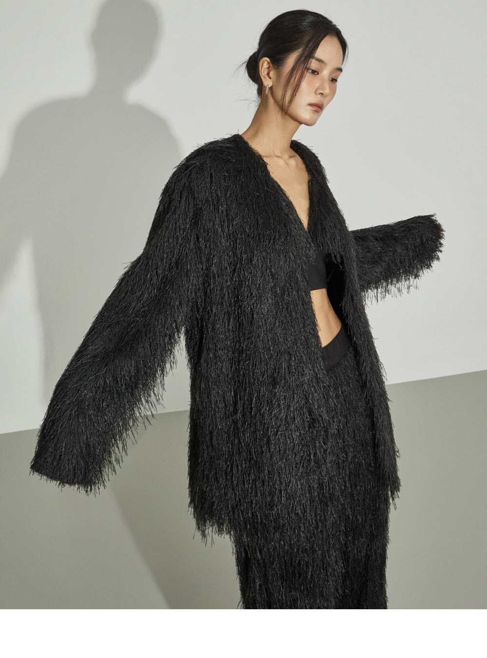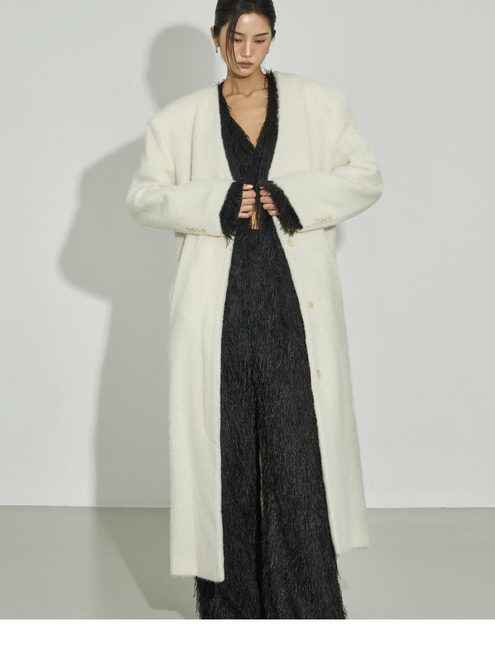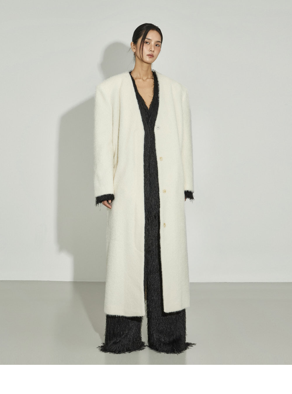 The jacket features a no-collar design and a naturally flowing, fluid silhouette.