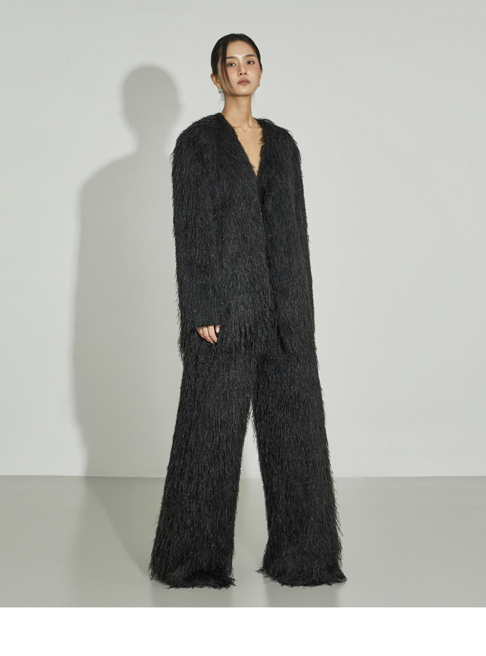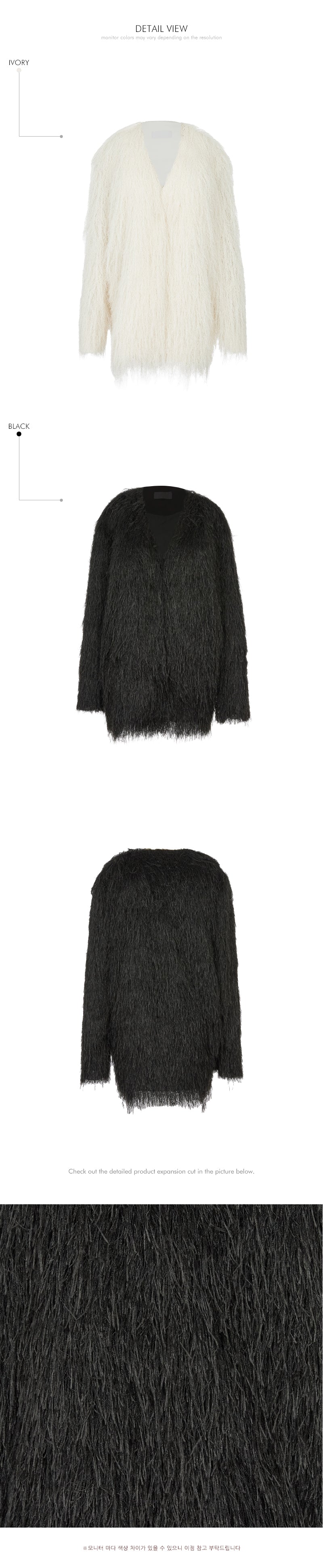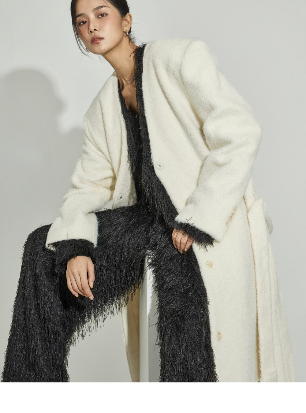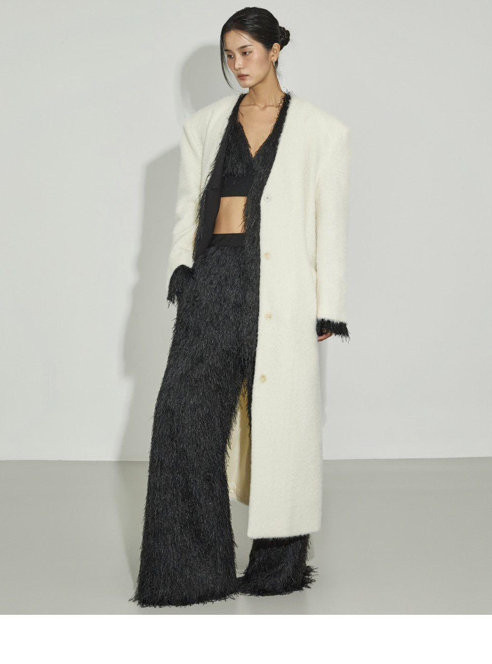 The jacket features a no-collar design and a naturally flowing, fluid silhouette.