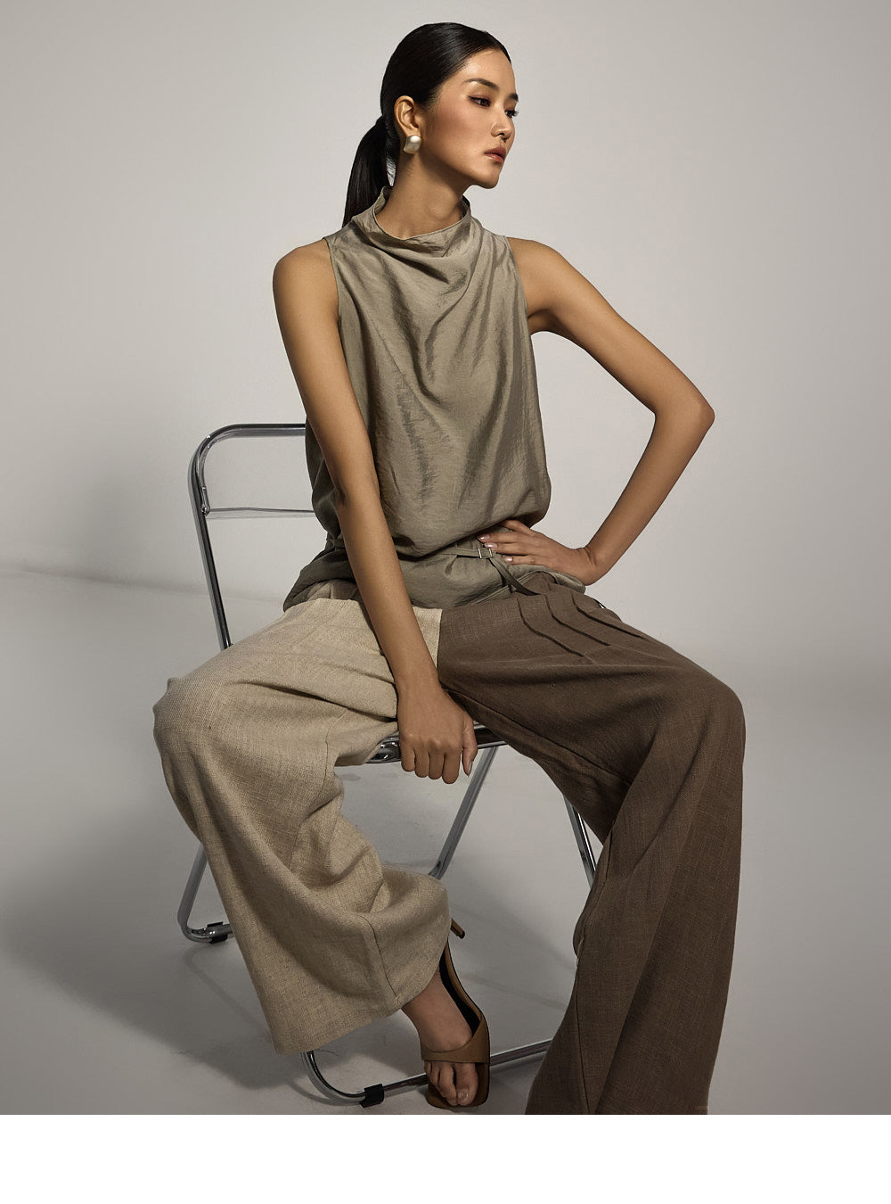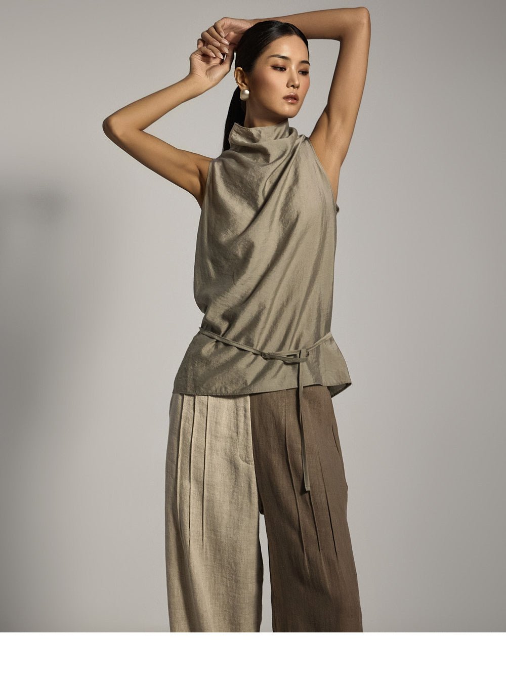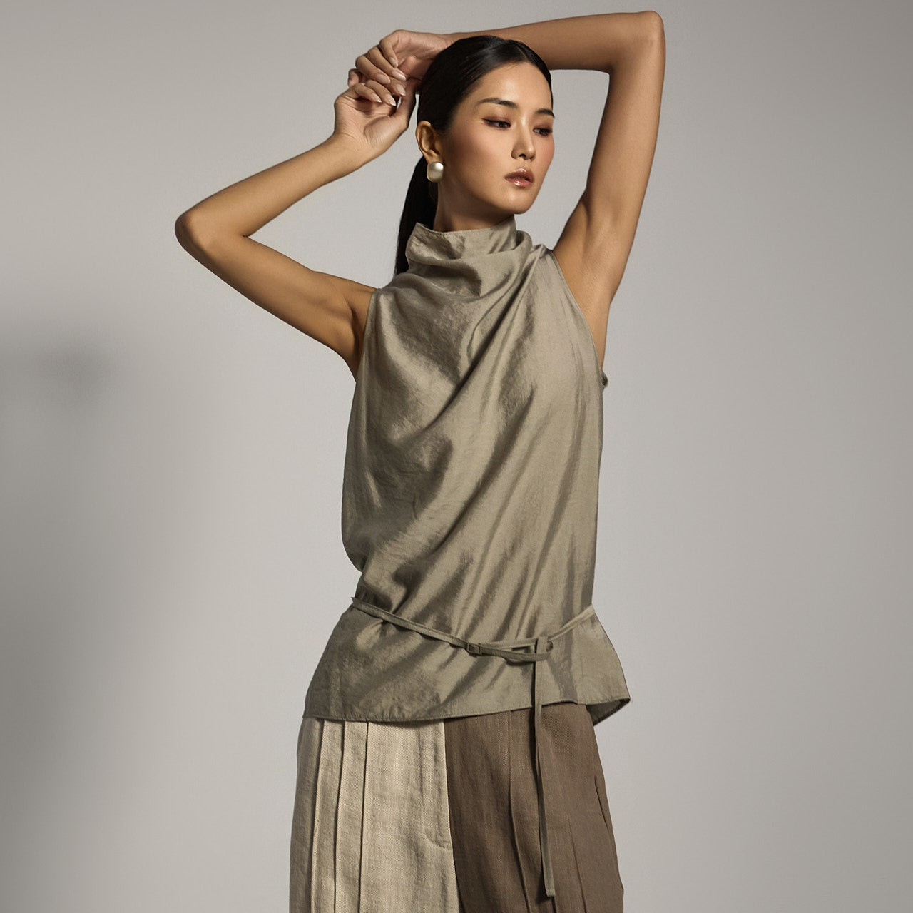 无袖设计搭配褶皱领口,带来微妙的触感,