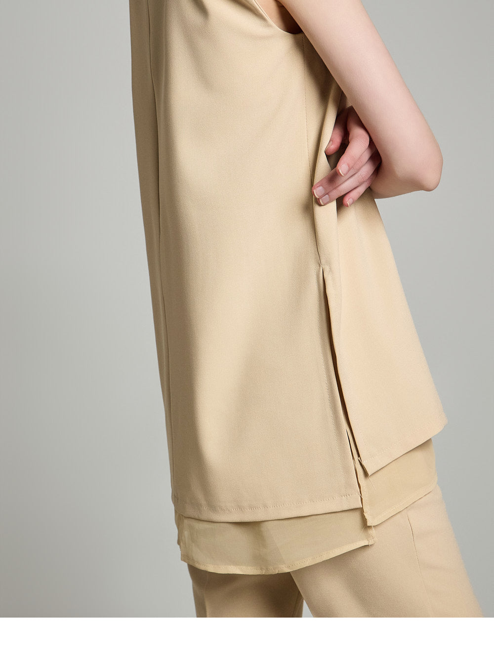 不对称的下摆和侧开衩营造出优雅、
