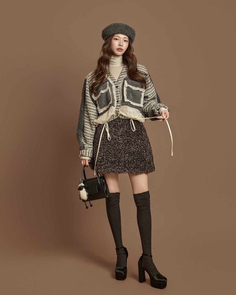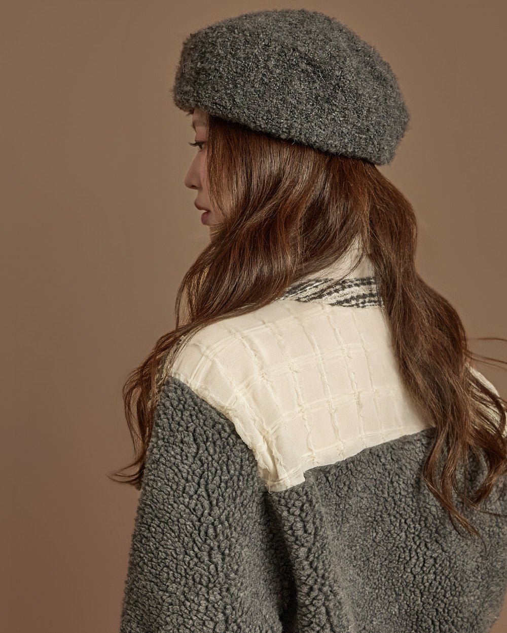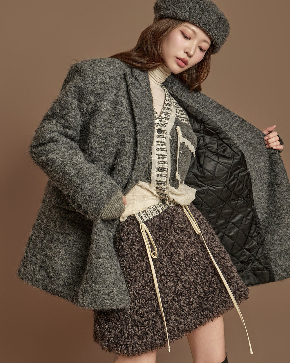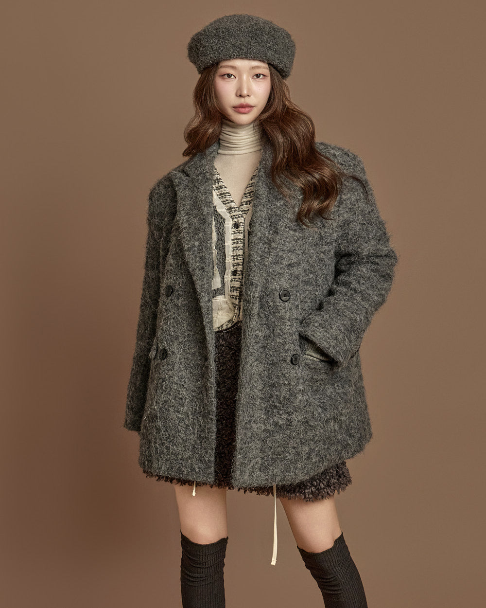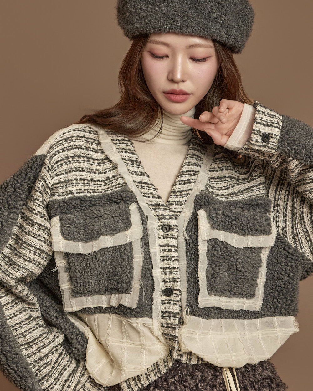 The textures combine bouclé, knit, and fabric,