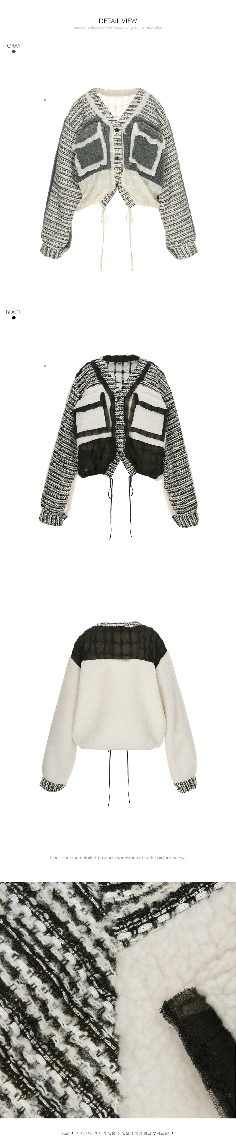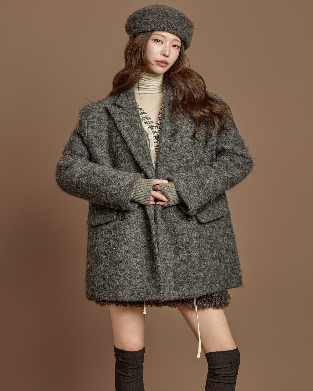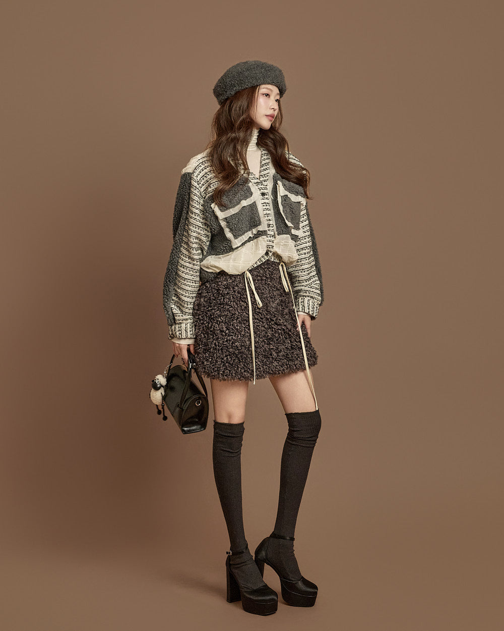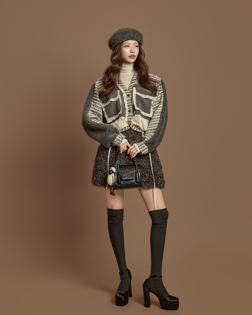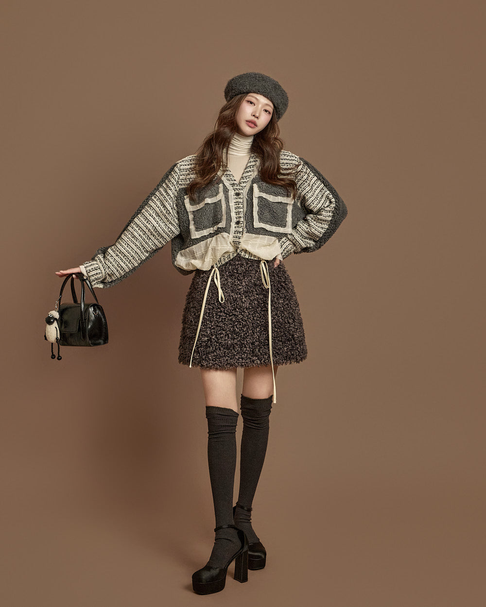 The textures combine bouclé, knit, and fabric,