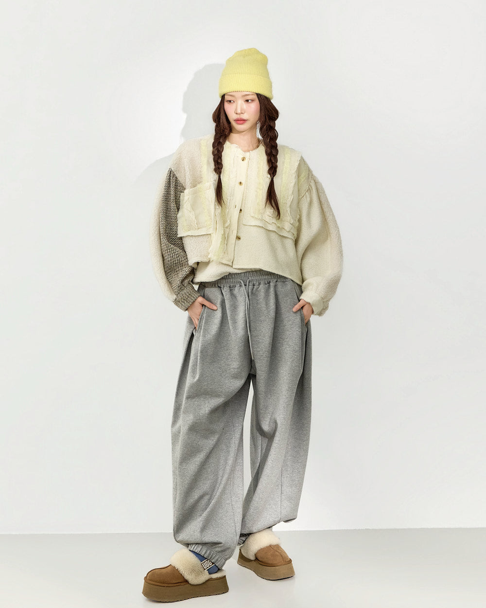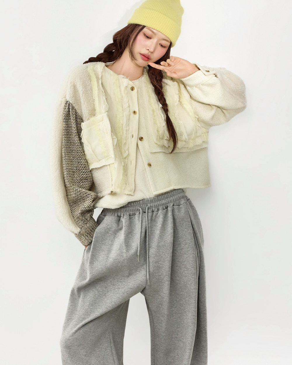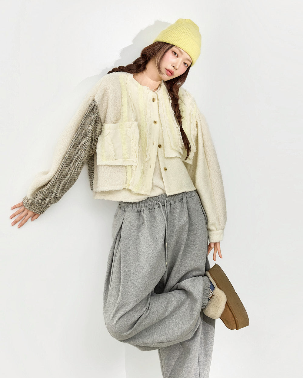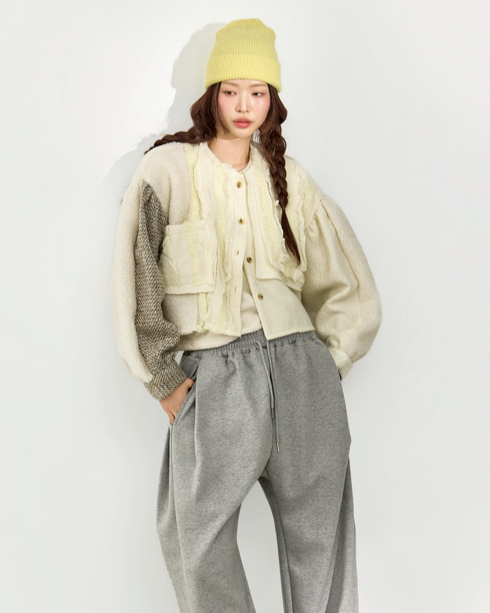 Made from a blend of polyester, wool, acrylic, and nylon,