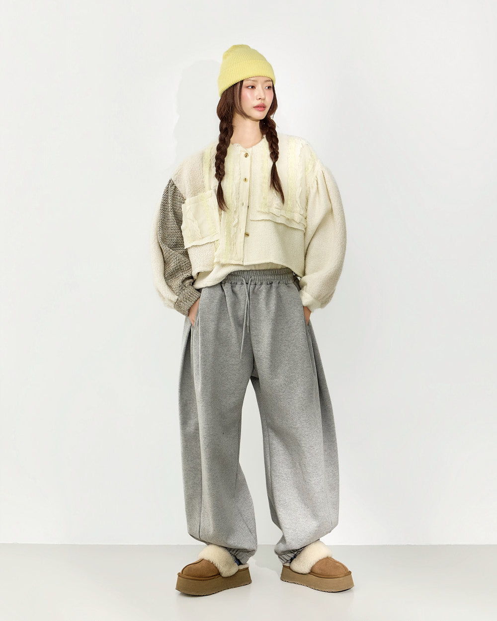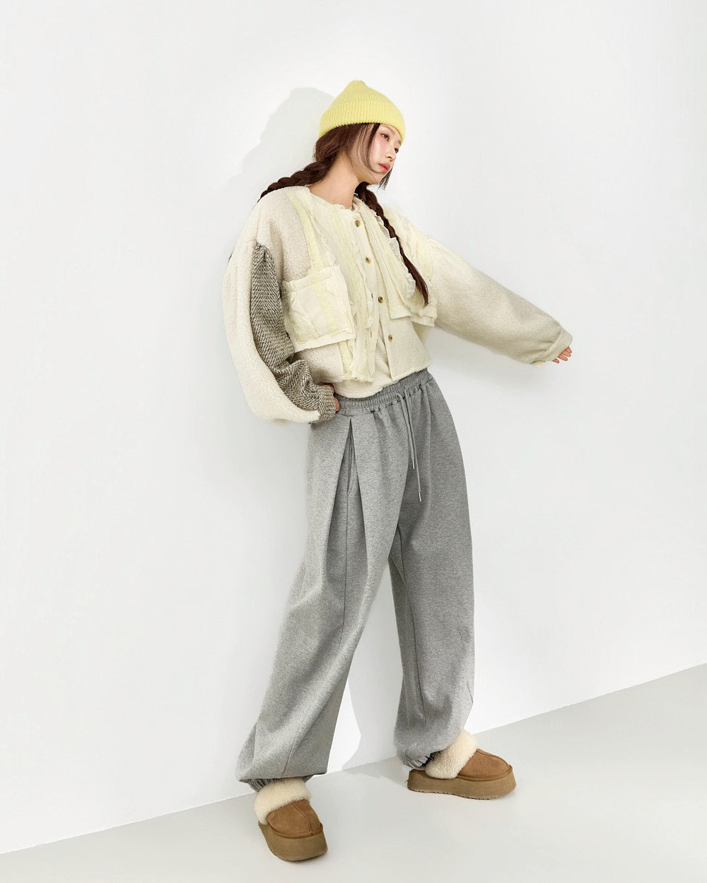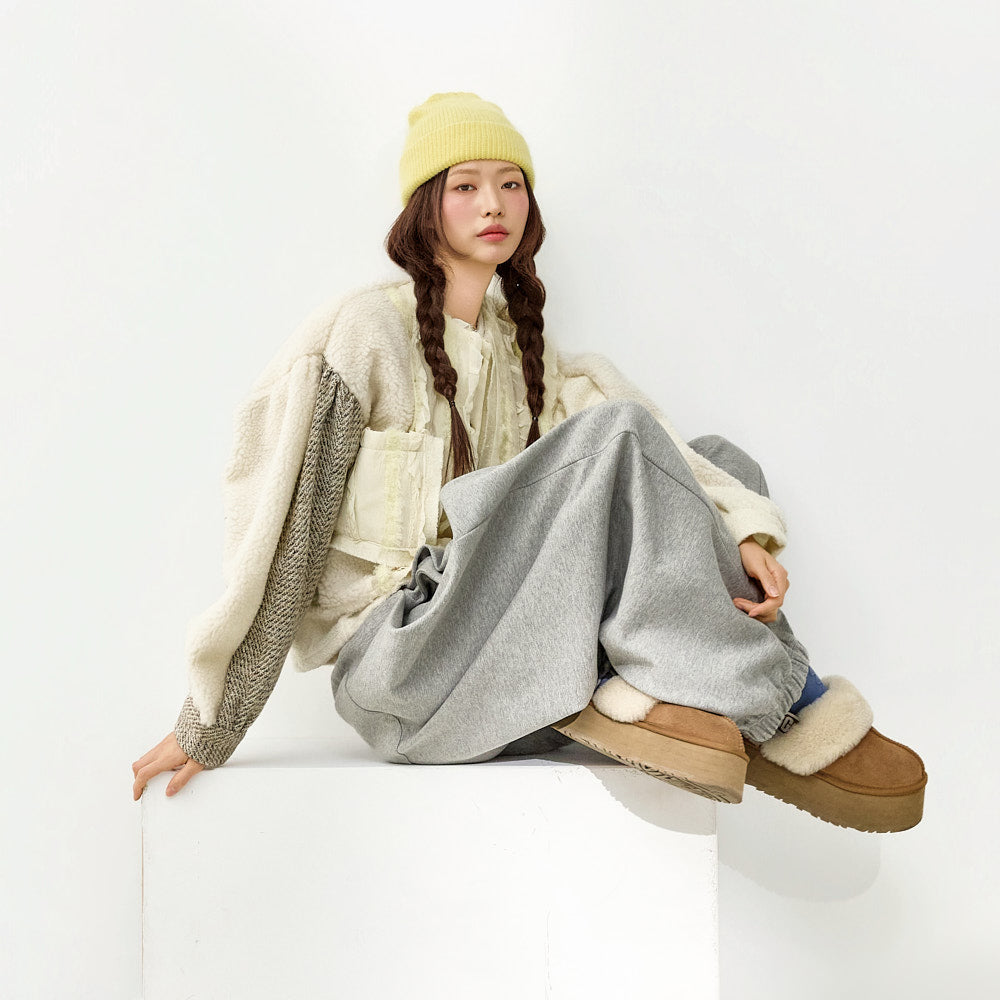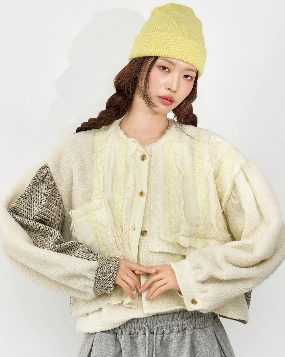 Made from a blend of polyester, wool, acrylic, and nylon,