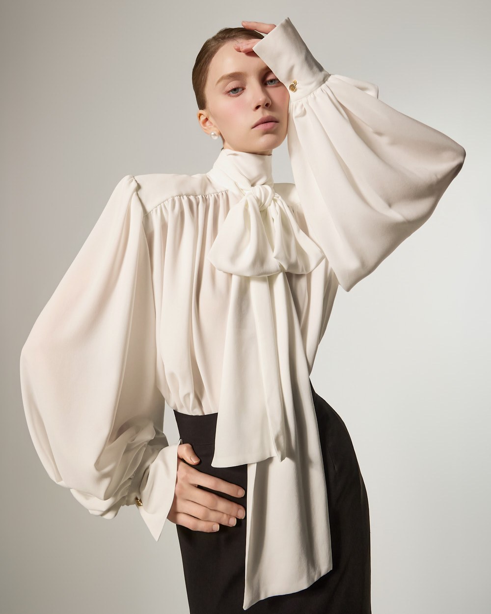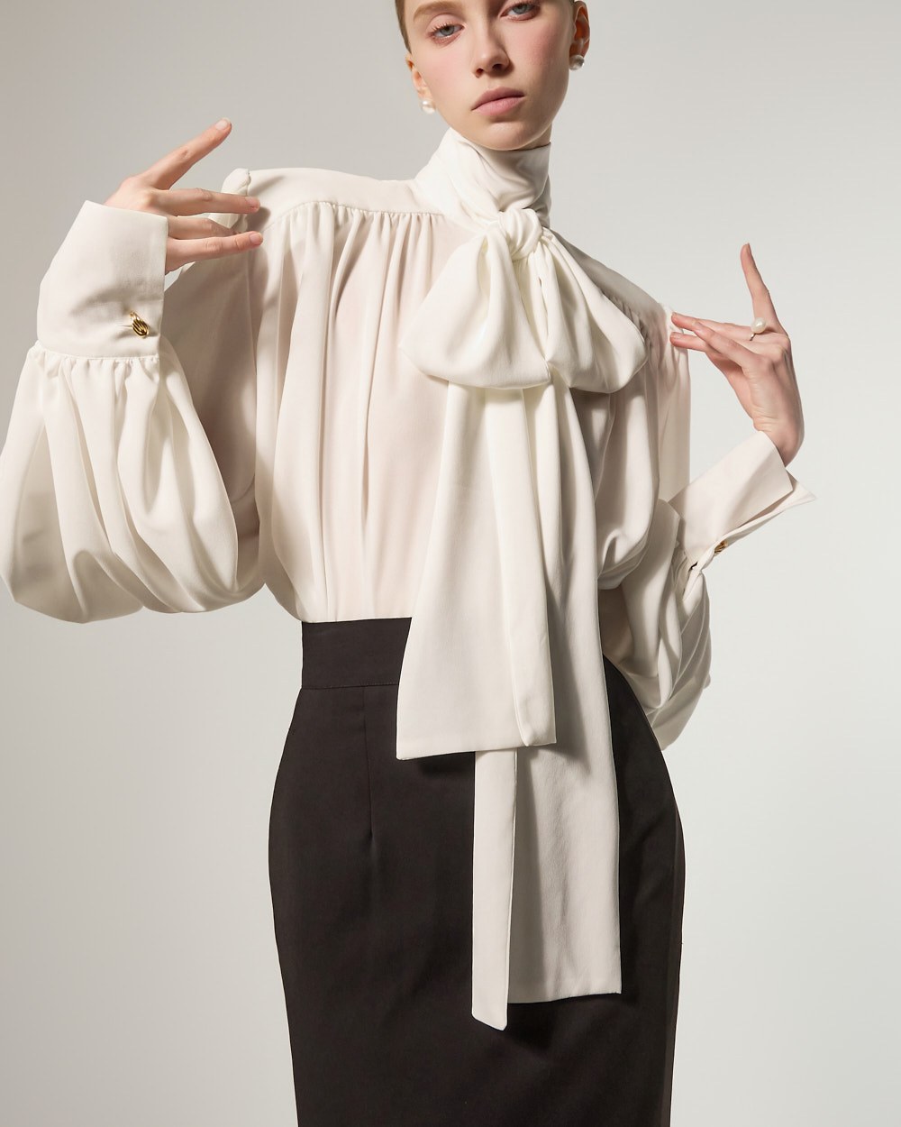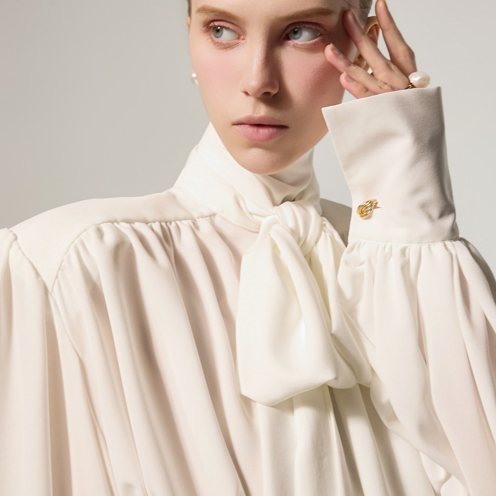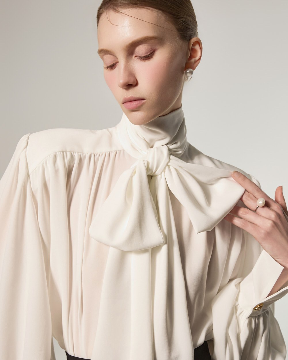 领口的系带设计提供多种造型选择——可系成蝴蝶结或任其垂坠——微妙的透视感增添了一丝精致。