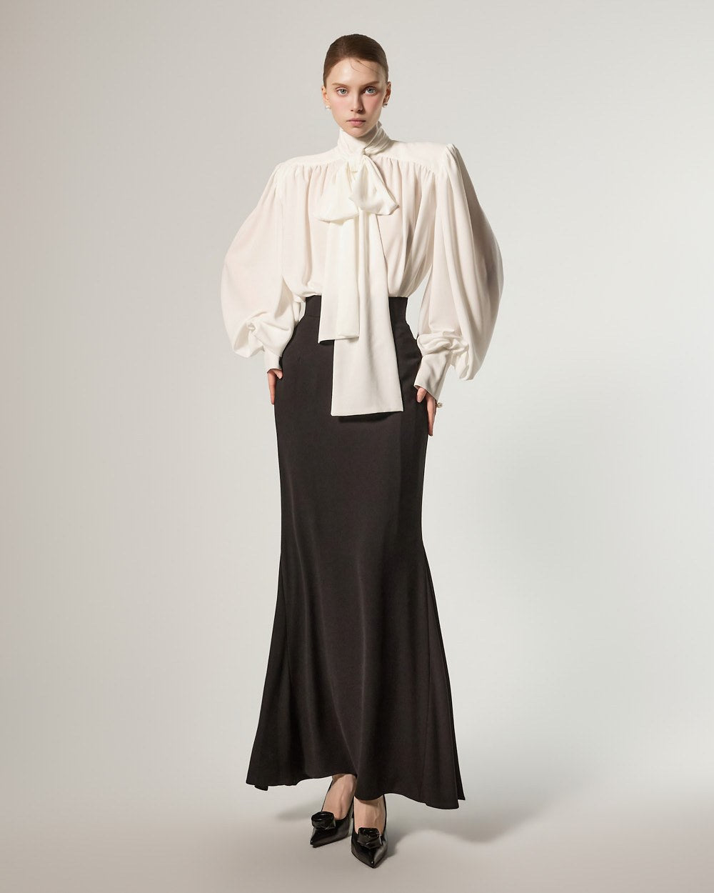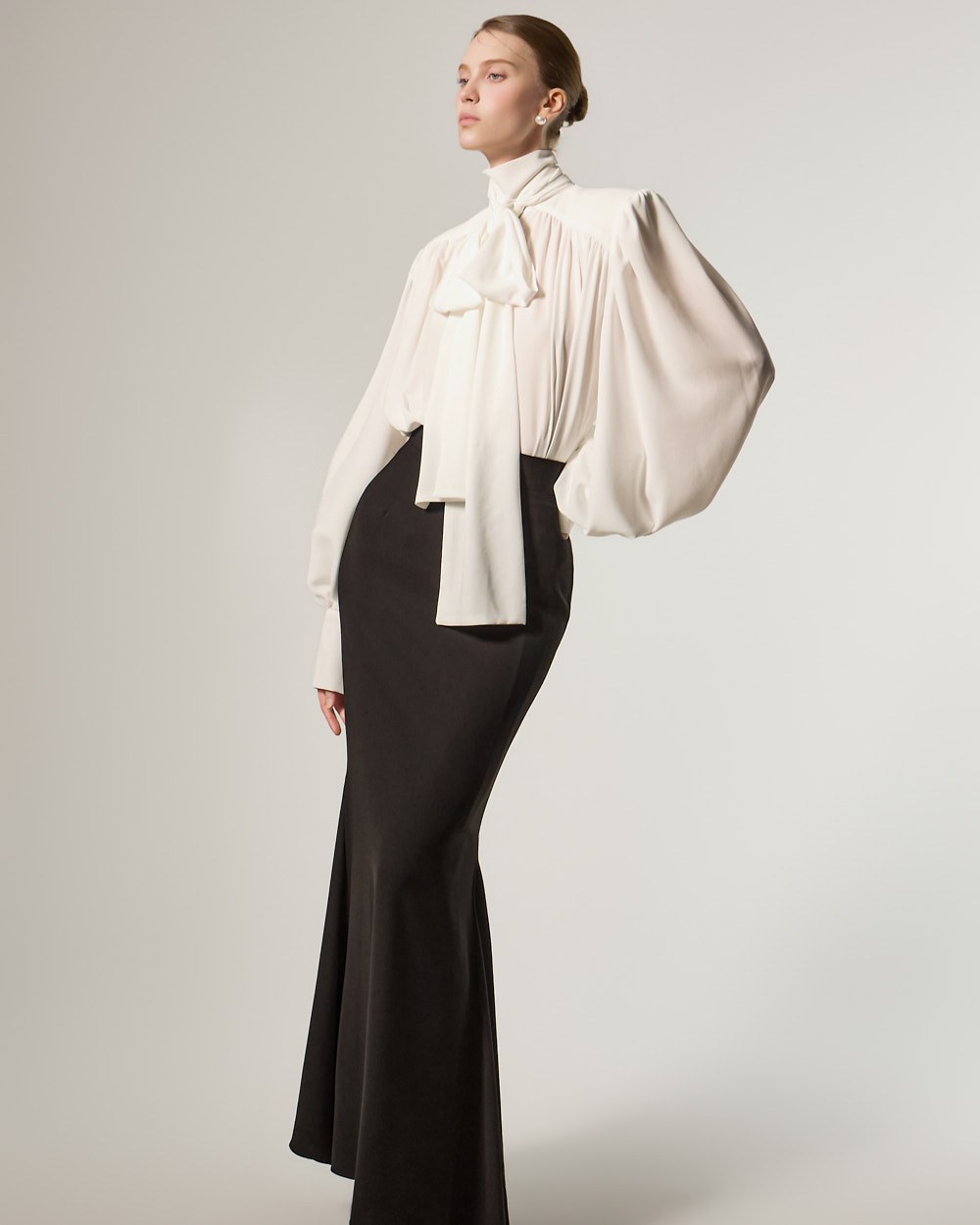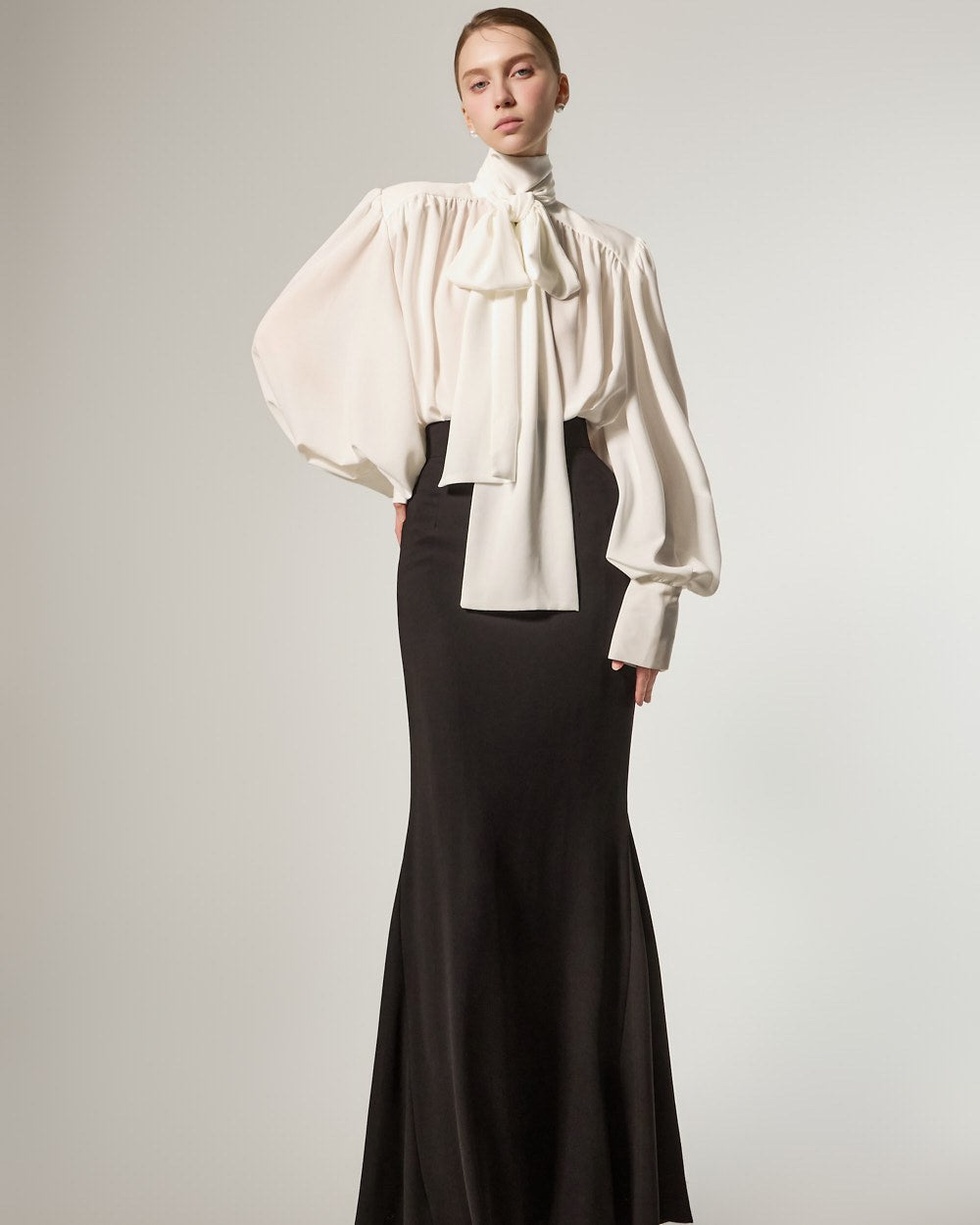 领口的系带设计提供多种造型选择——可系成蝴蝶结或任其垂坠——微妙的透视感增添了一丝精致。