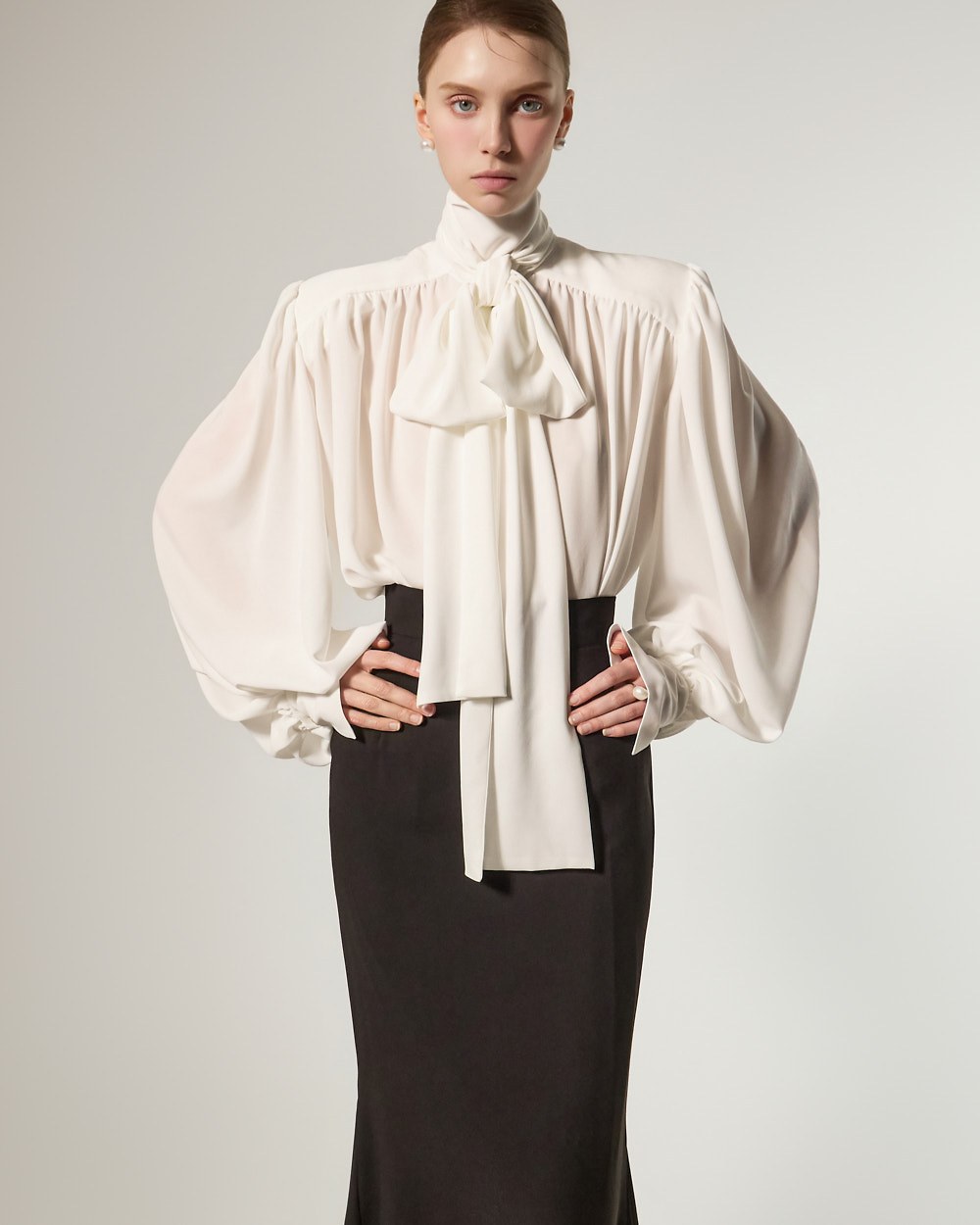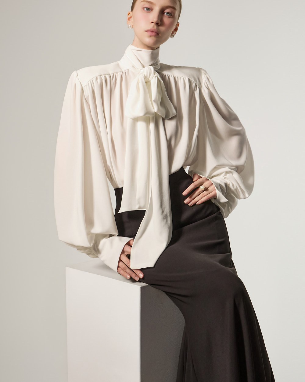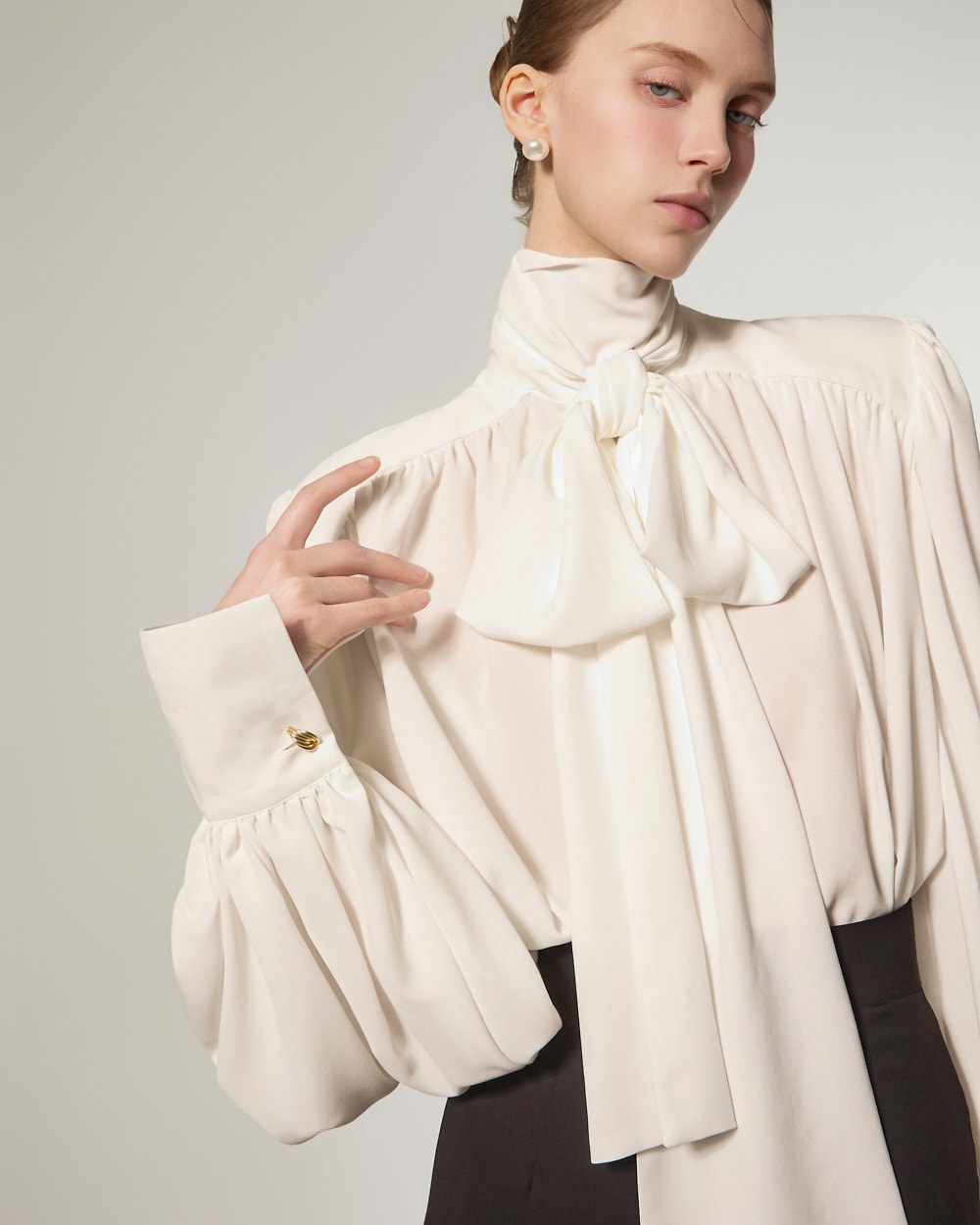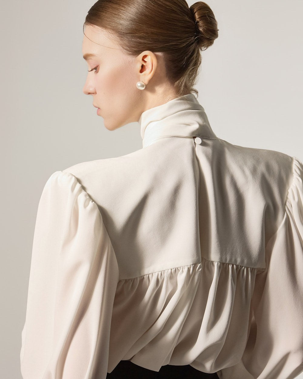 这是一款充满女性气息的高领系带垂坠衬衫。