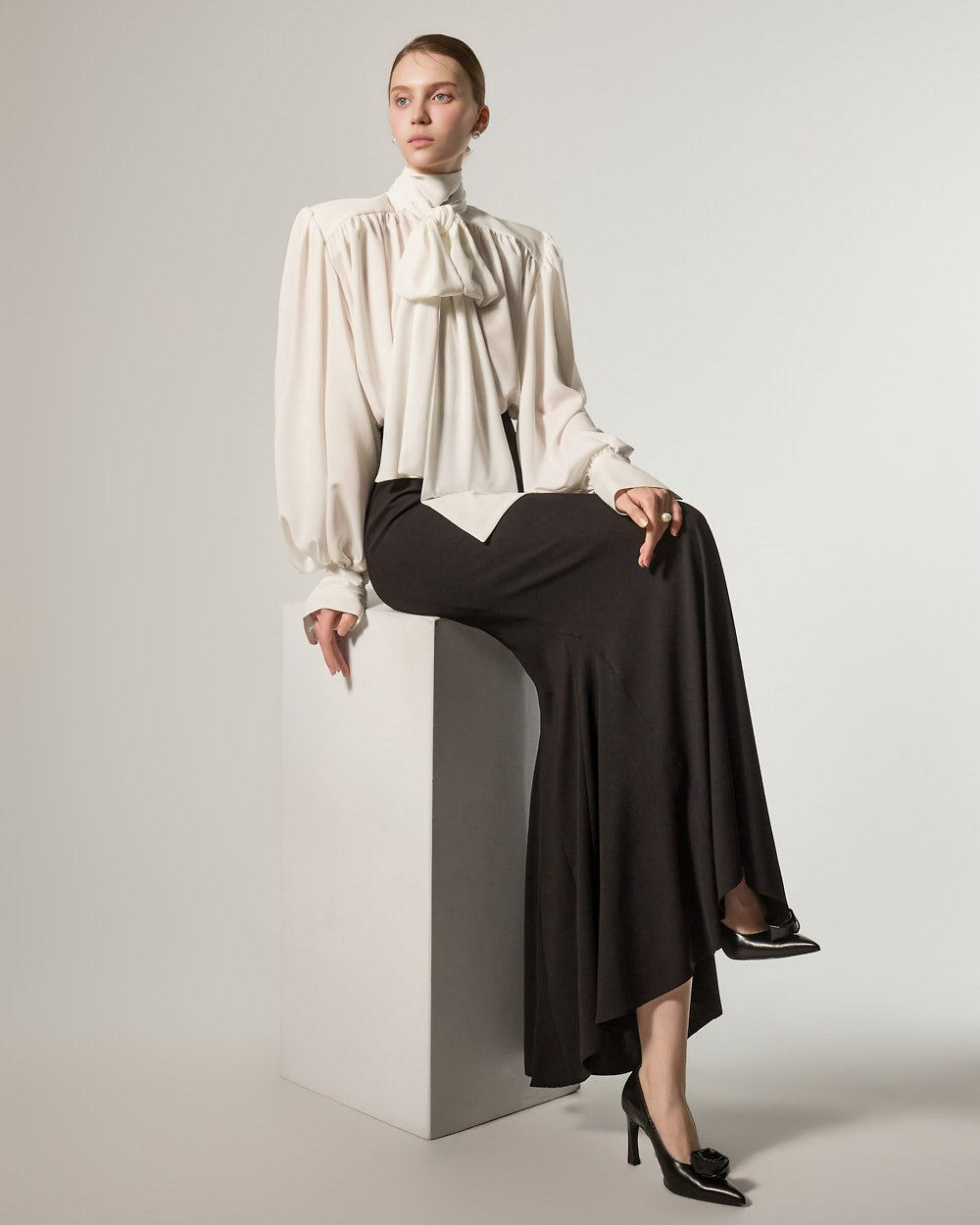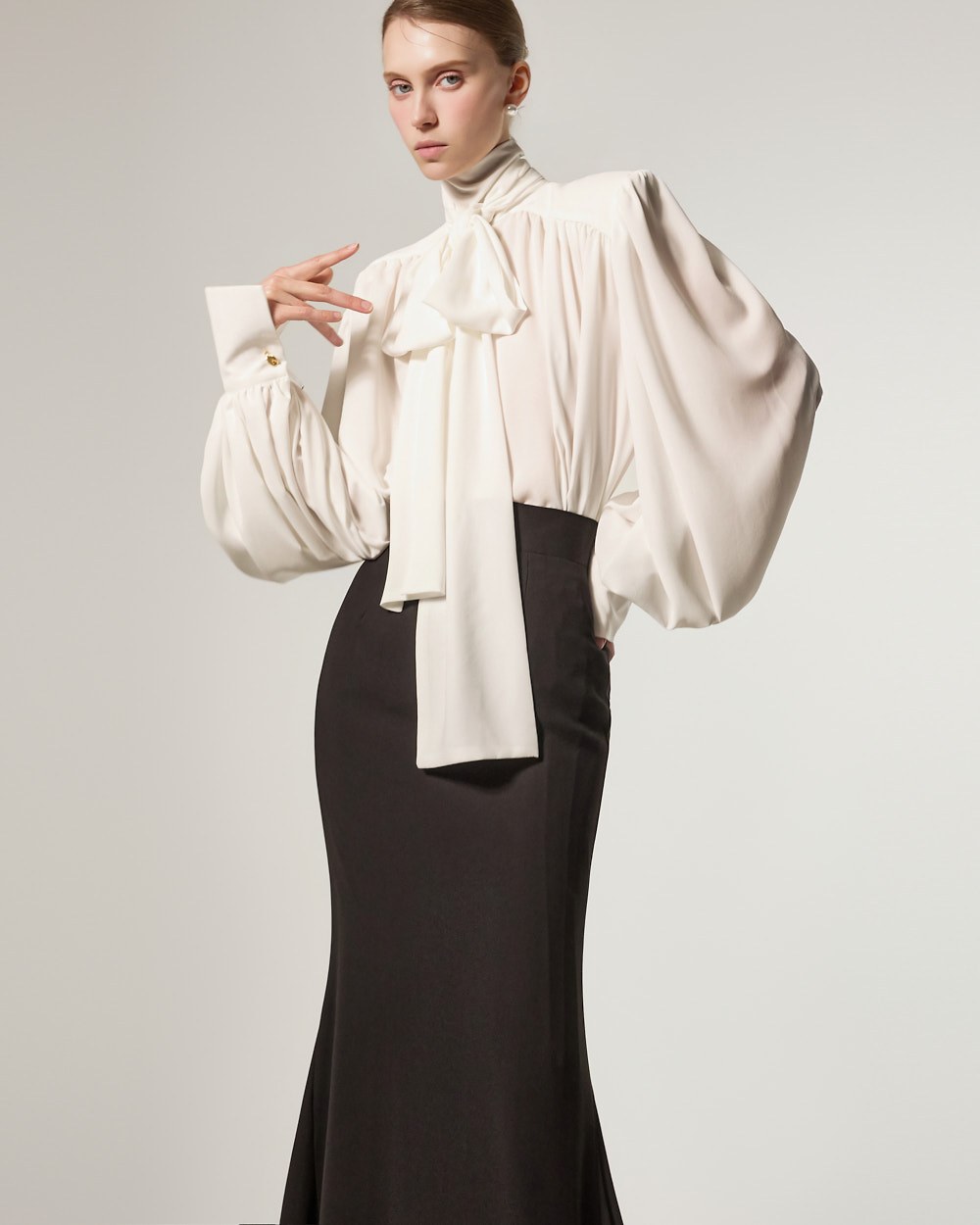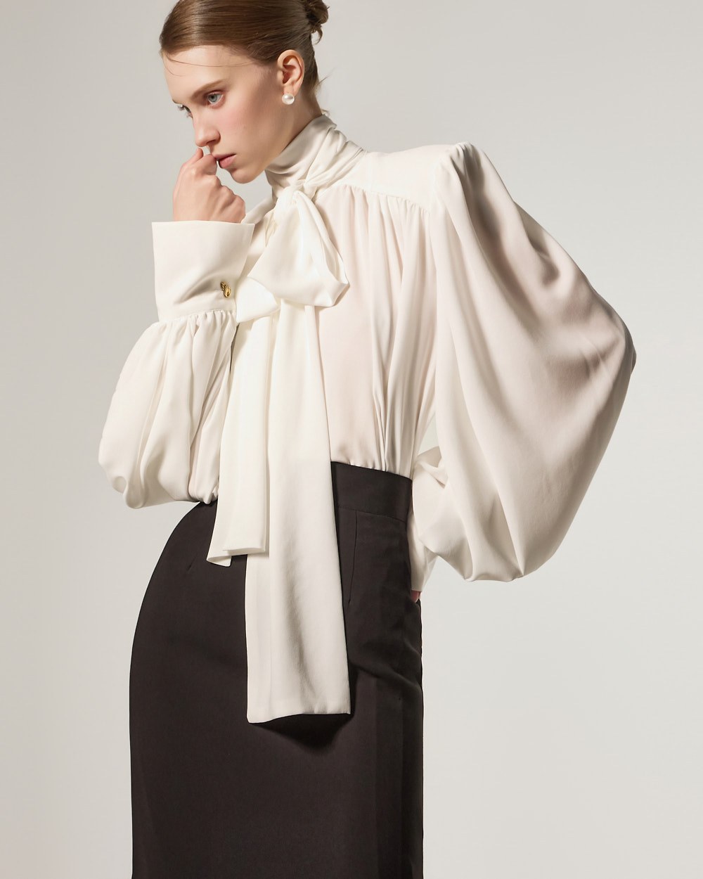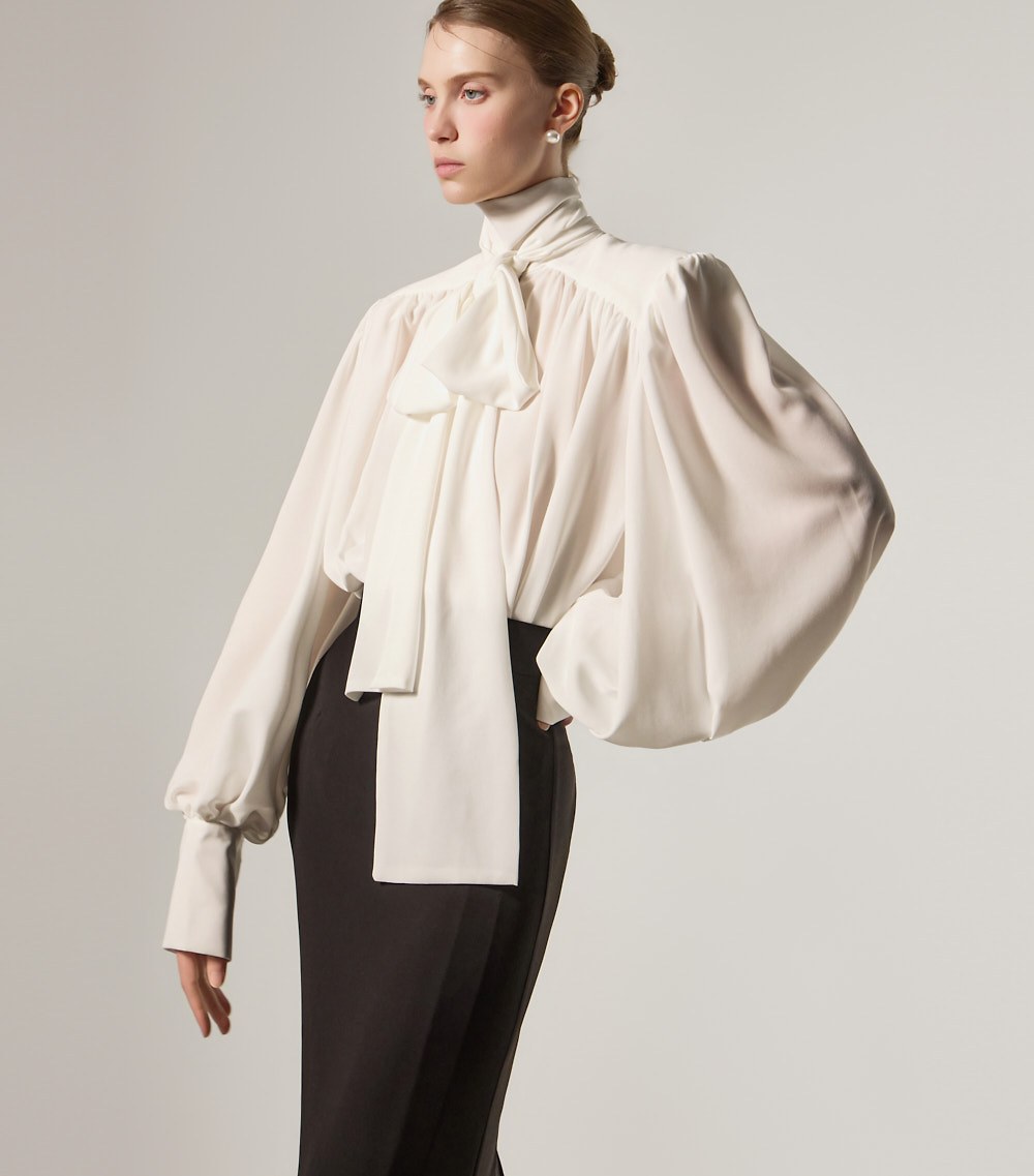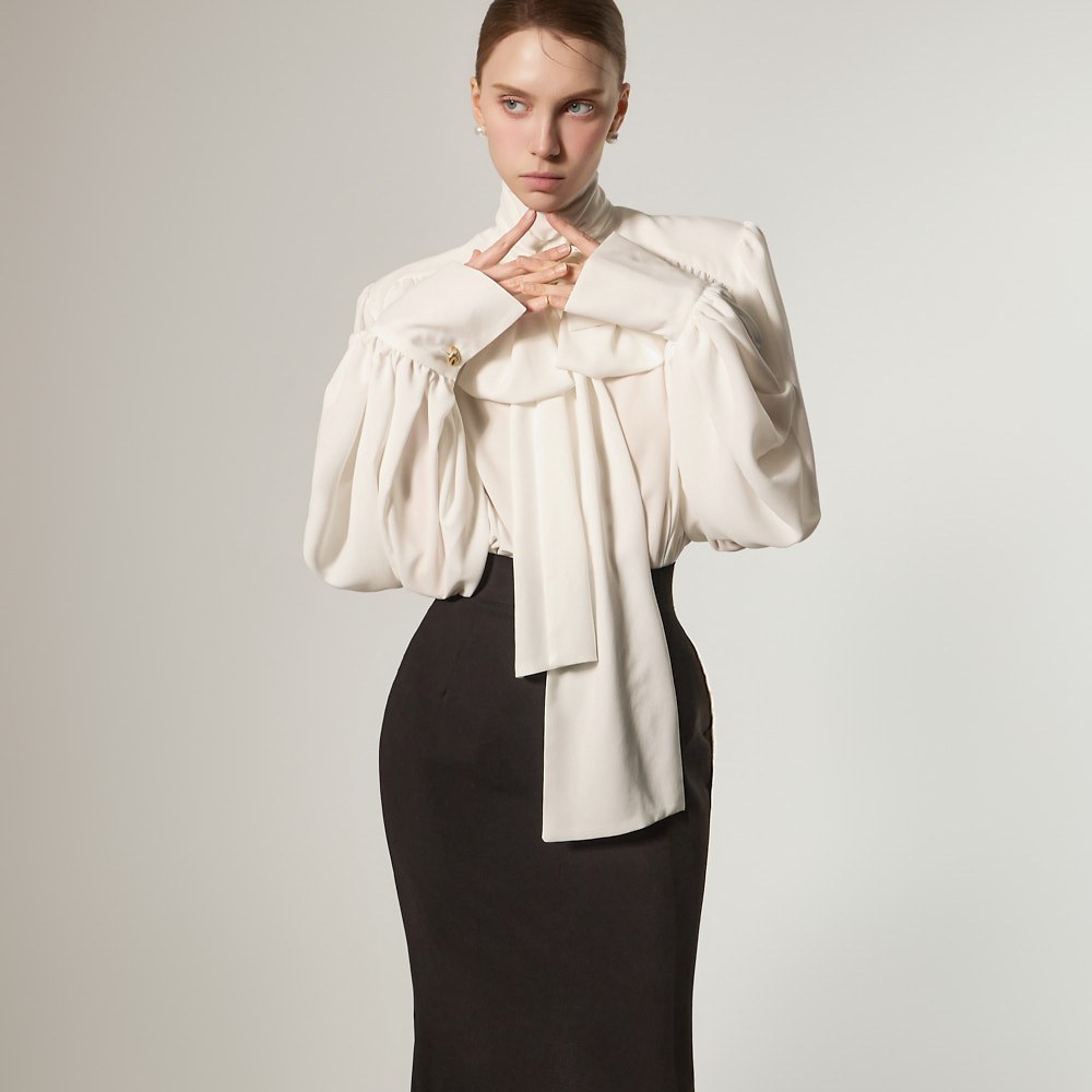 这是一款充满女性气息的高领系带垂坠衬衫。