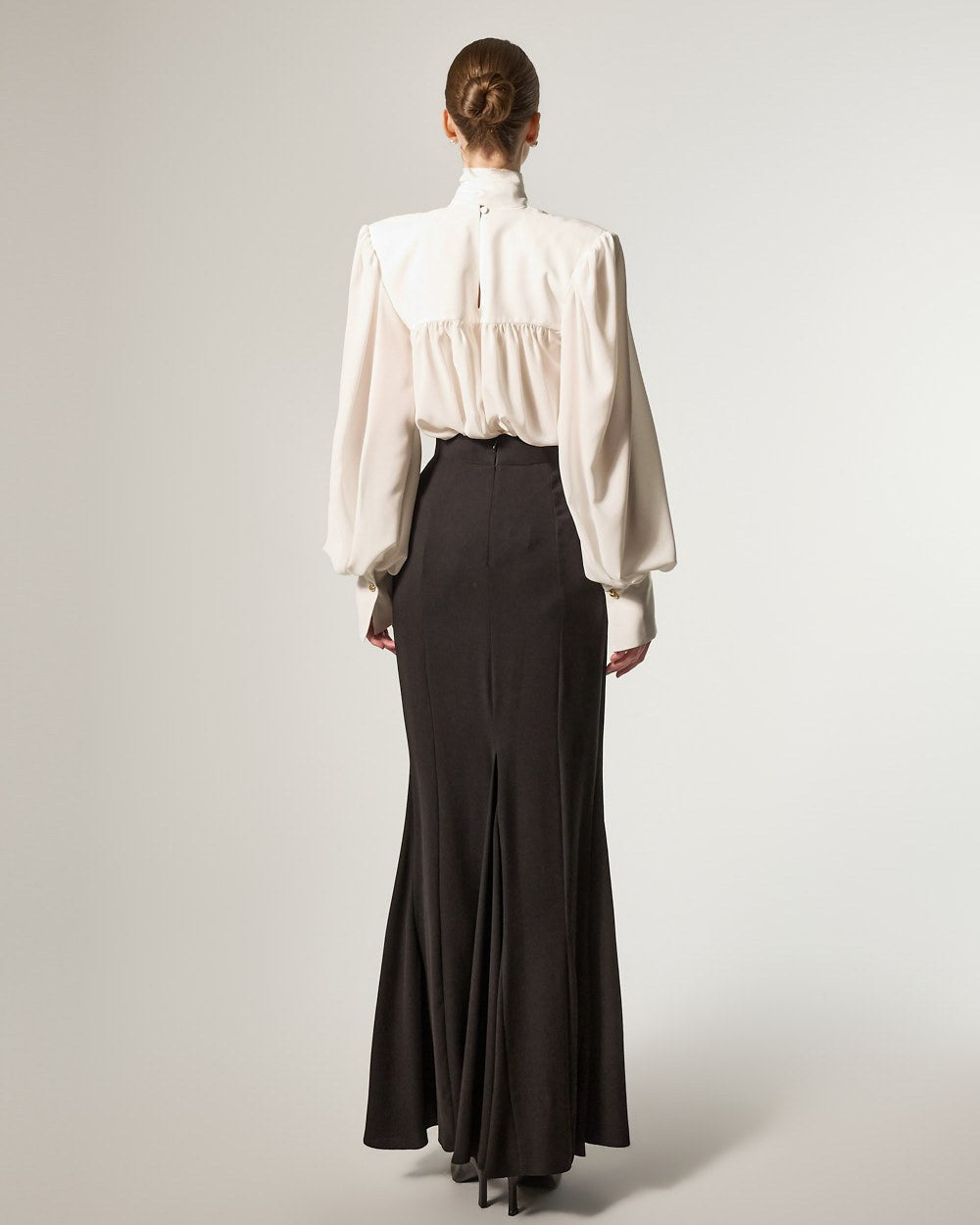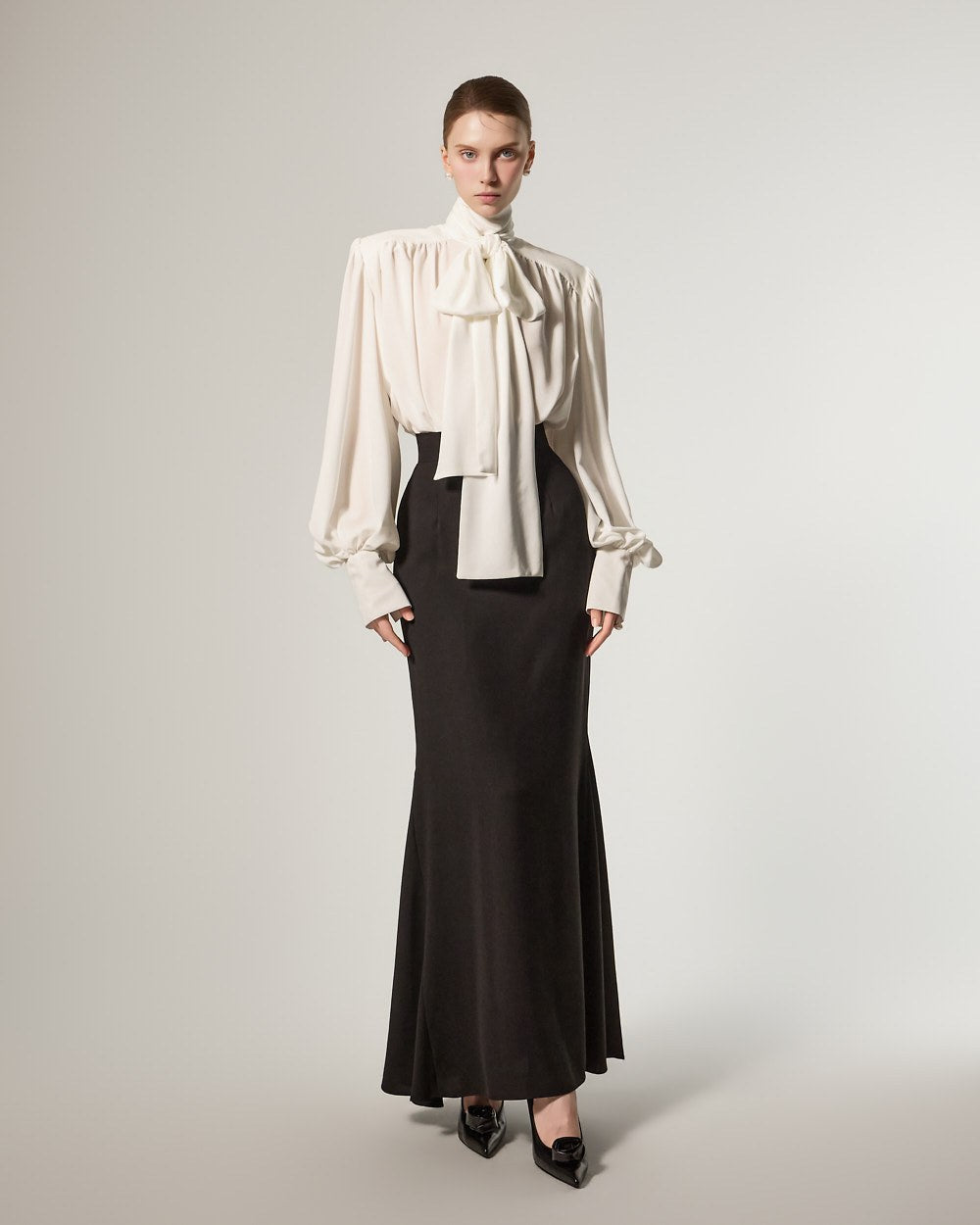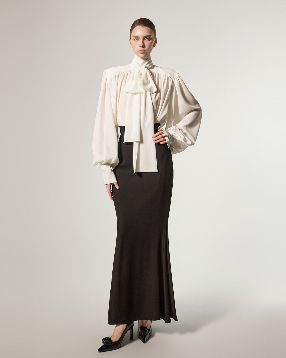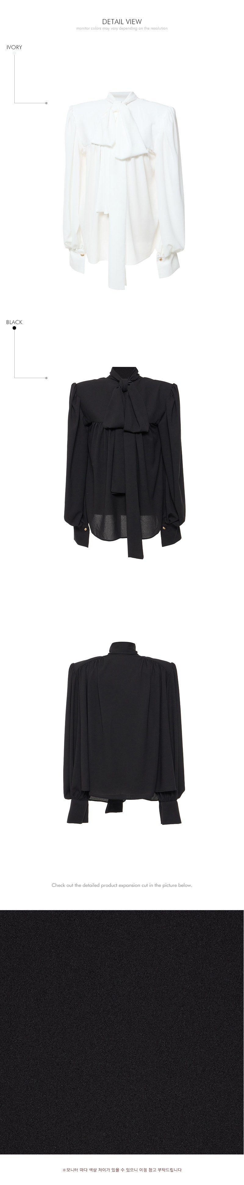 这是一款充满女性气息的高领系带垂坠衬衫。