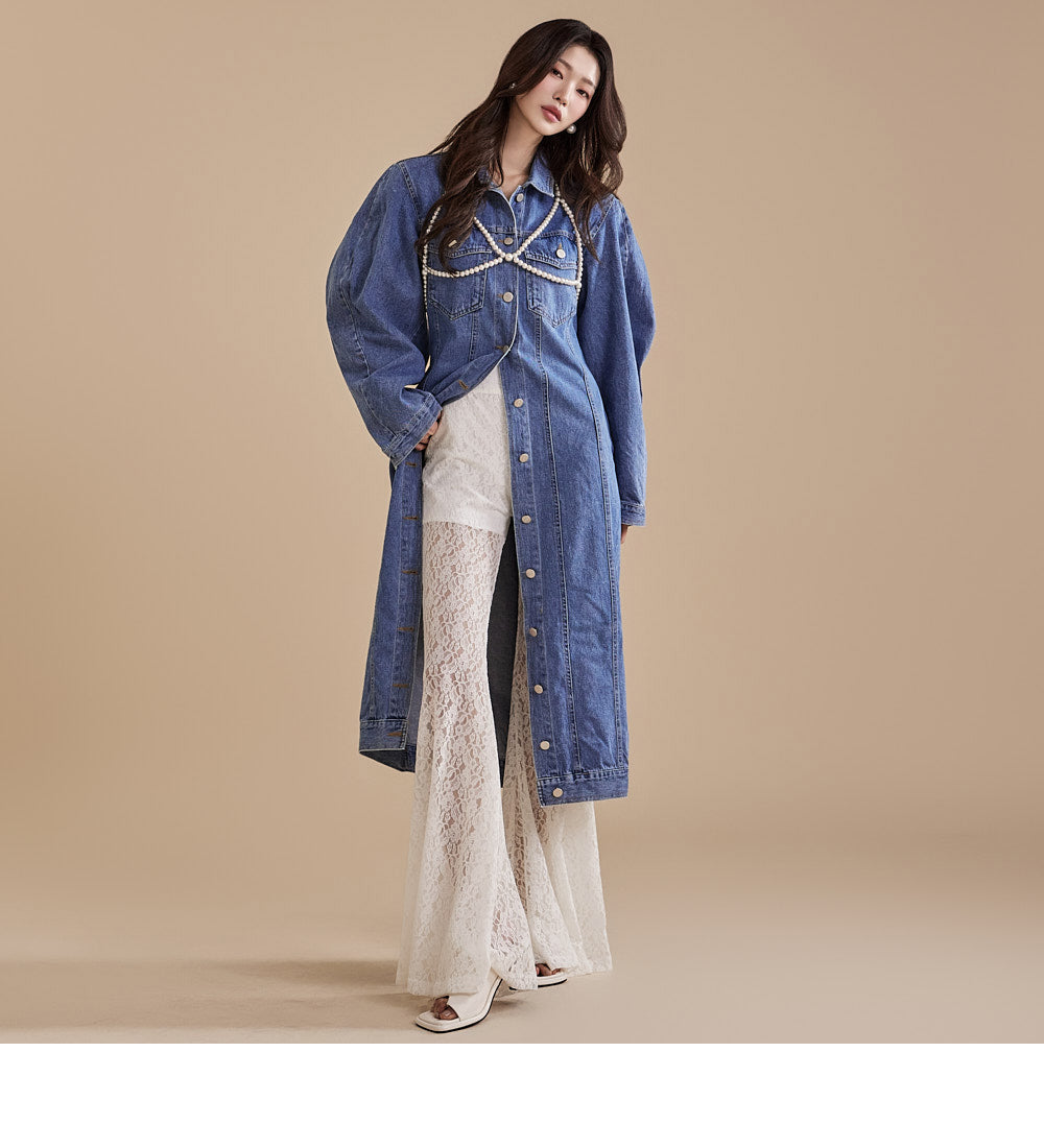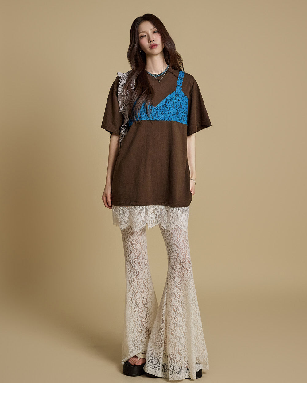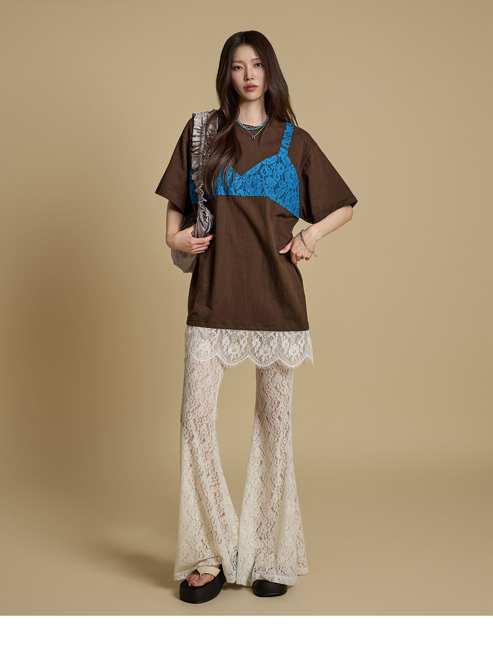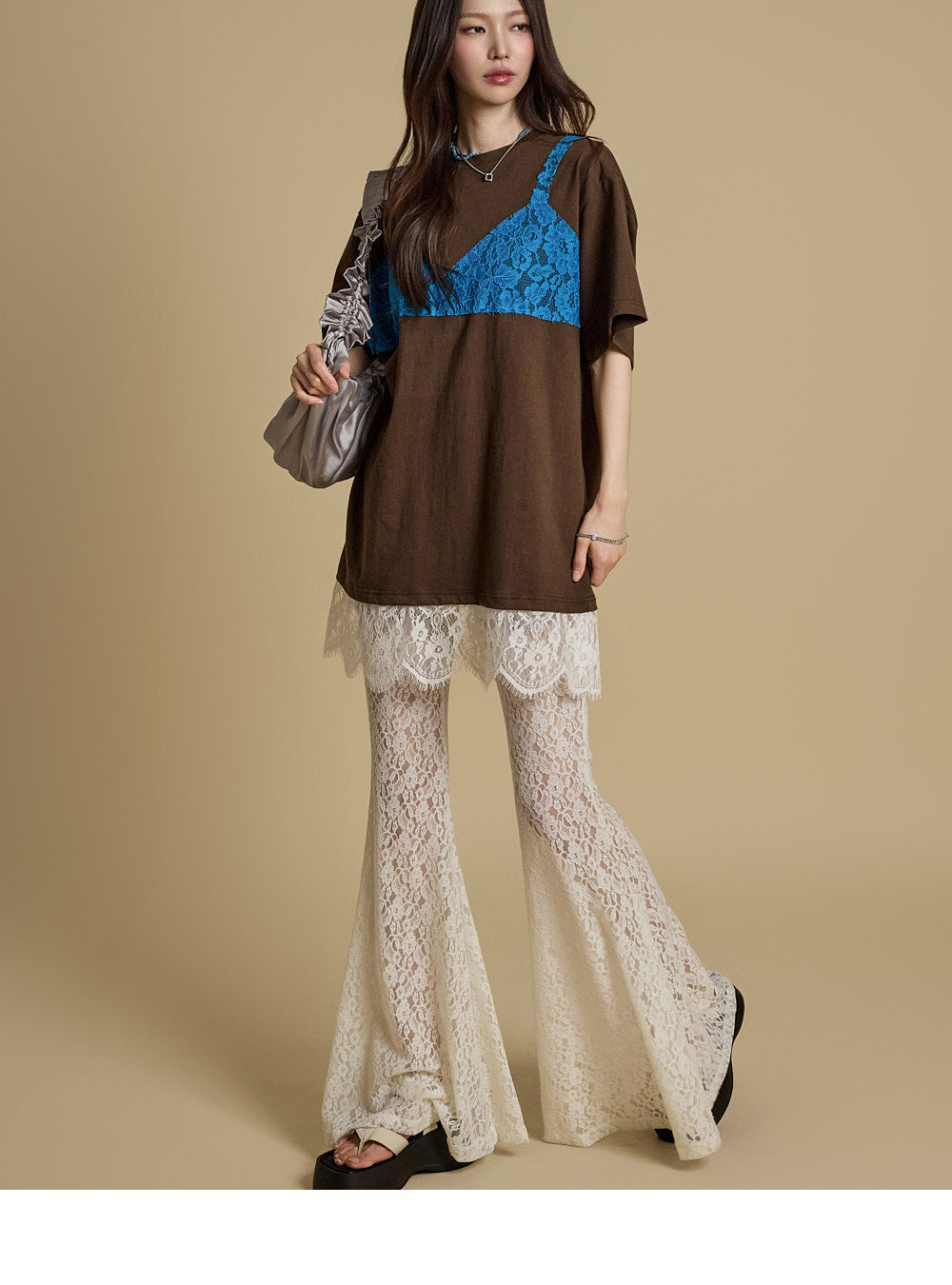 这些独特的蕾丝喇叭裤采用灵活的混纺面料制成