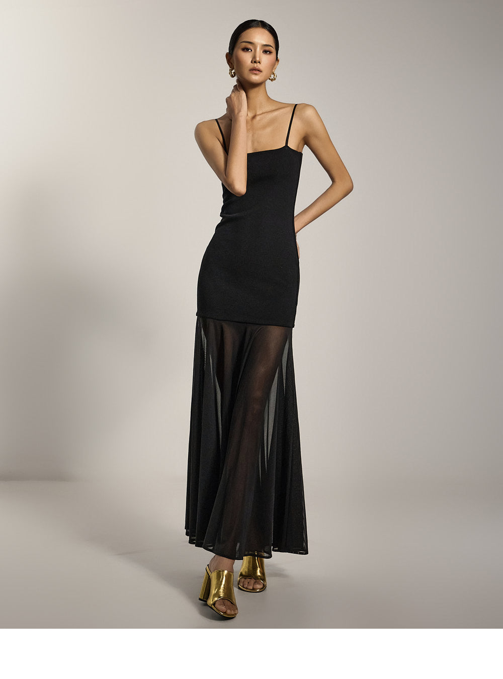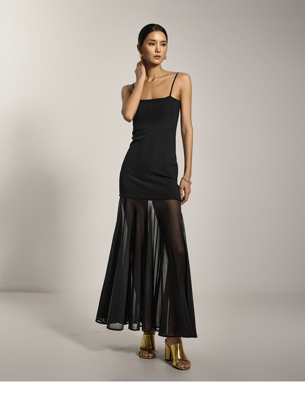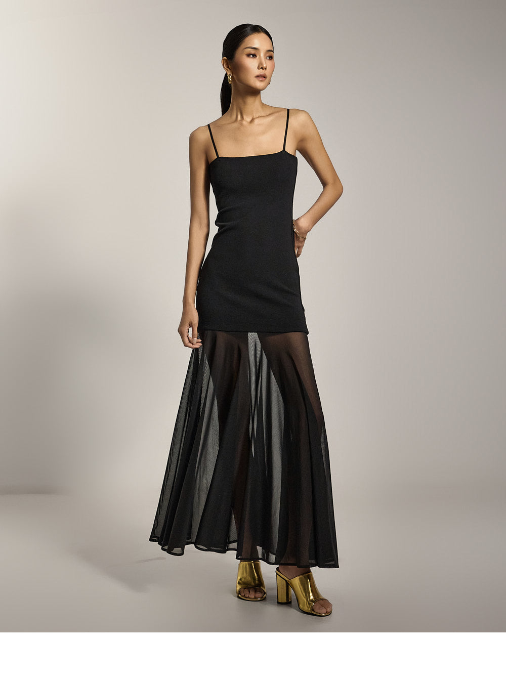 修身的紧身胸衣和透明的百褶裙完美地融合在一起,