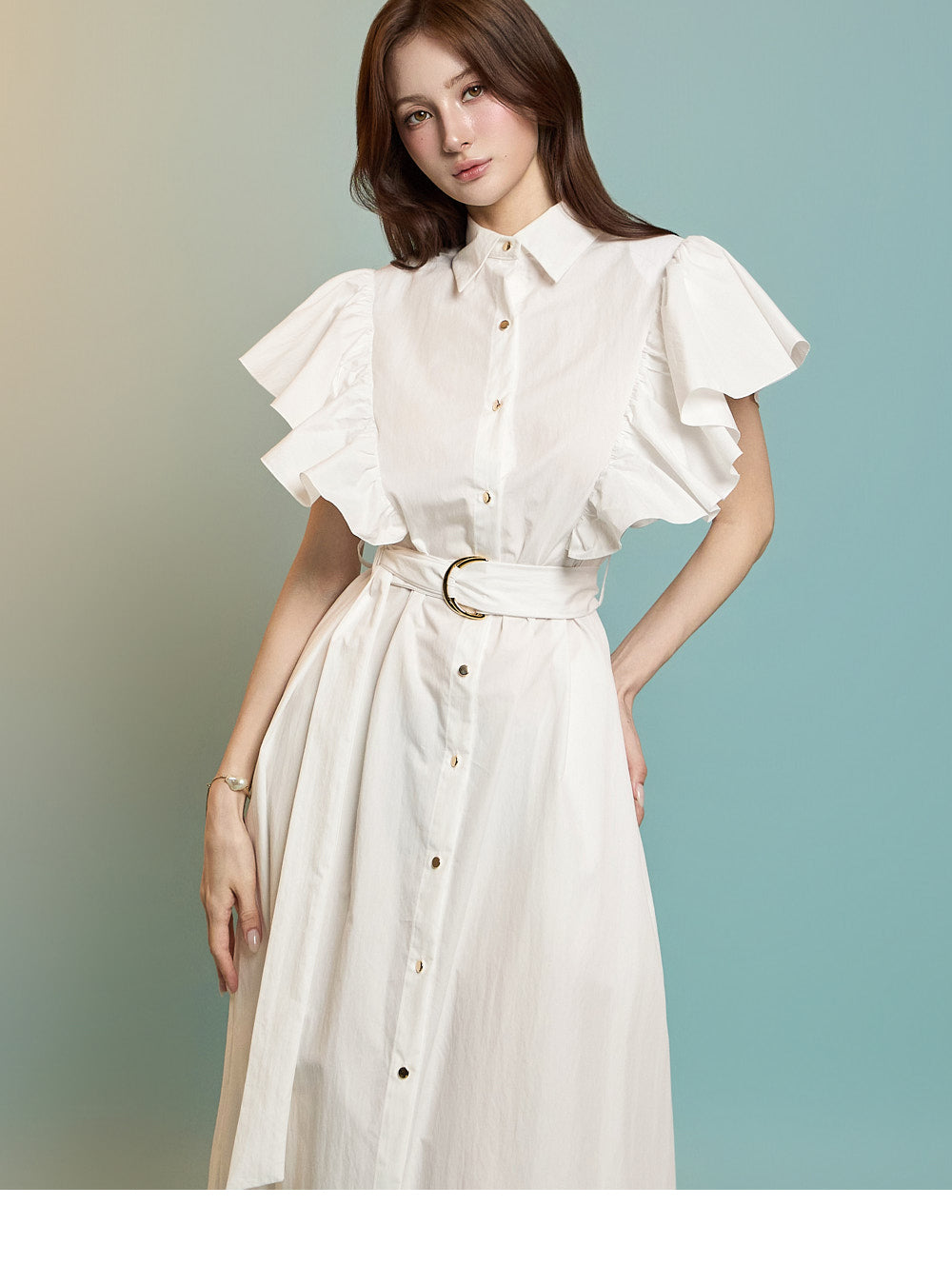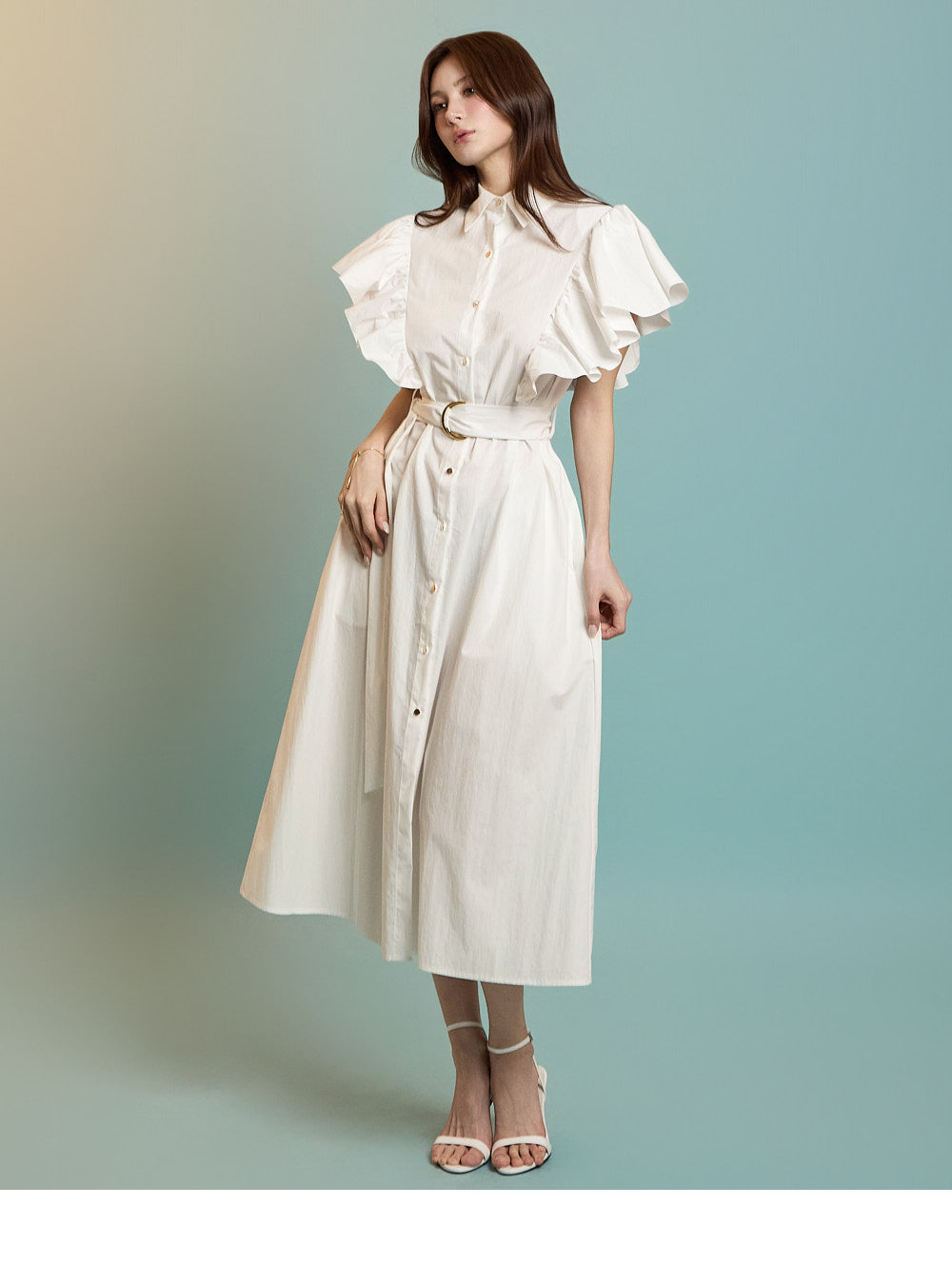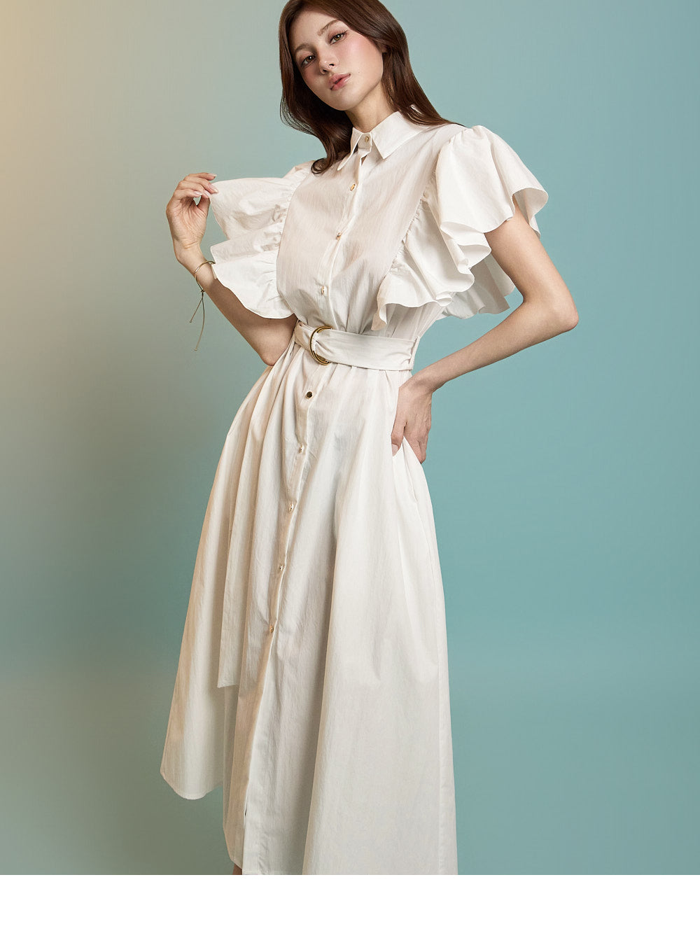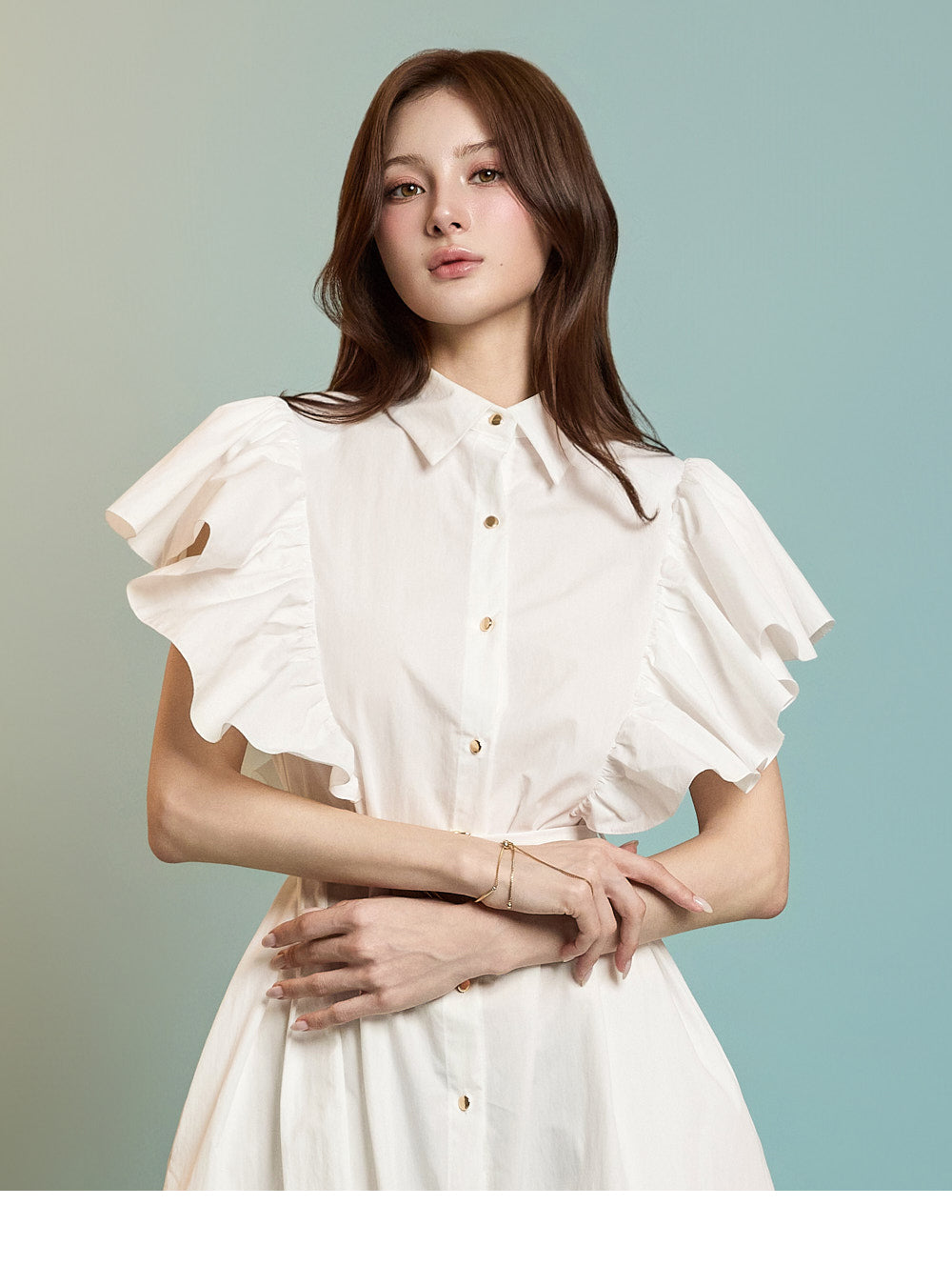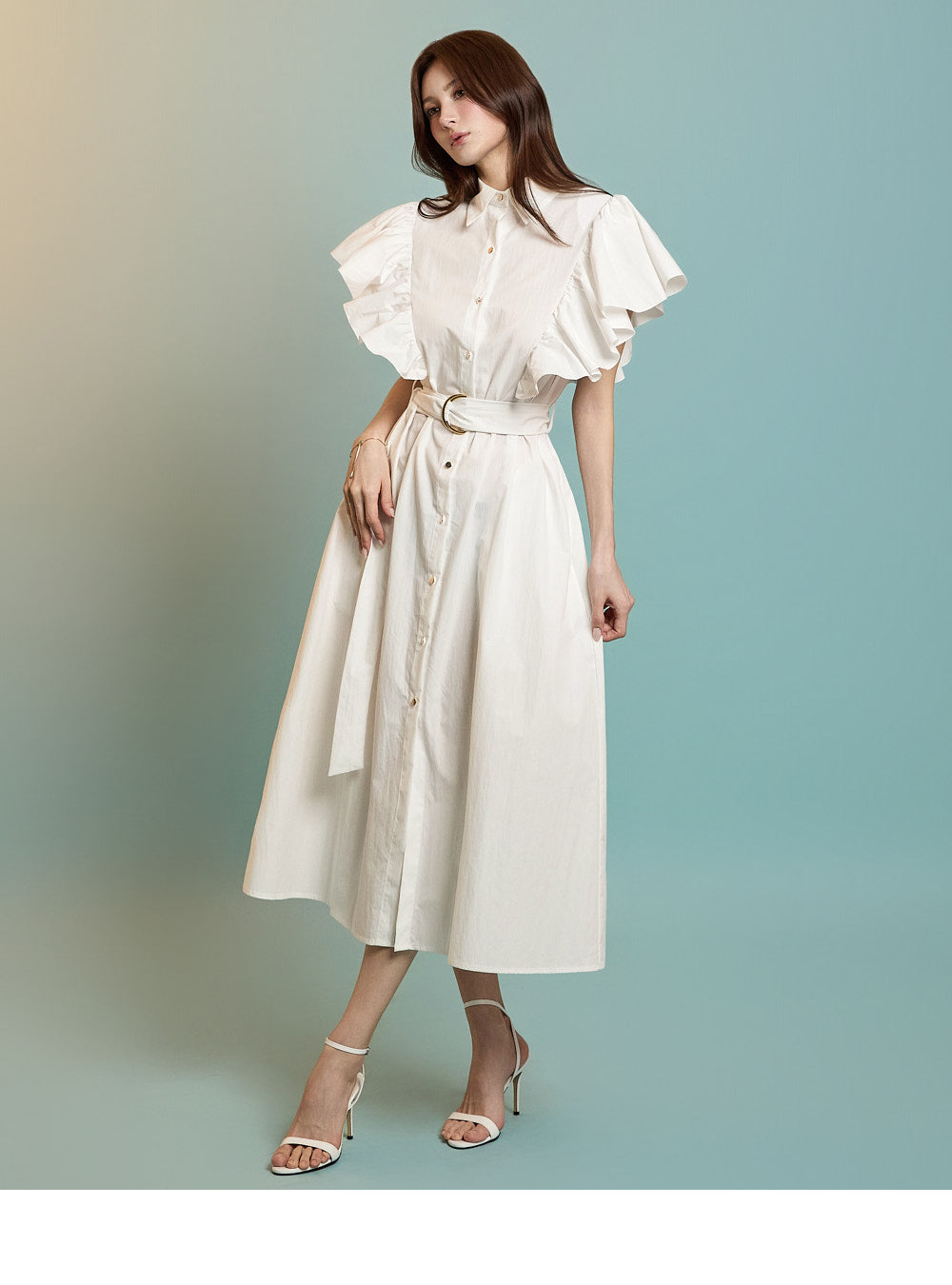肩部褶边和金色纽扣增添了优雅精致的感觉,