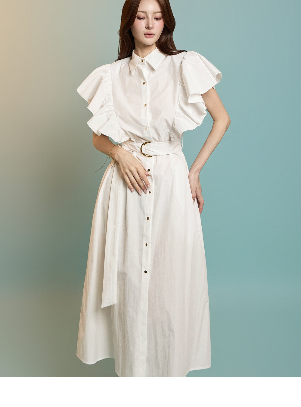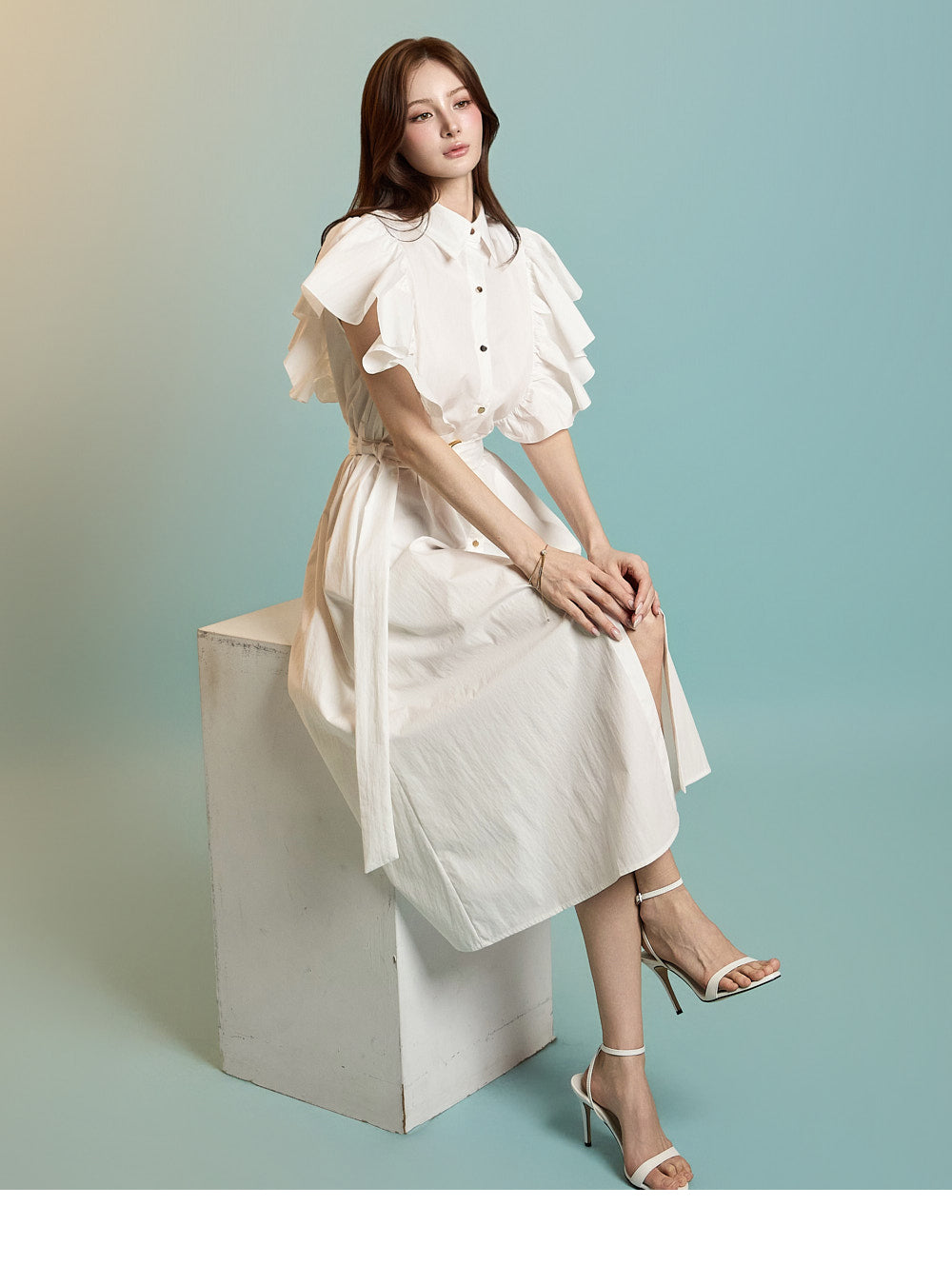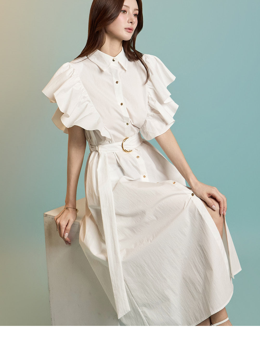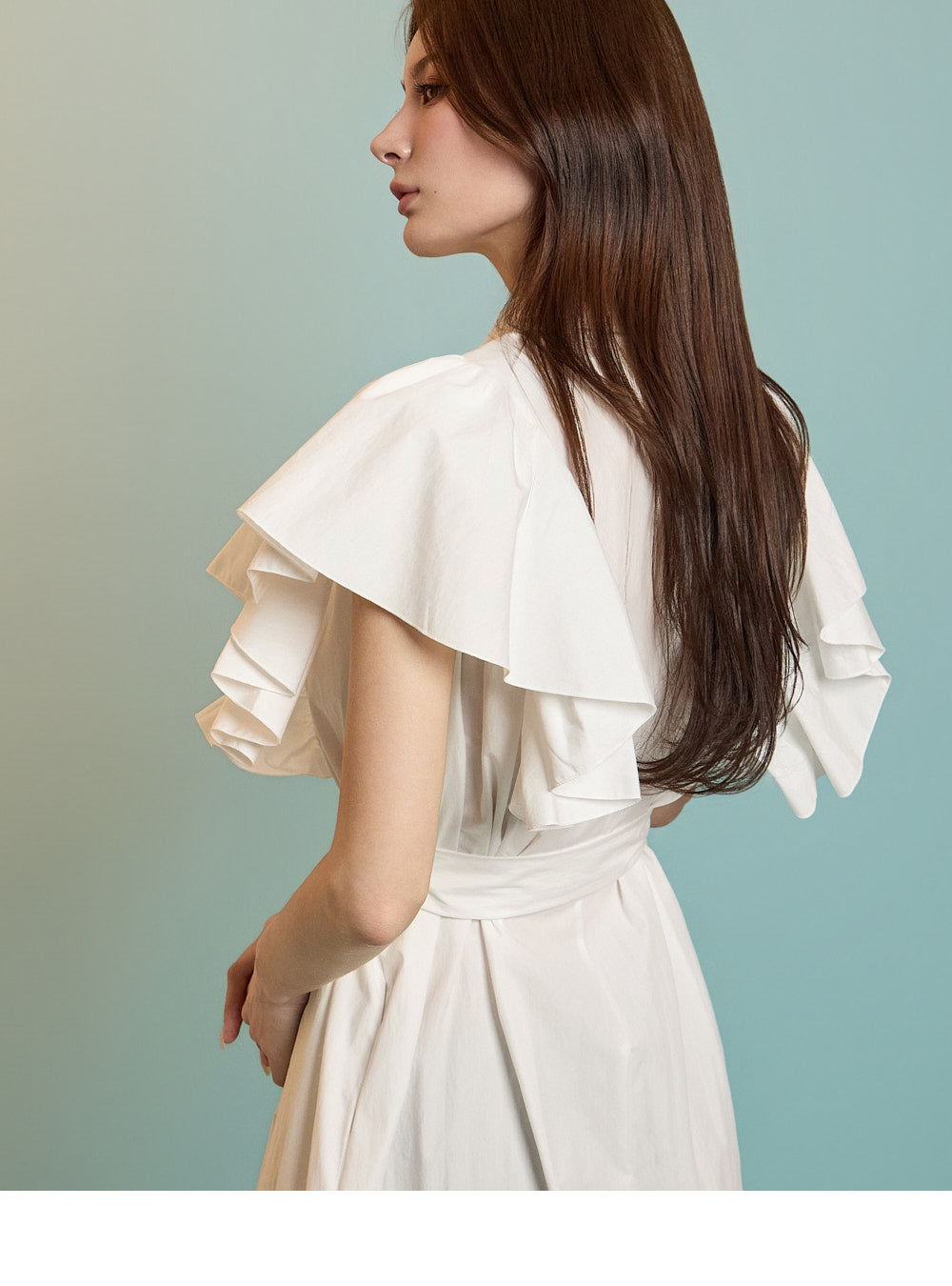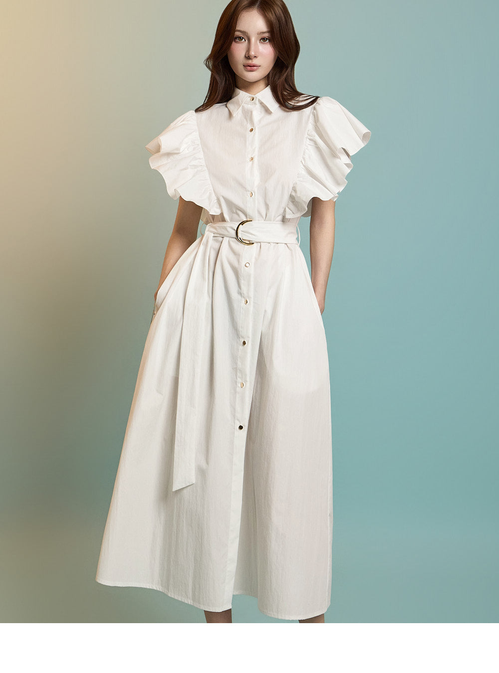 肩部褶边和金色纽扣增添了优雅精致的感觉,