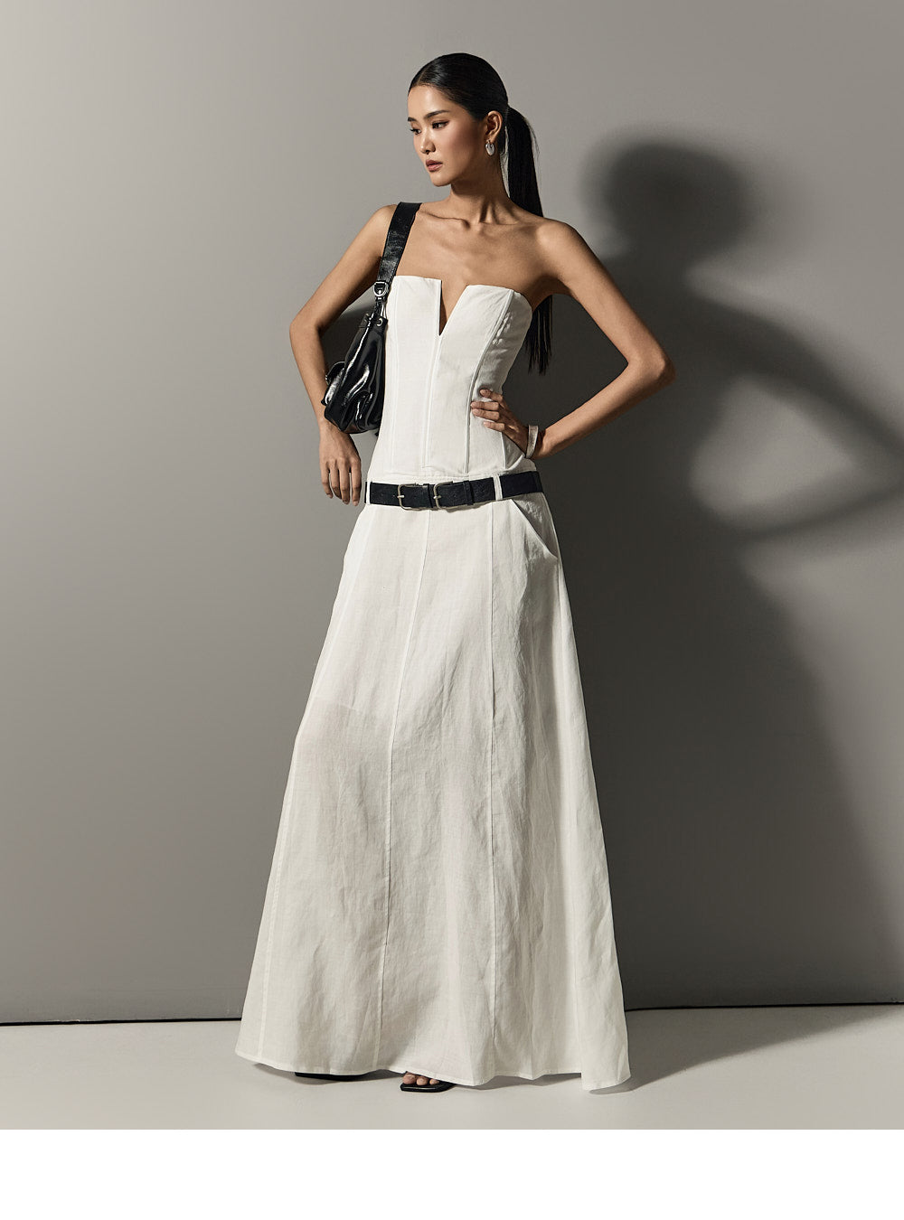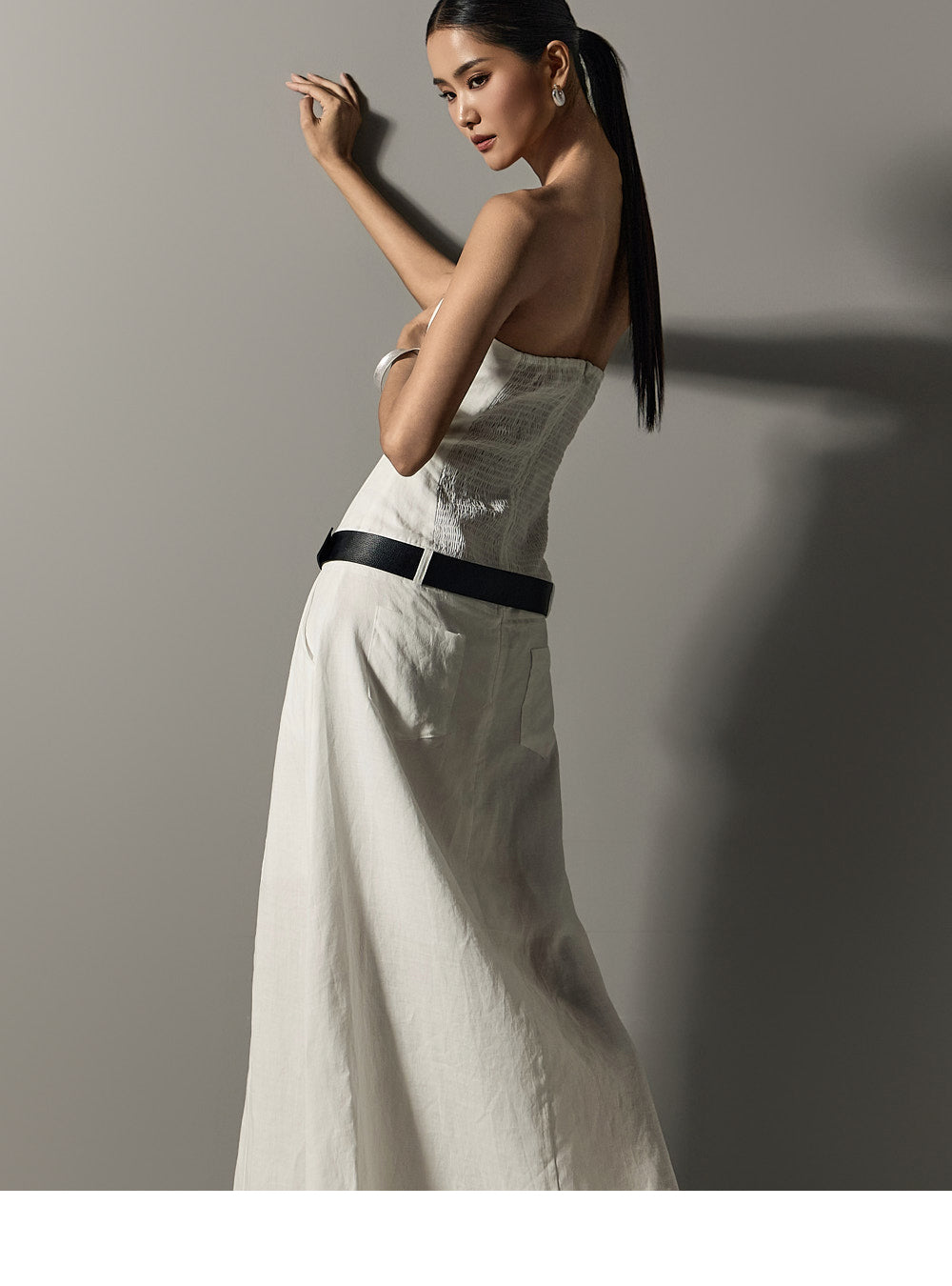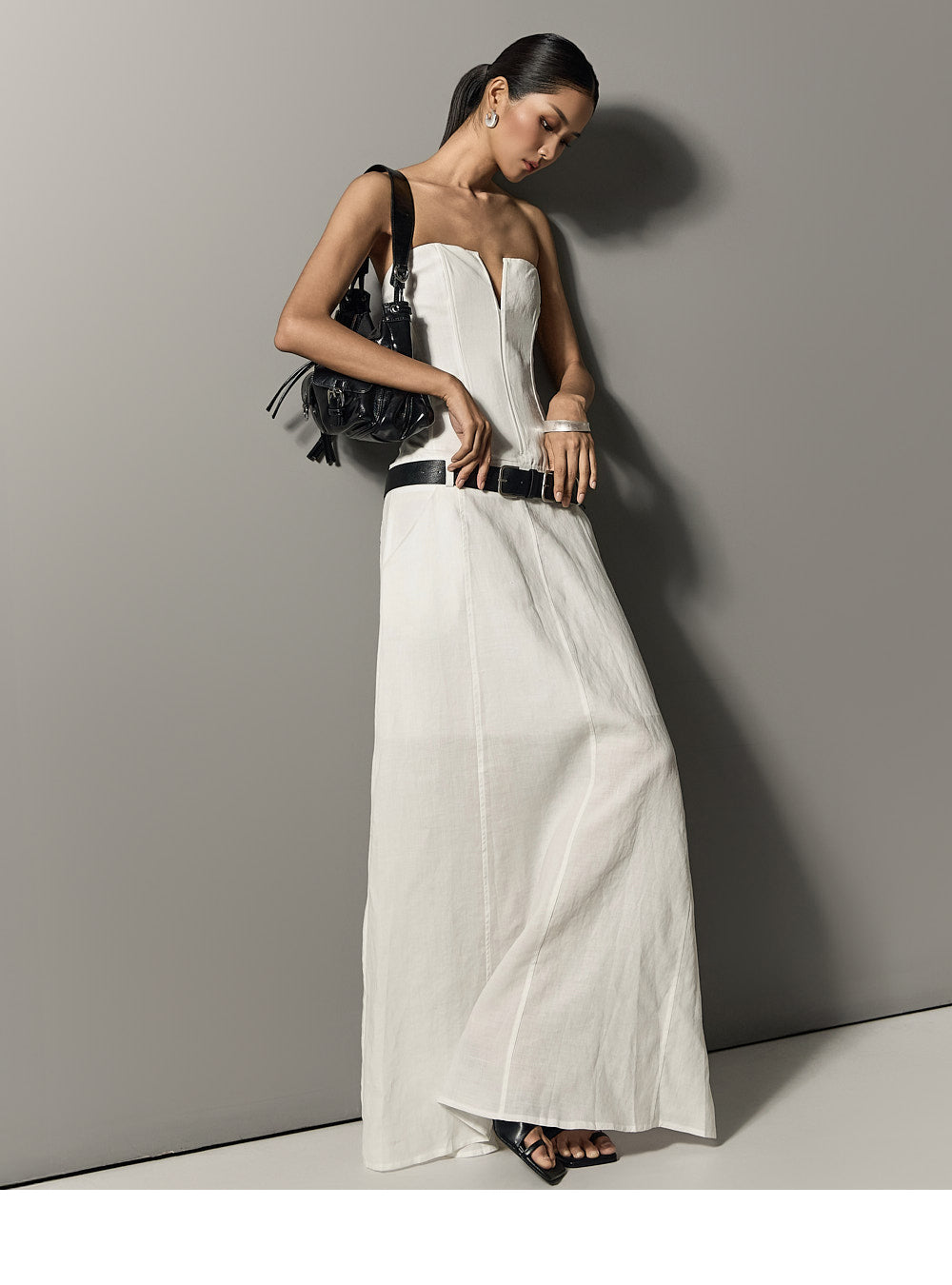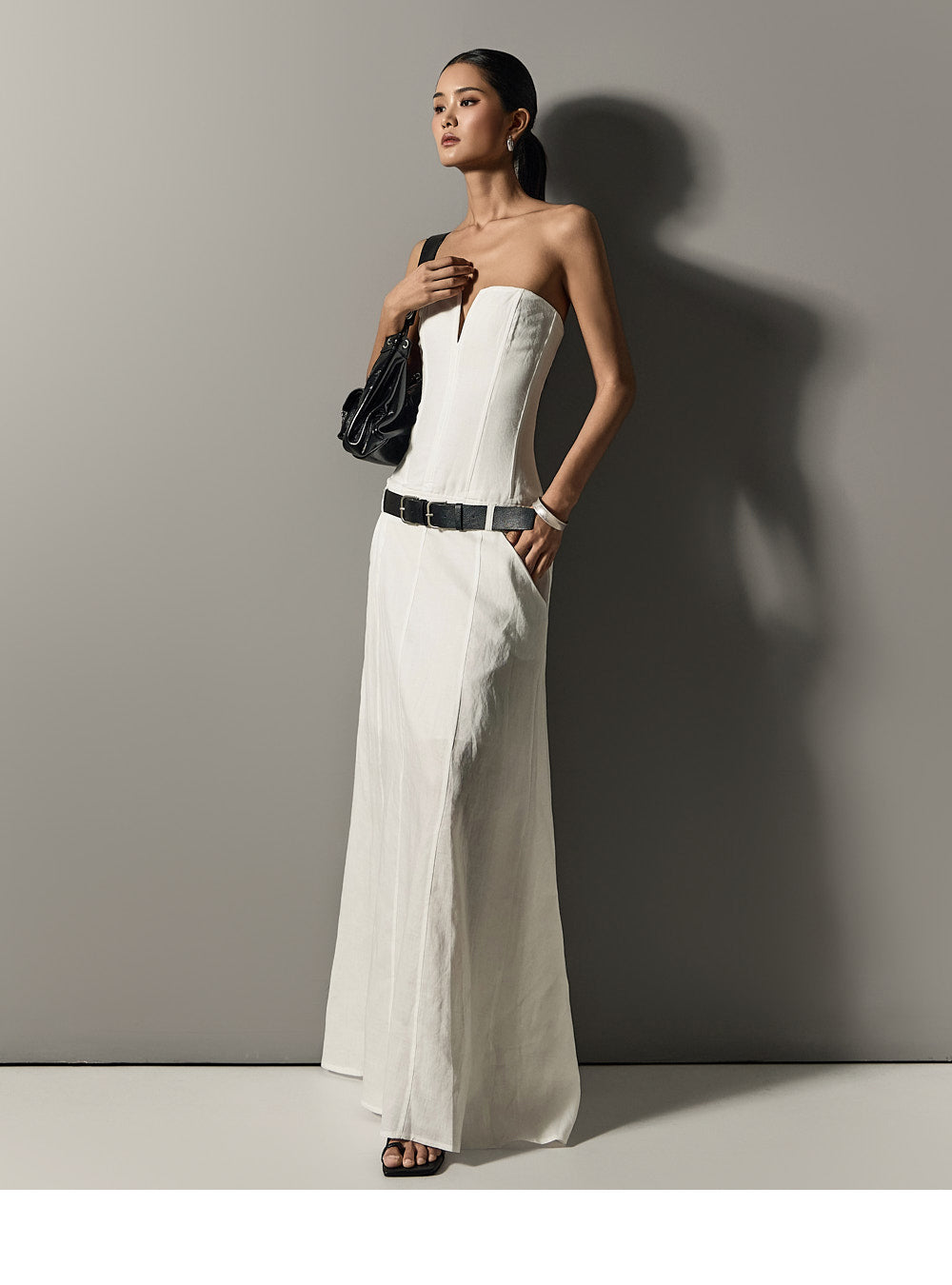 超长裙长和微微喇叭形的裙摆营造出优雅的轮廓