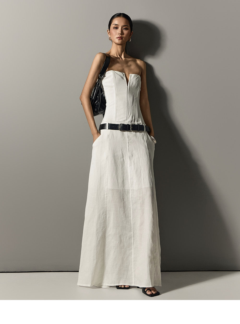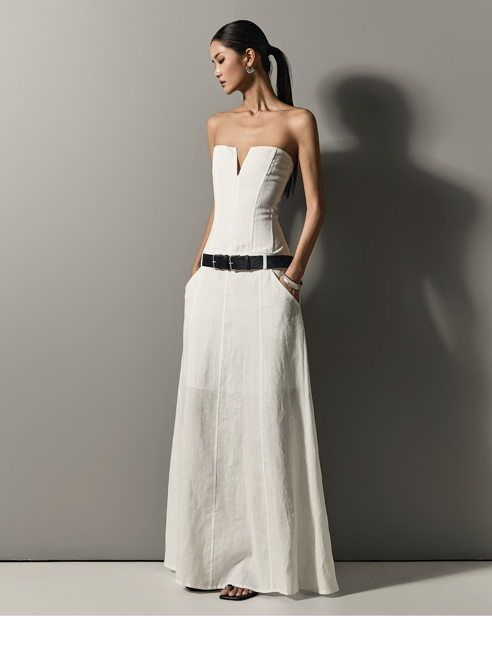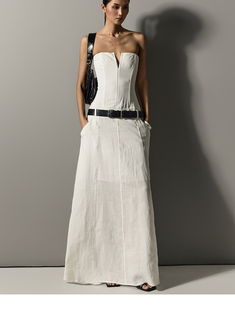 超长裙长和微微喇叭形的裙摆营造出优雅的轮廓
