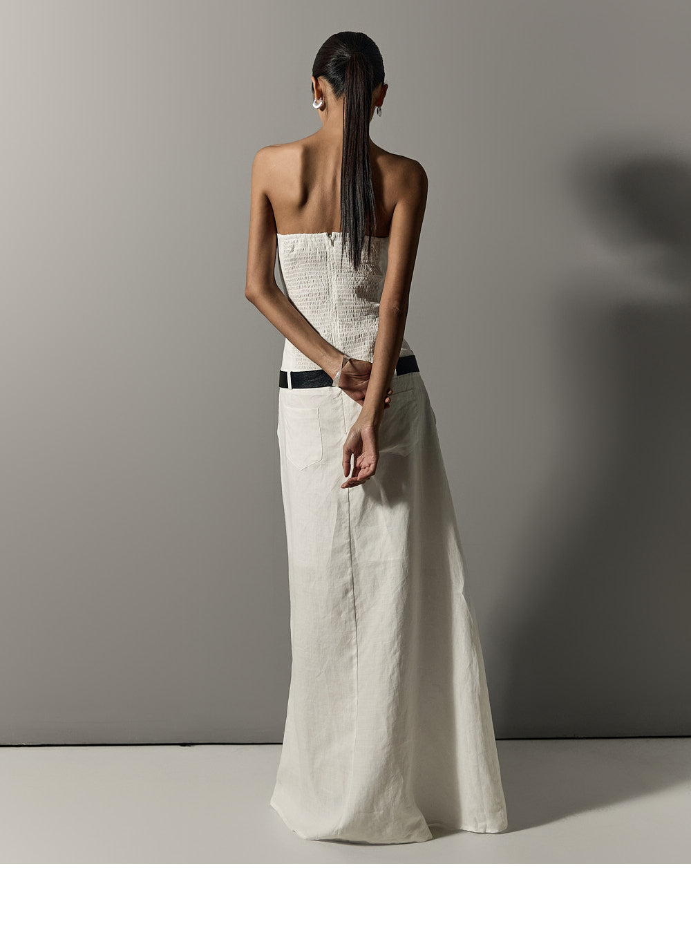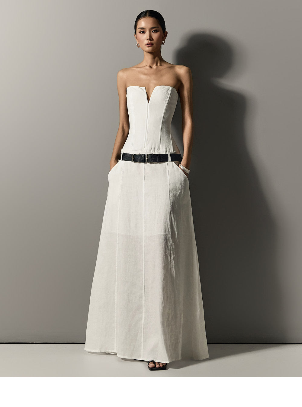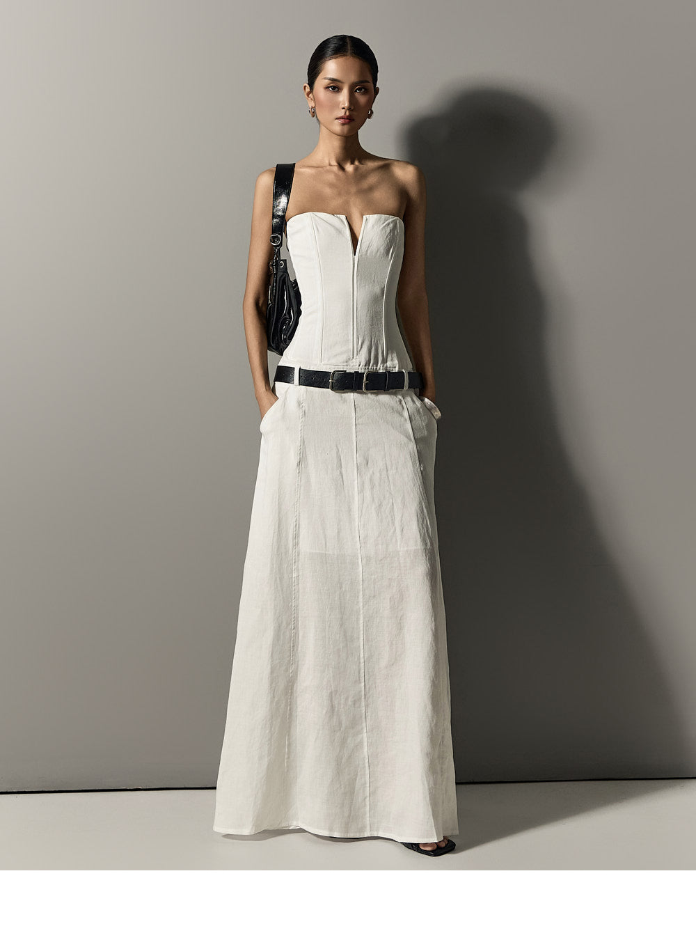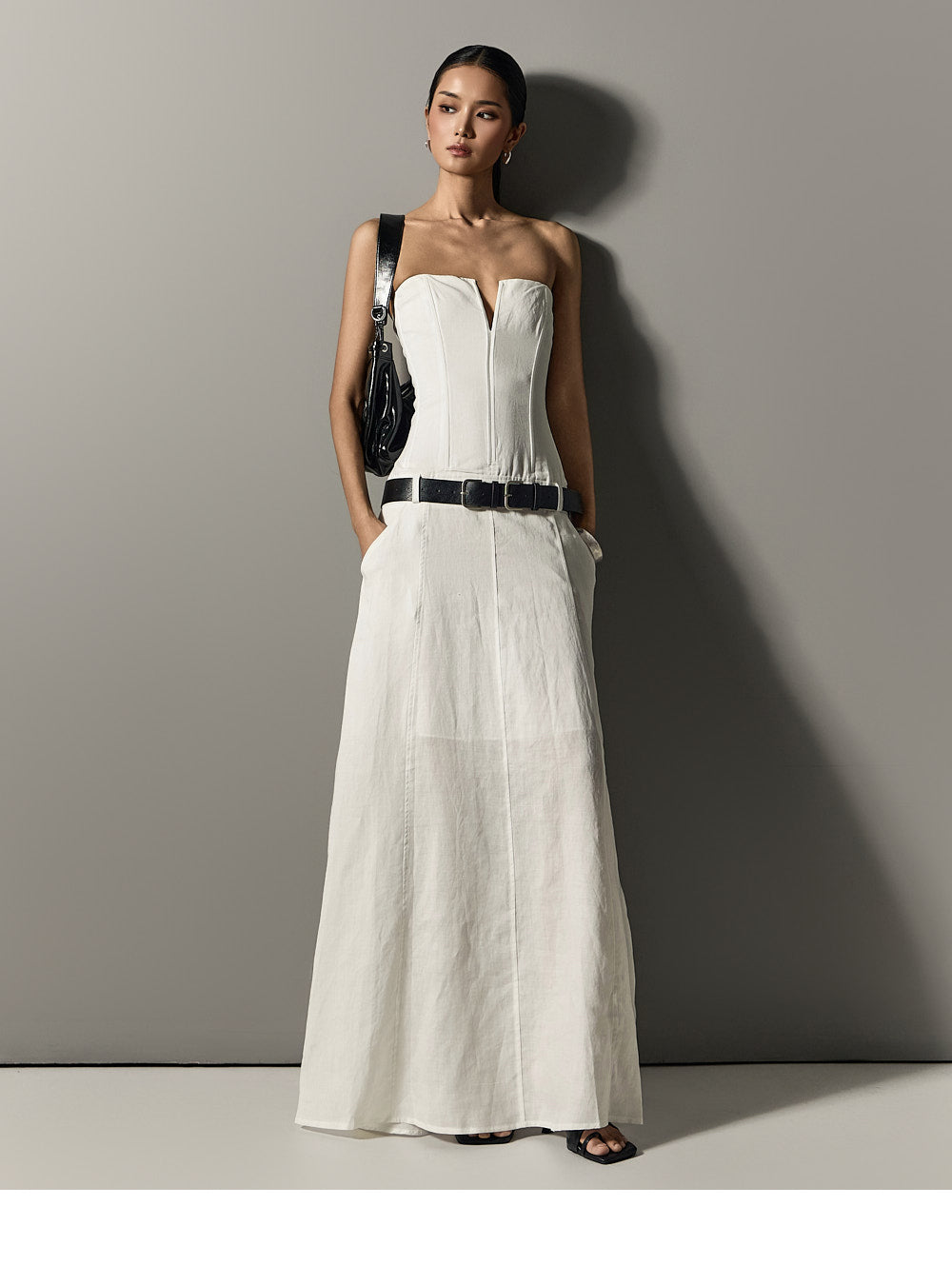 超长裙长和微微喇叭形的裙摆营造出优雅的轮廓