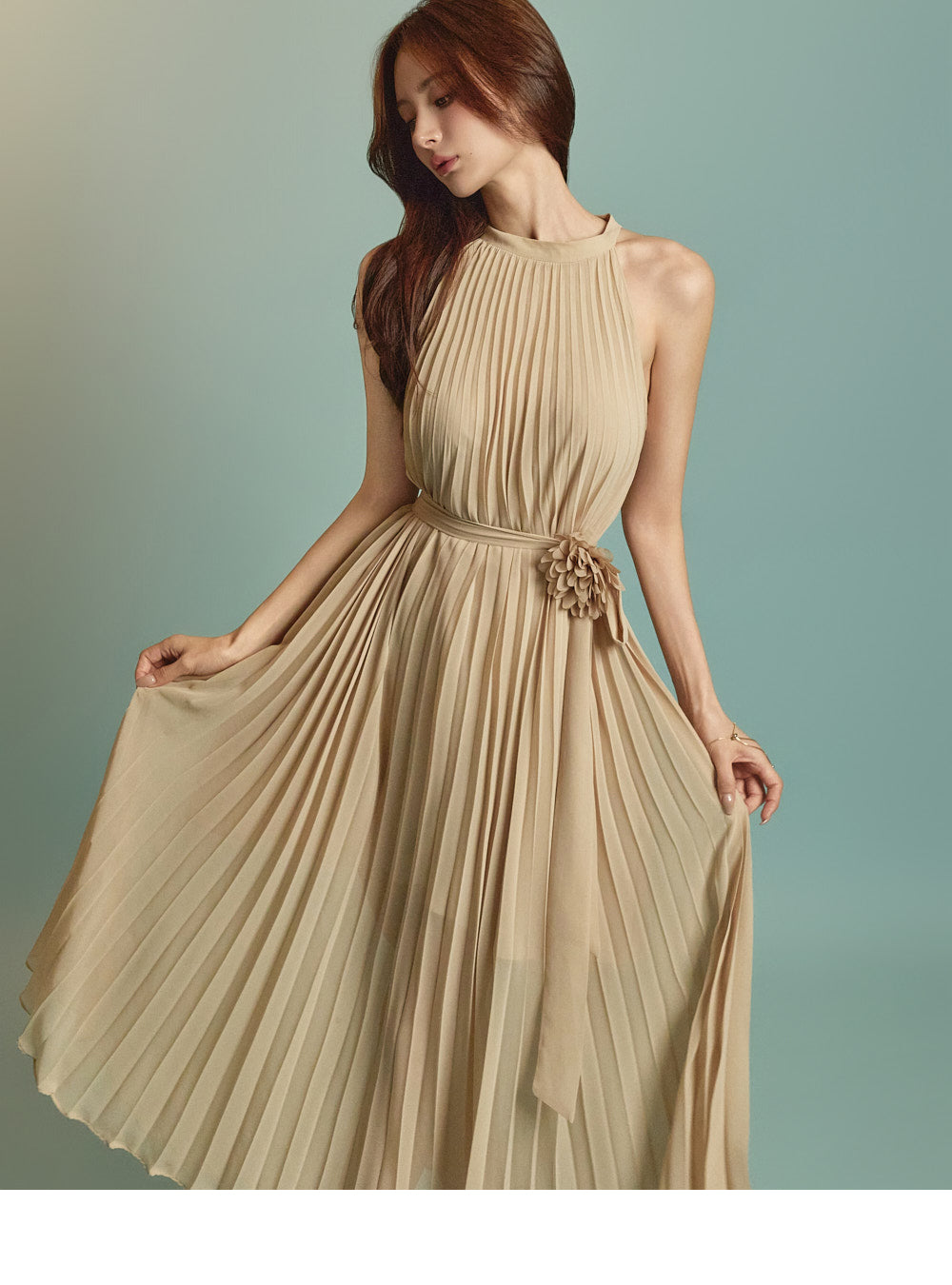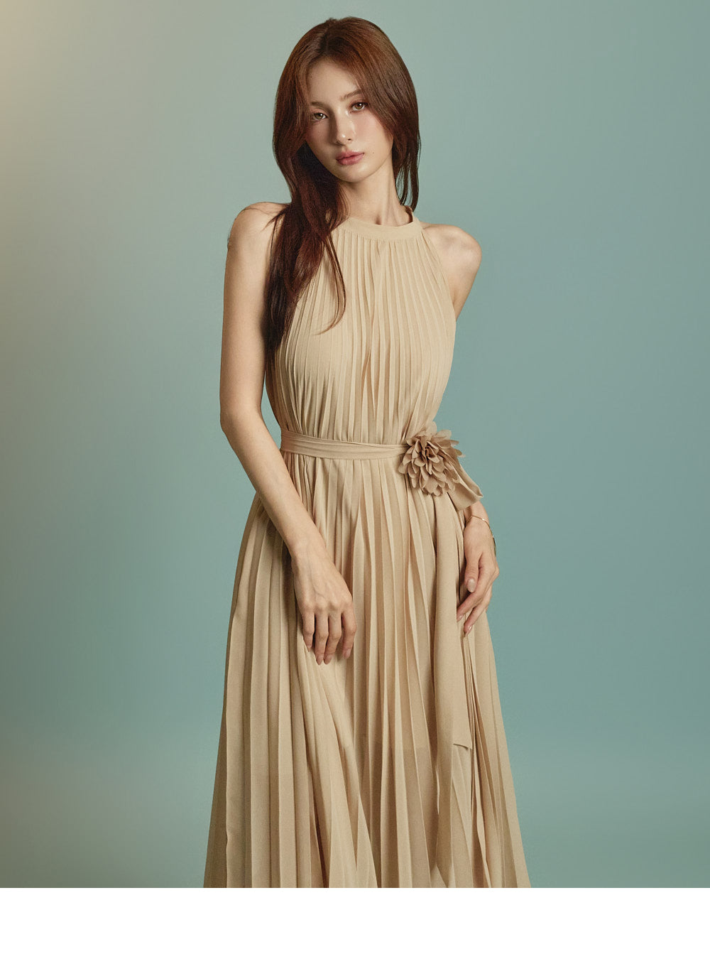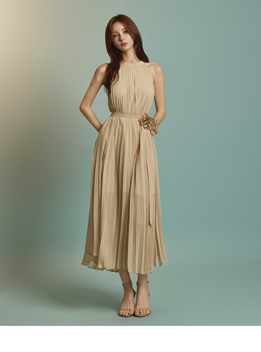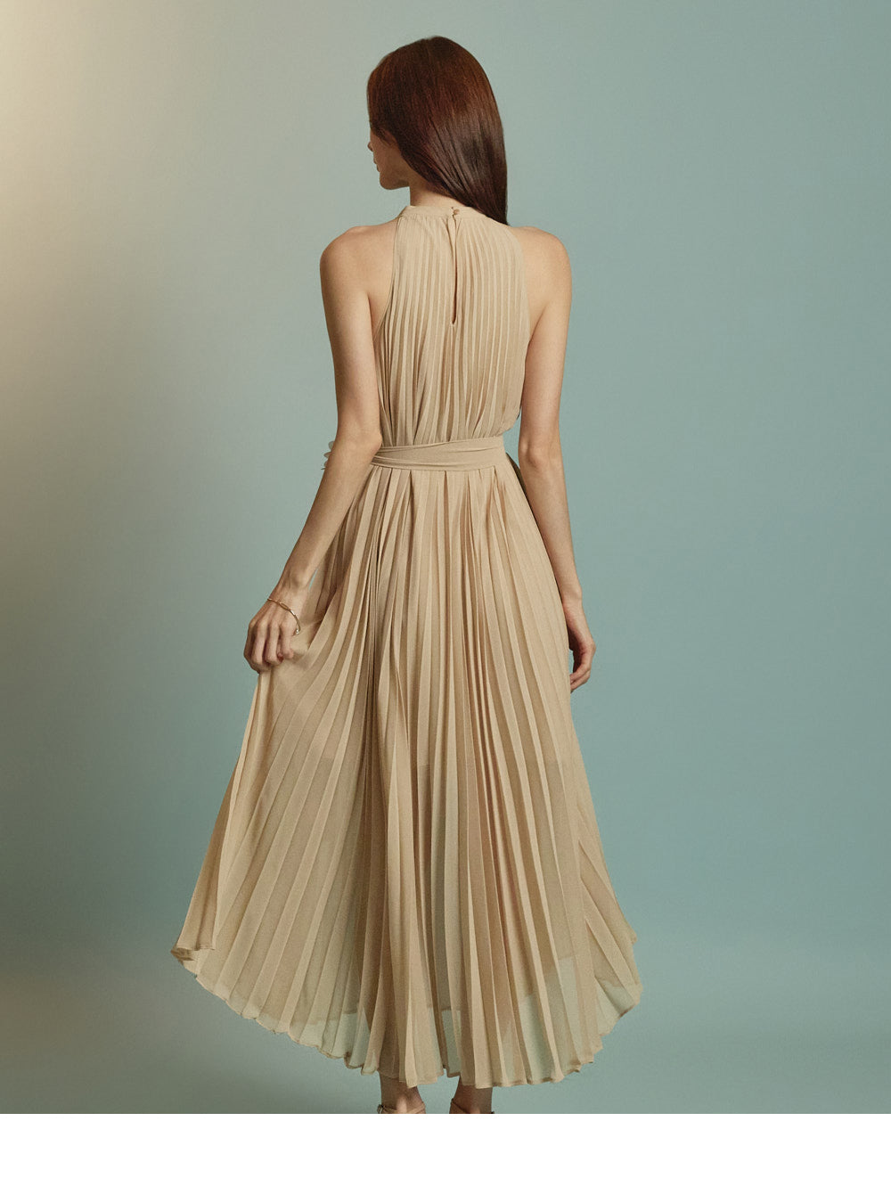 The halter-style, sleeveless cut beautifully highlights the shoulders and neckline, enhancing a gentle and elegant look.