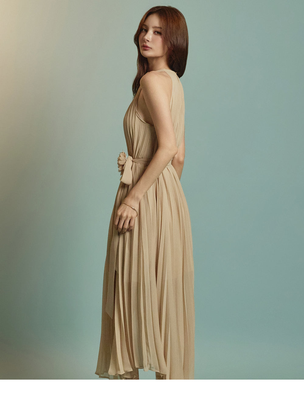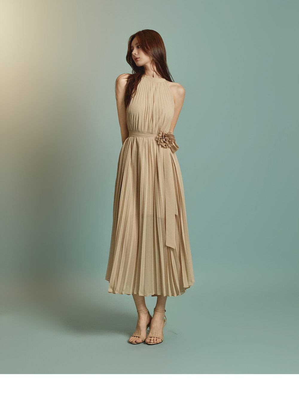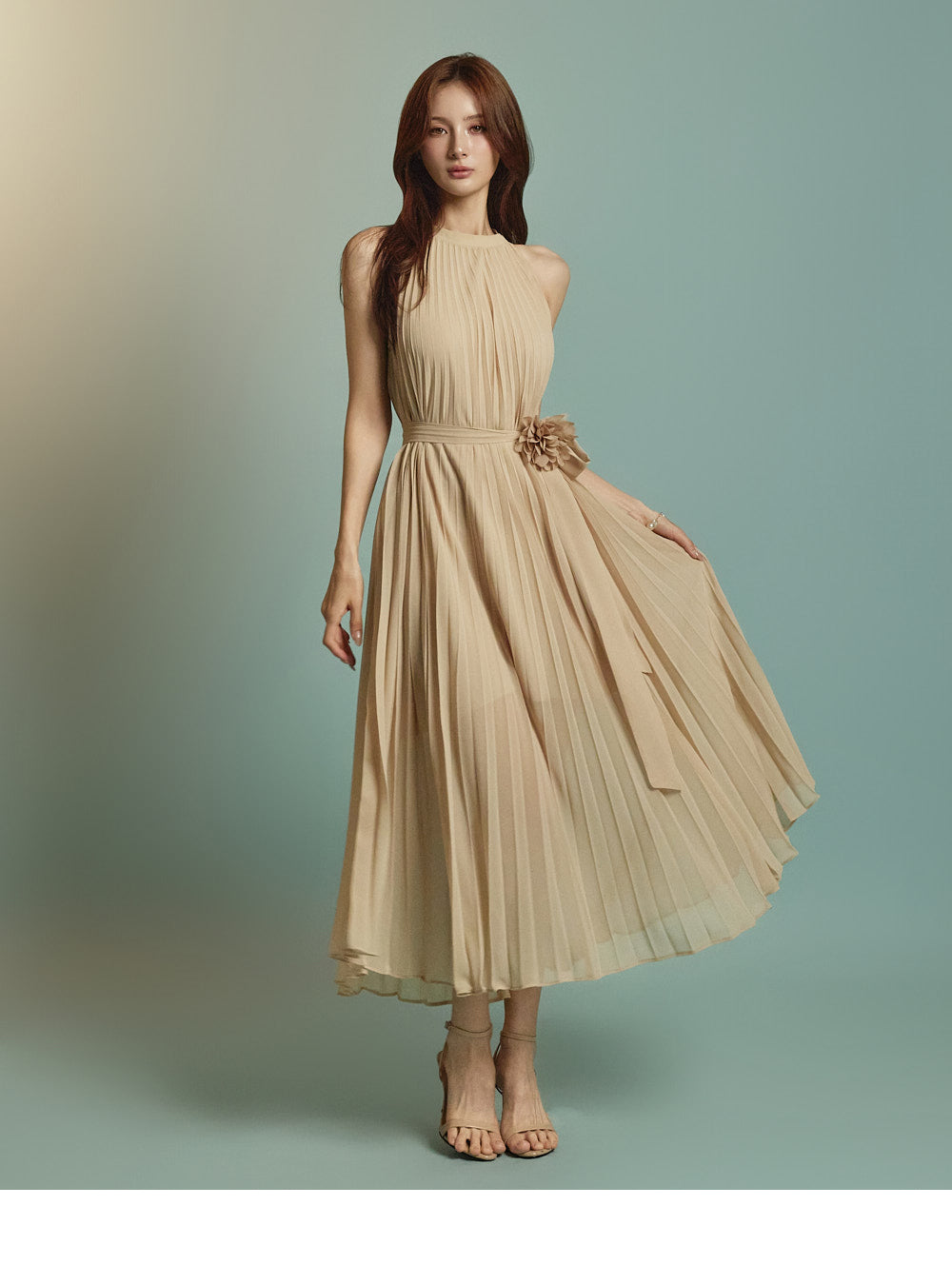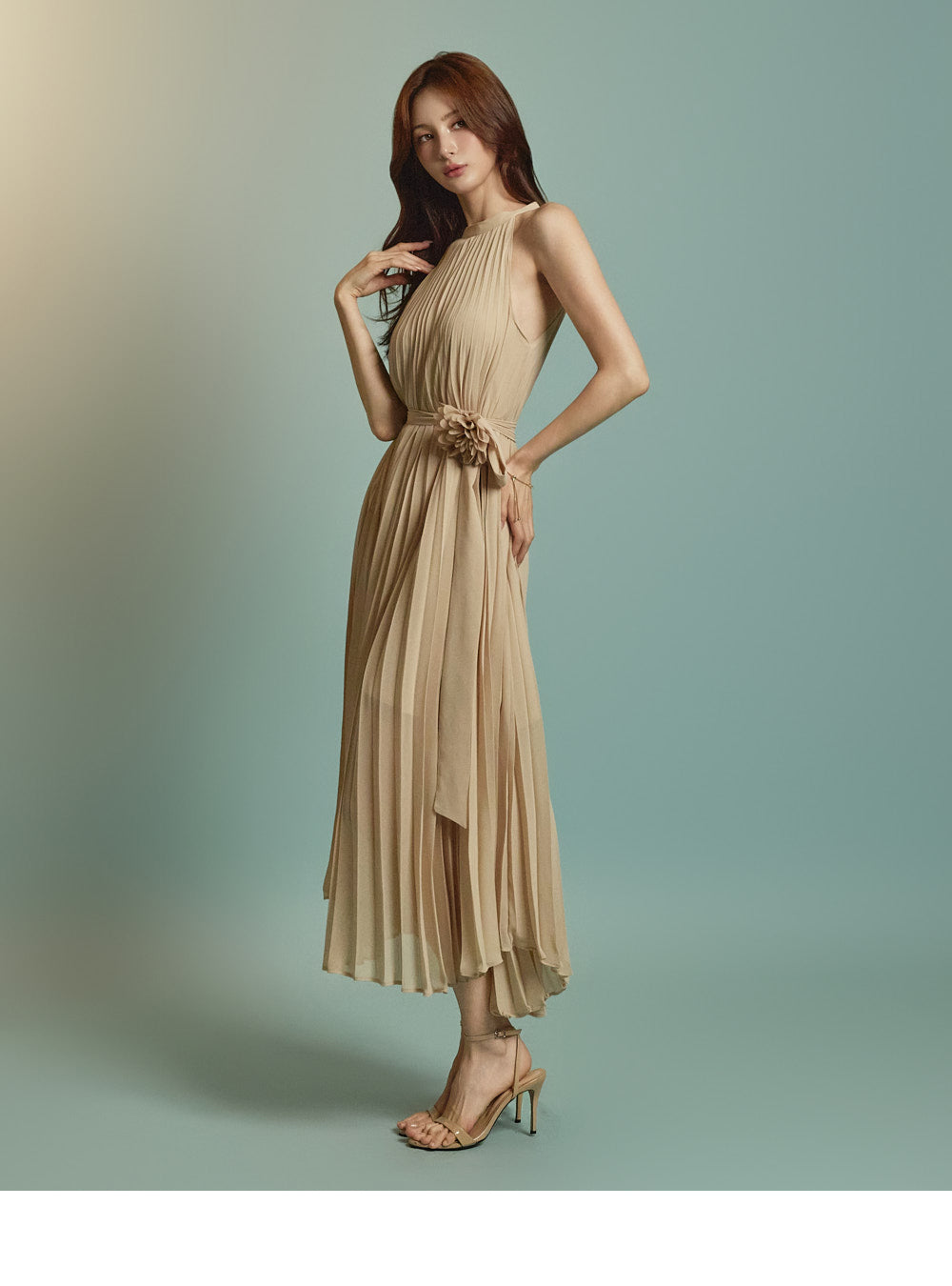 The halter-style, sleeveless cut beautifully highlights the shoulders and neckline, enhancing a gentle and elegant look.
