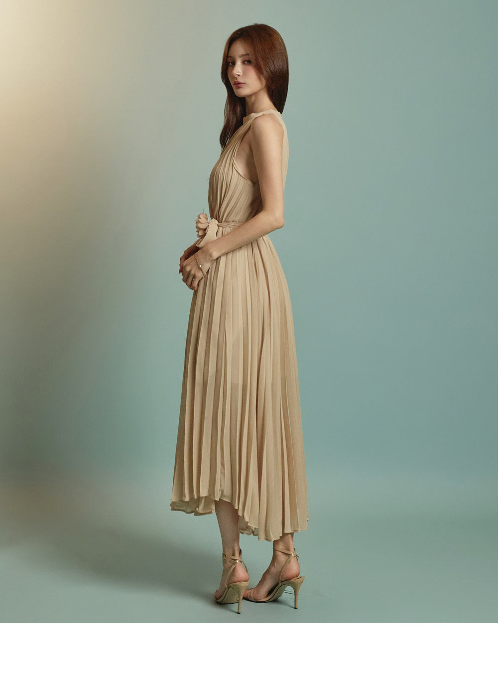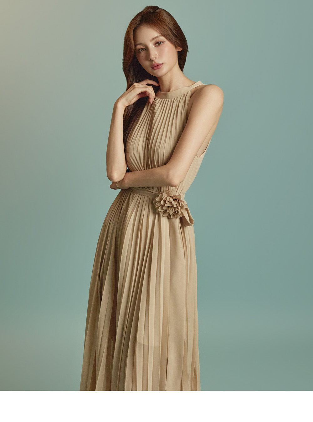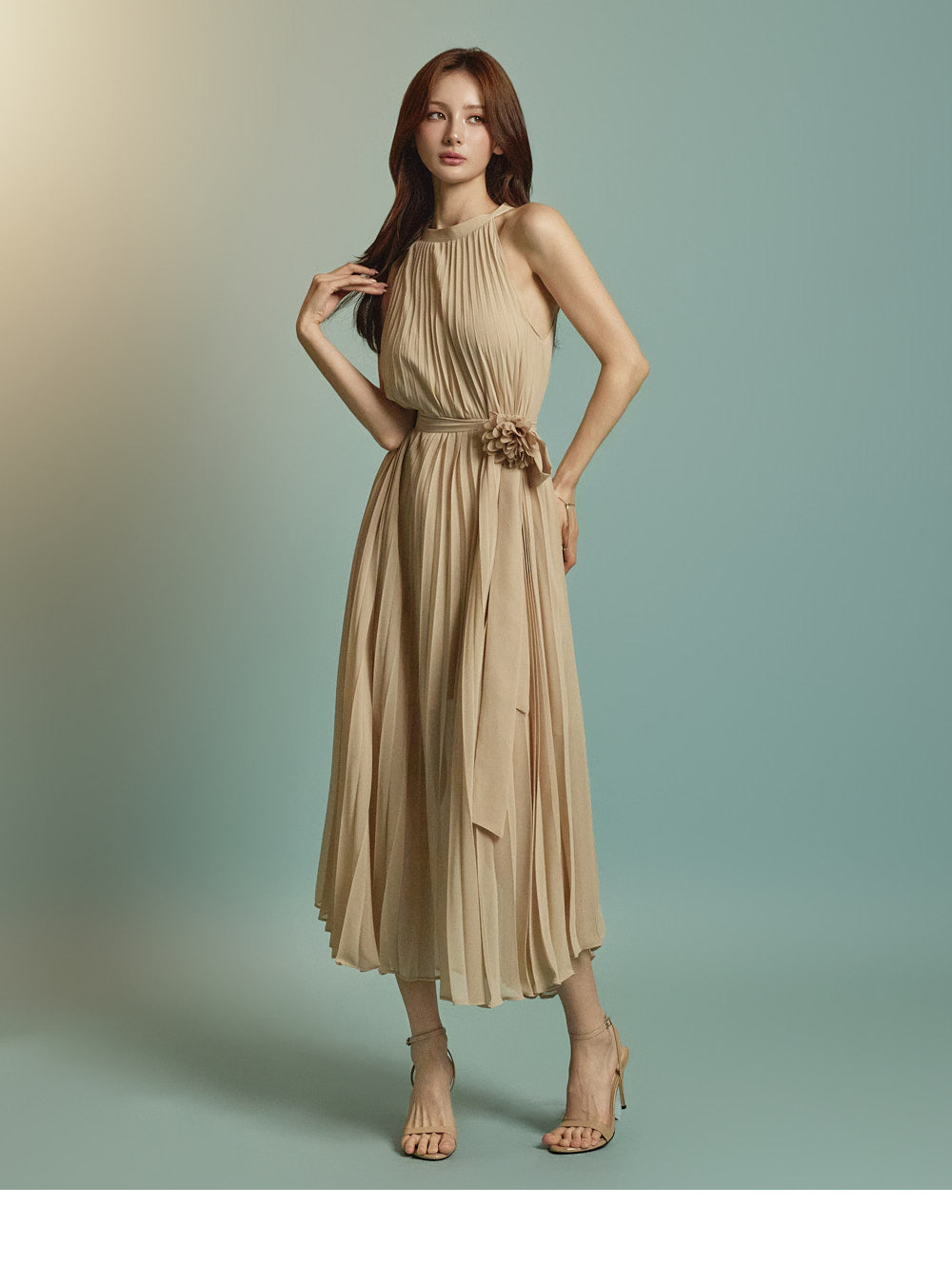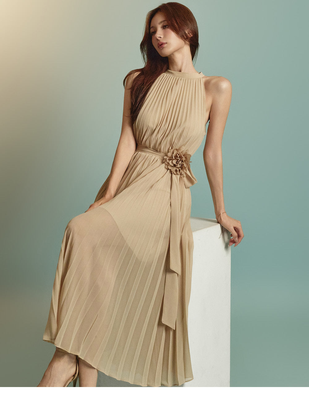 The halter-style, sleeveless cut beautifully highlights the shoulders and neckline, enhancing a gentle and elegant look.