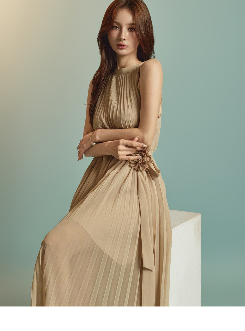 The dress features a pleated design that adds