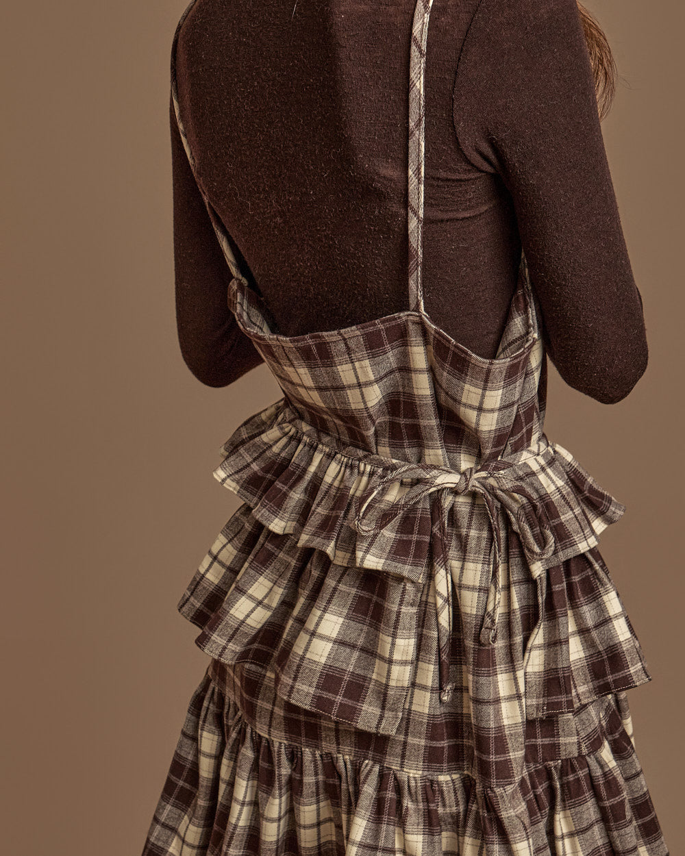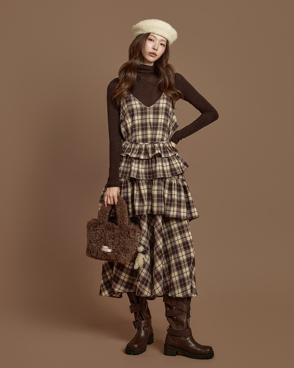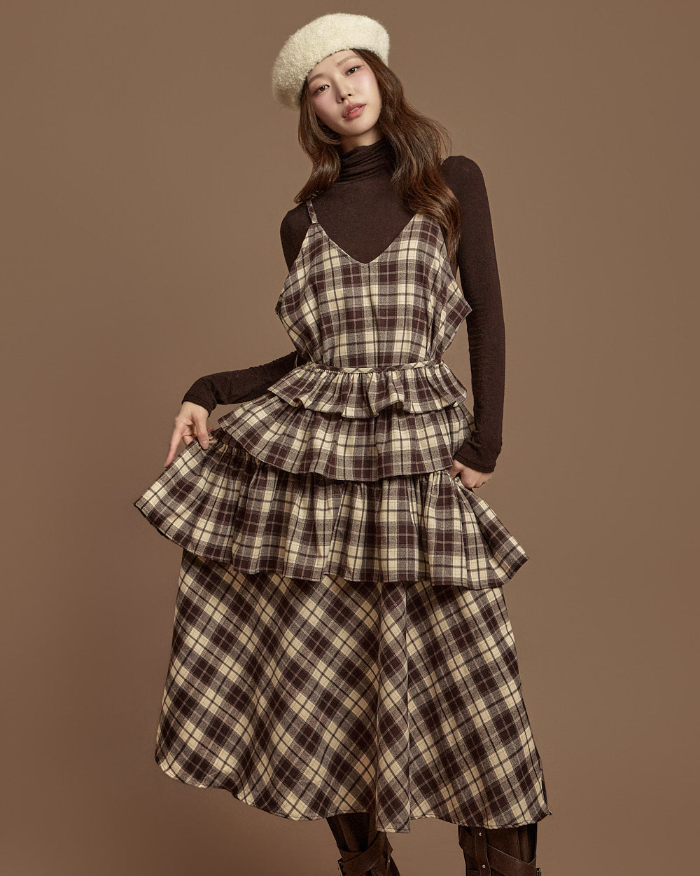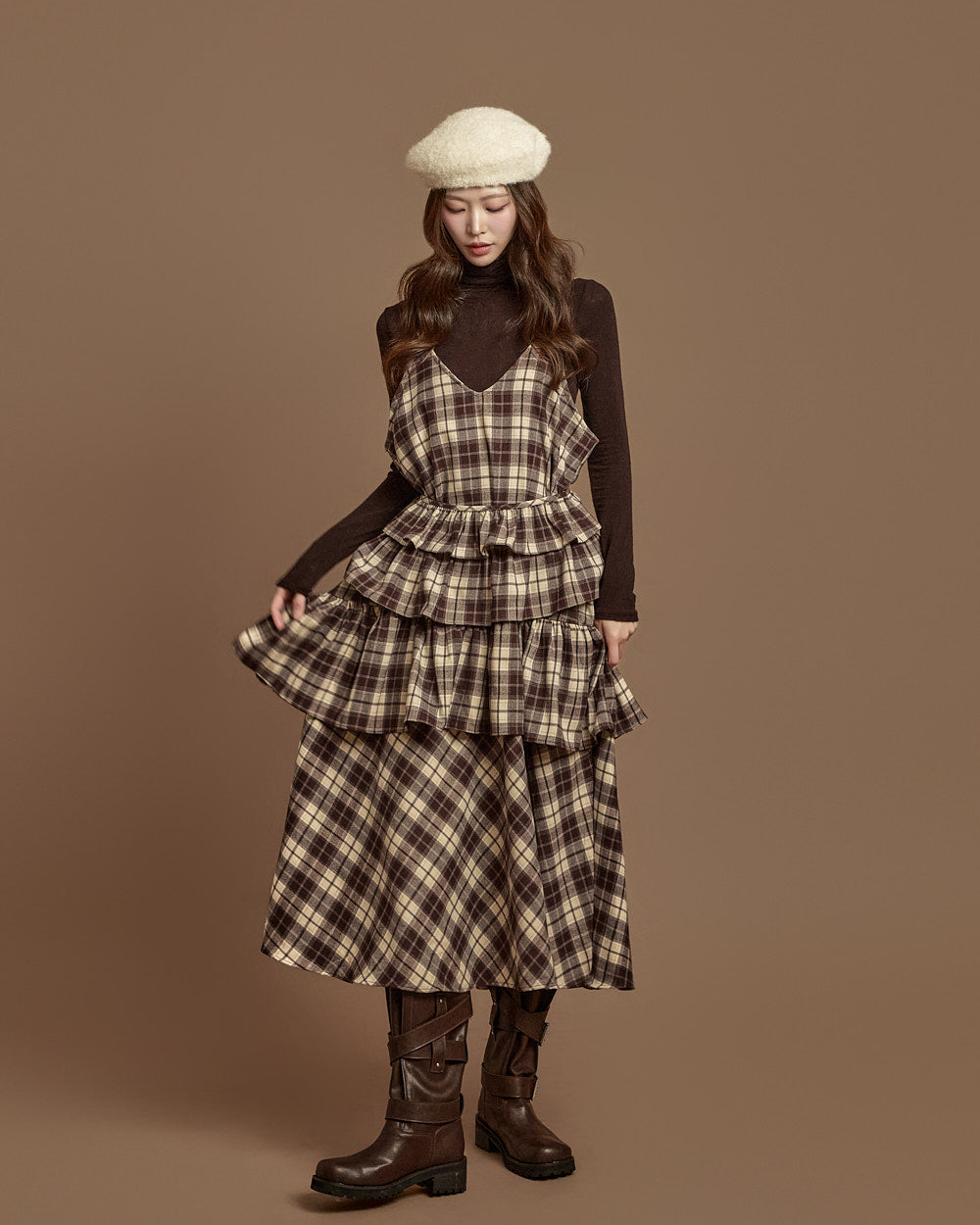 The set includes a frilled skirt with a check pattern and a sleeveless dress,