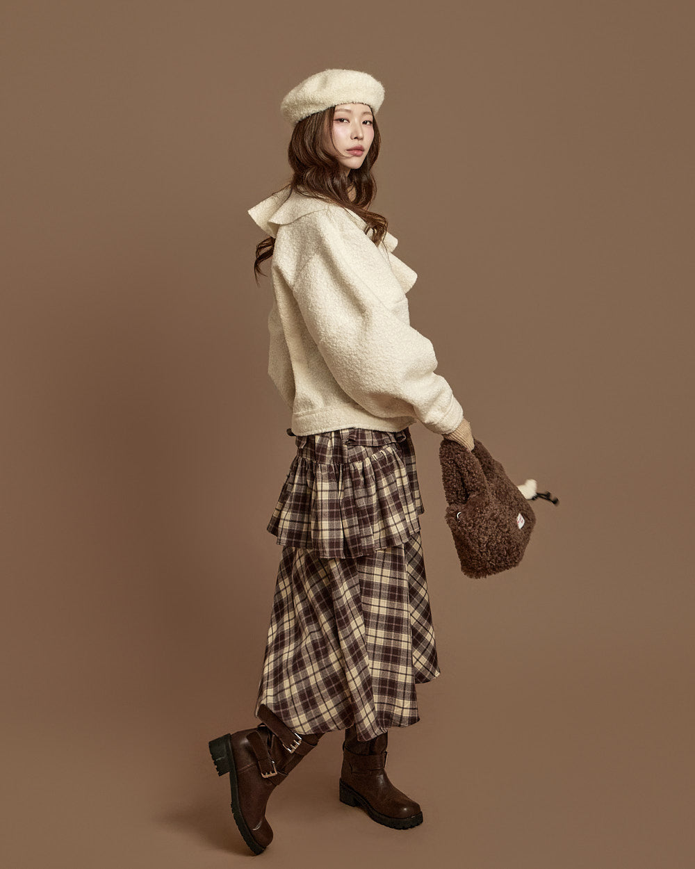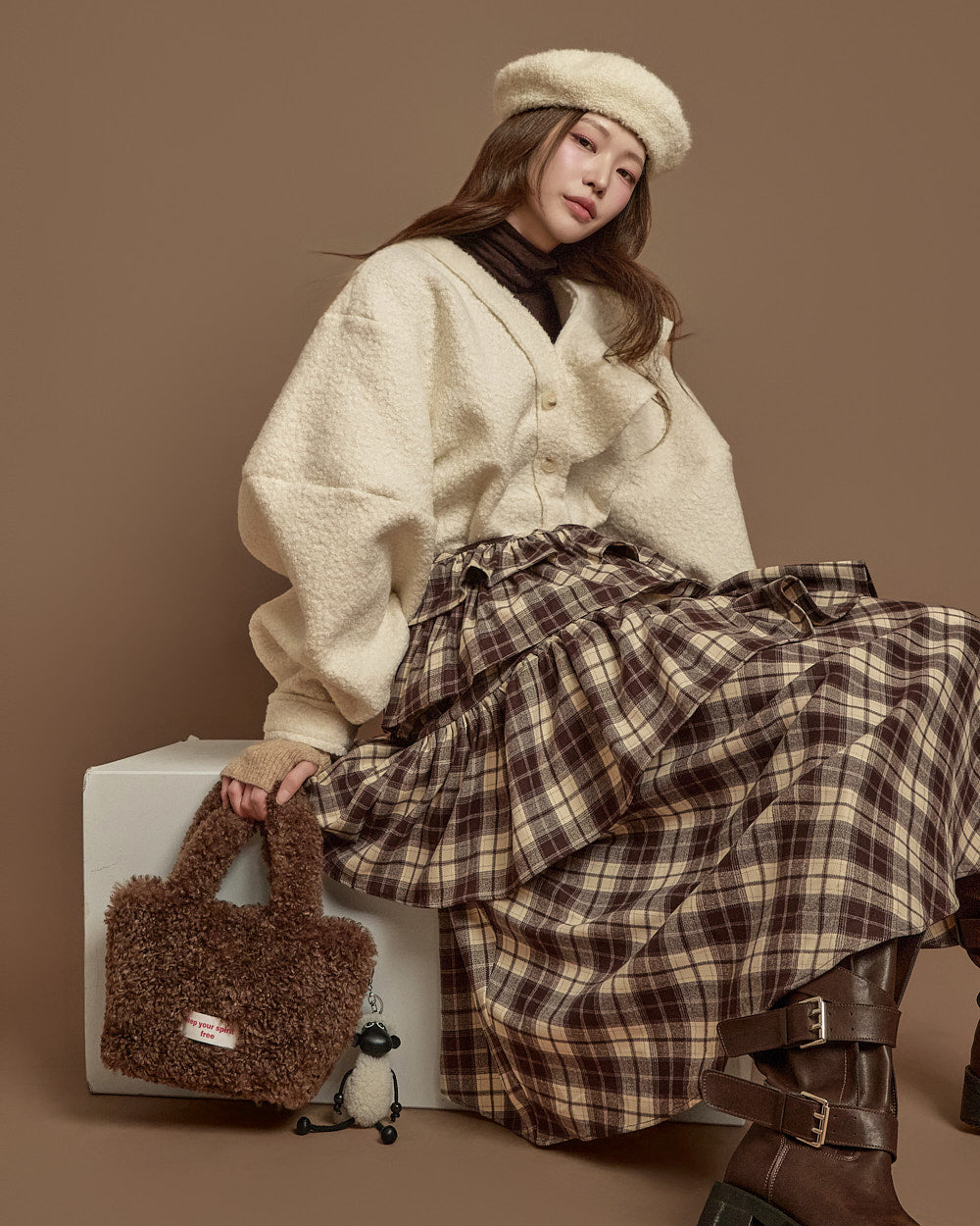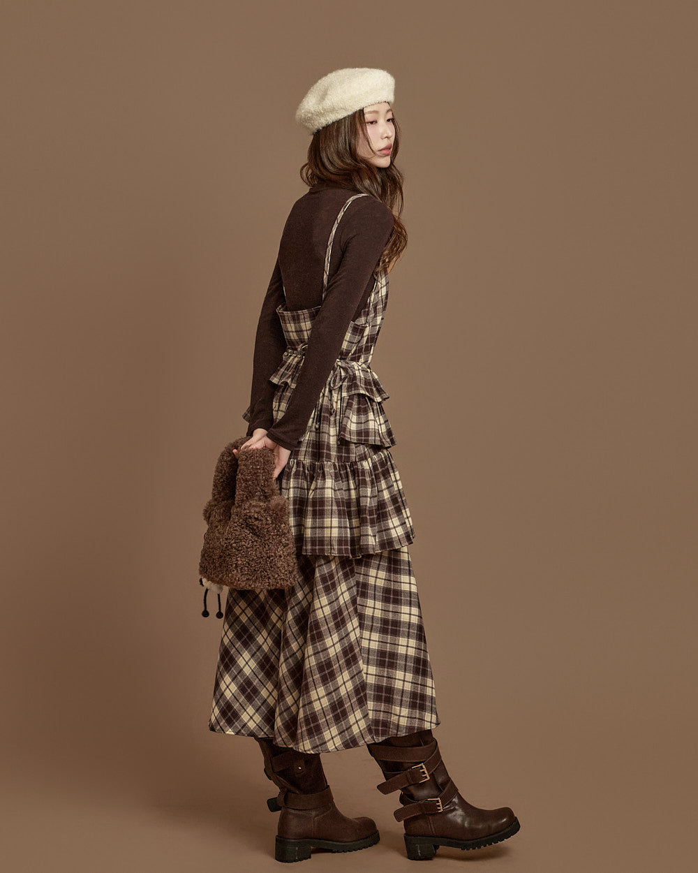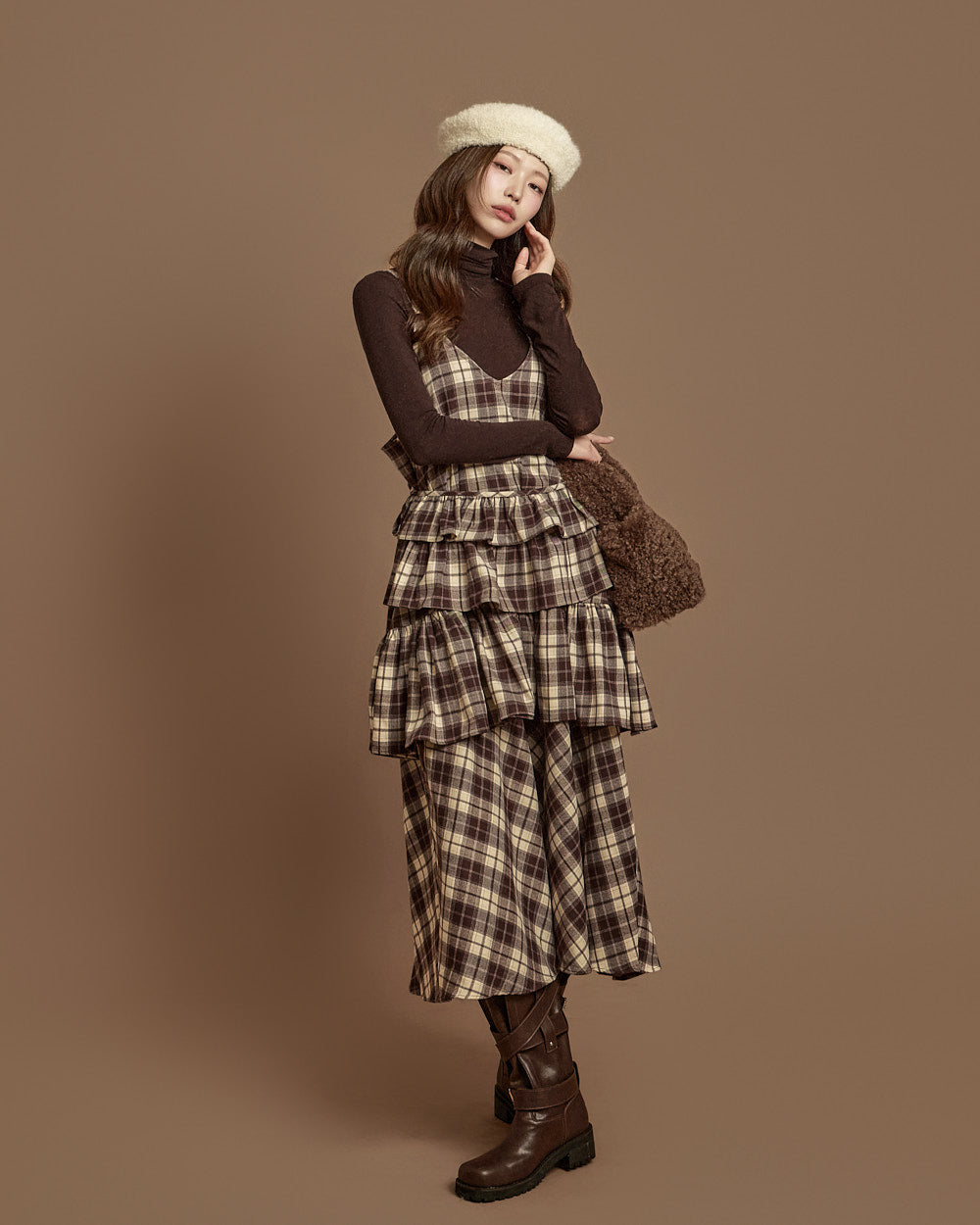 The set includes a frilled skirt with a check pattern and a sleeveless dress,