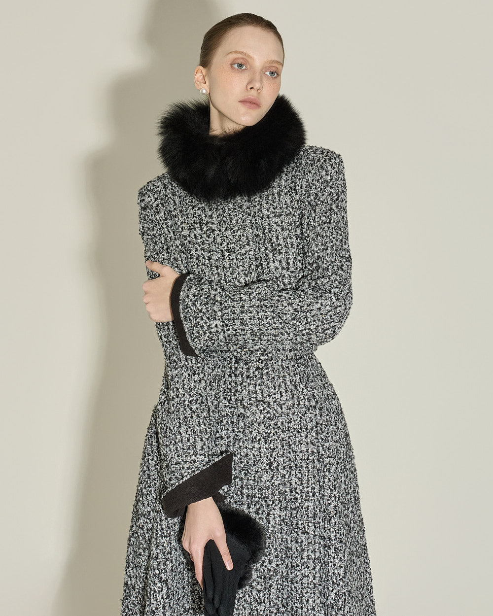 The tweed texture adds a classic touch,