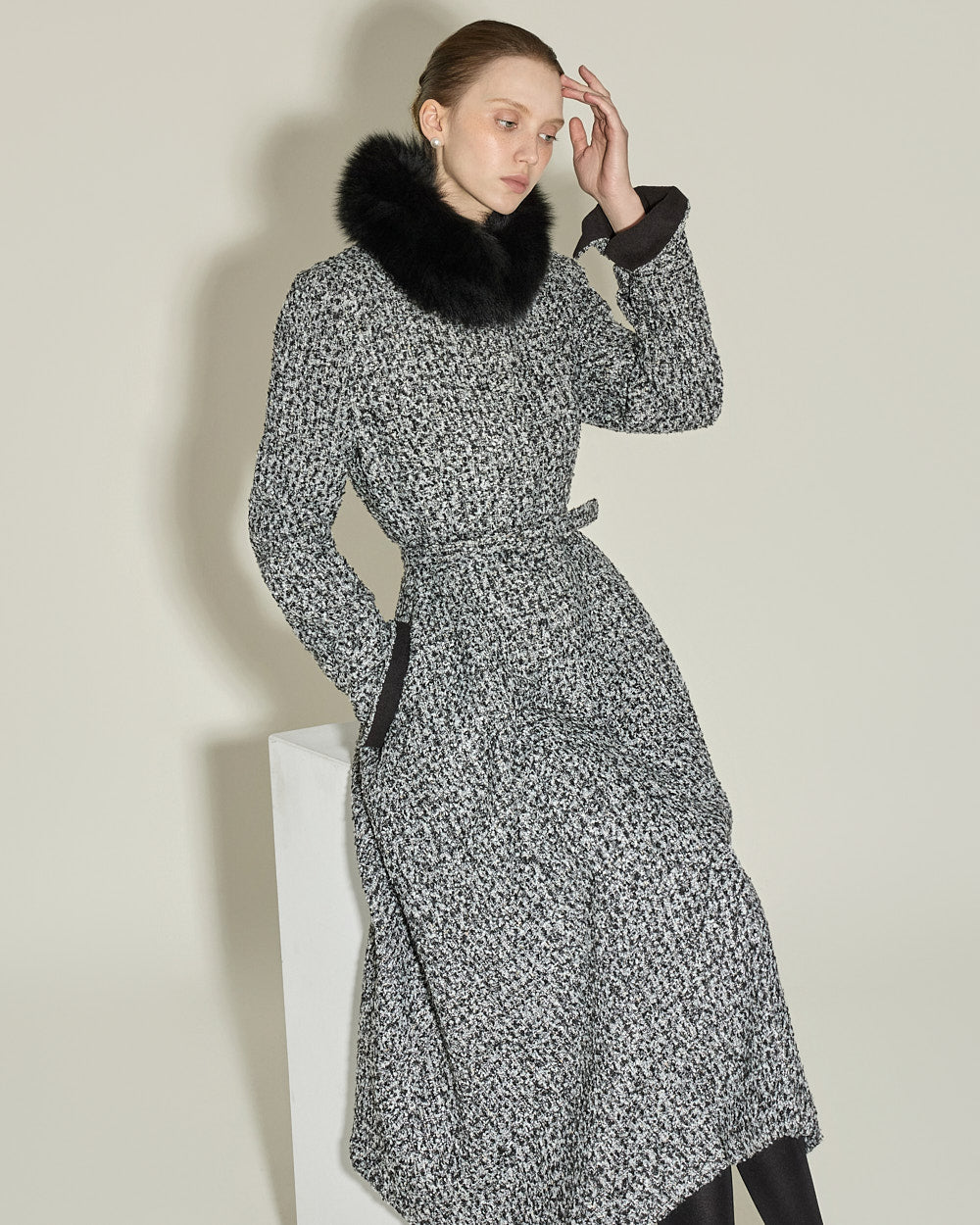 The fitted silhouette is complemented by a belt set that cinches the waist,