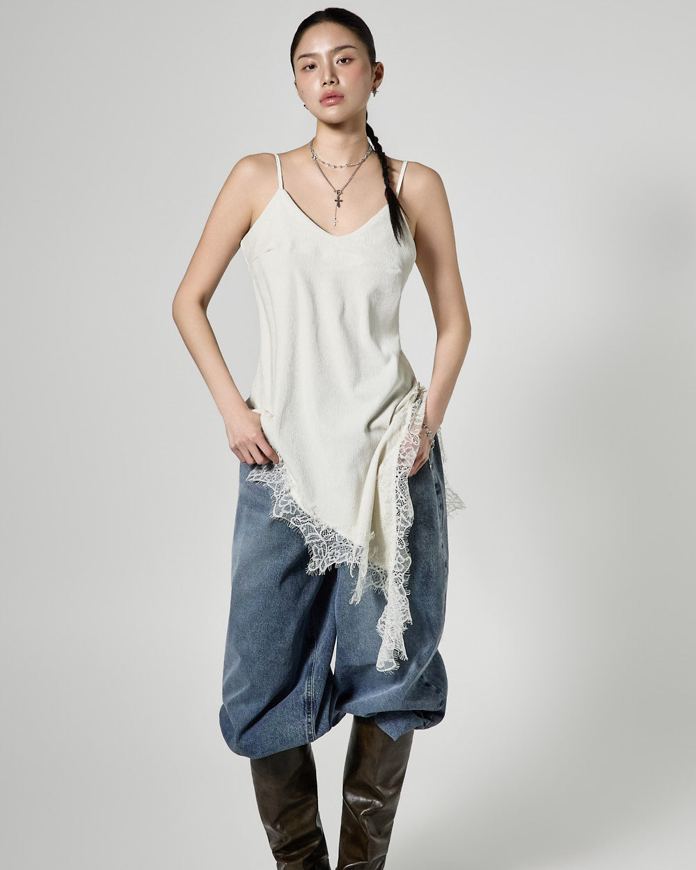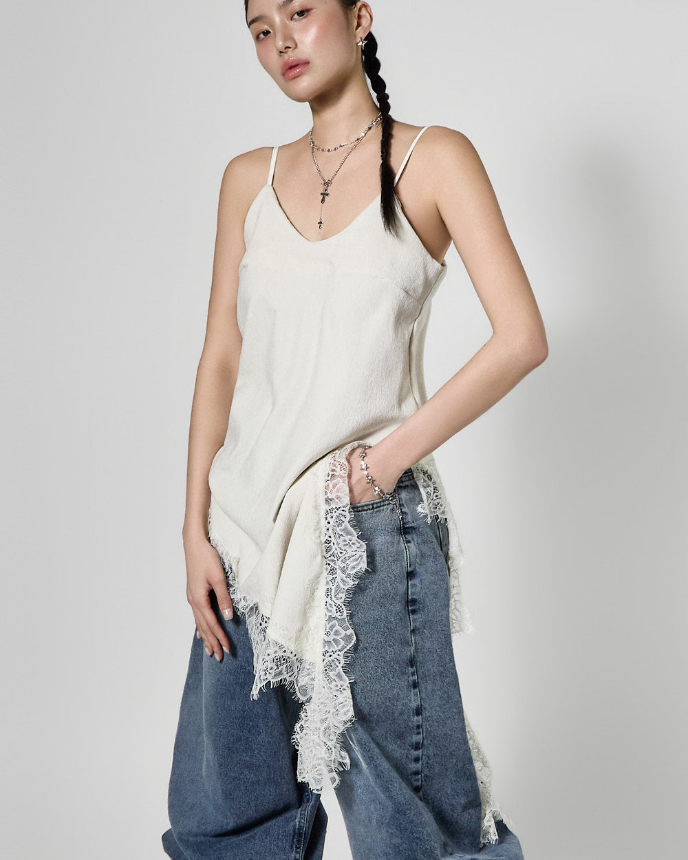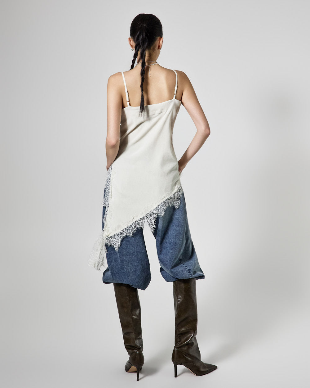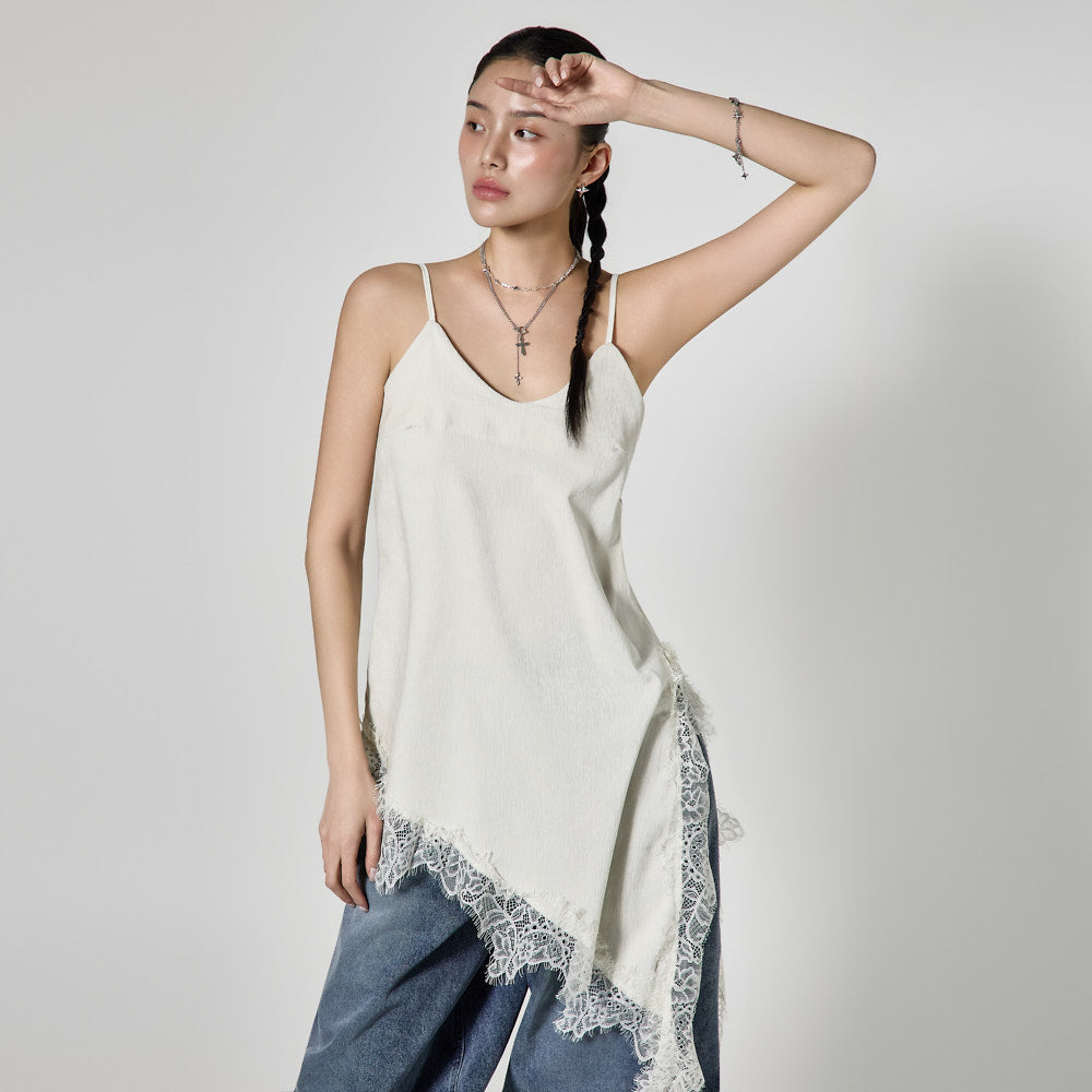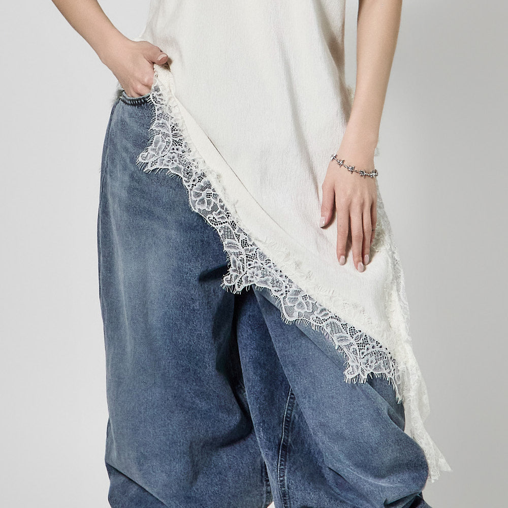 Designed with a loose-fit silhouette for a relaxed wear, it features asymmetrical lace detailing and a side slit that adds natural movement and visual interest.