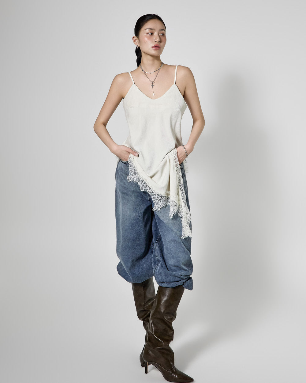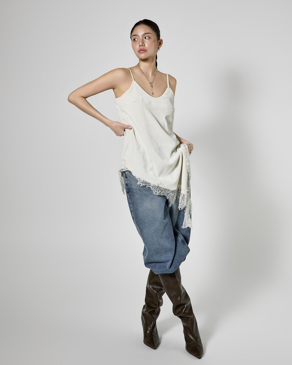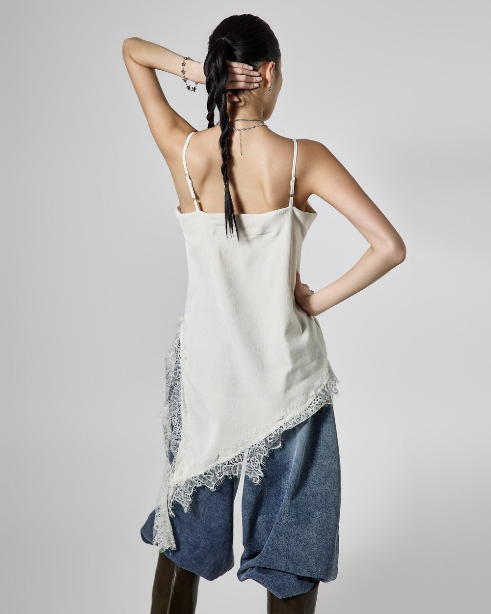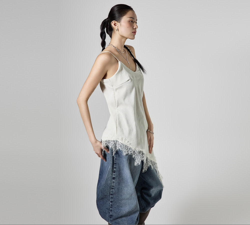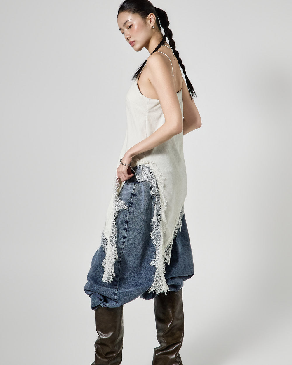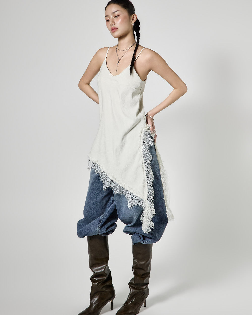 Designed with a loose-fit silhouette for a relaxed wear, it features asymmetrical lace detailing and a side slit that adds natural movement and visual interest.