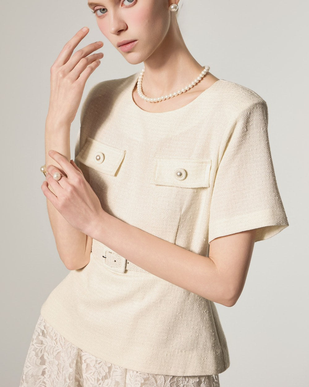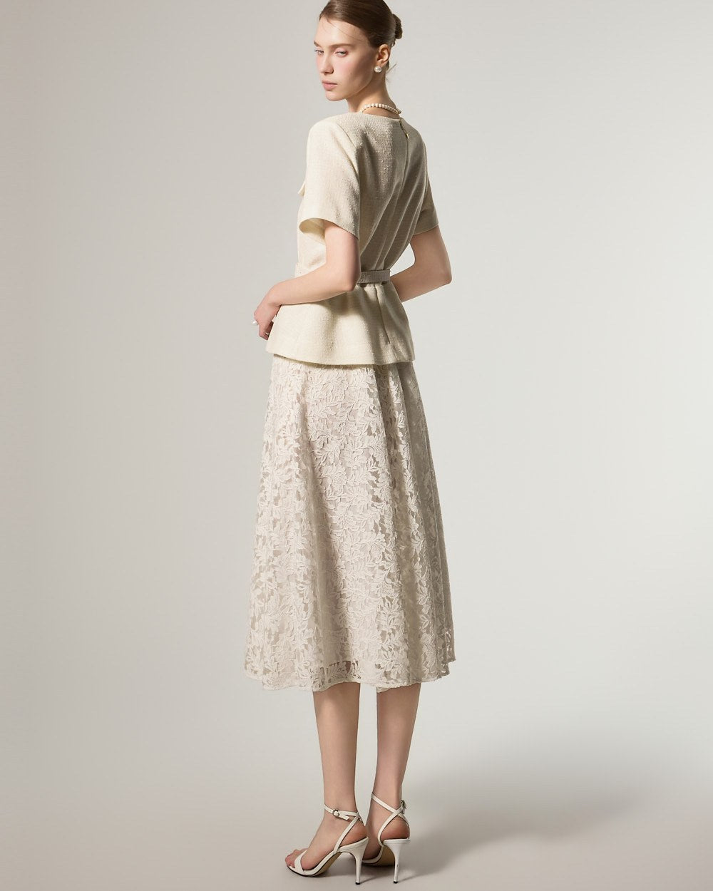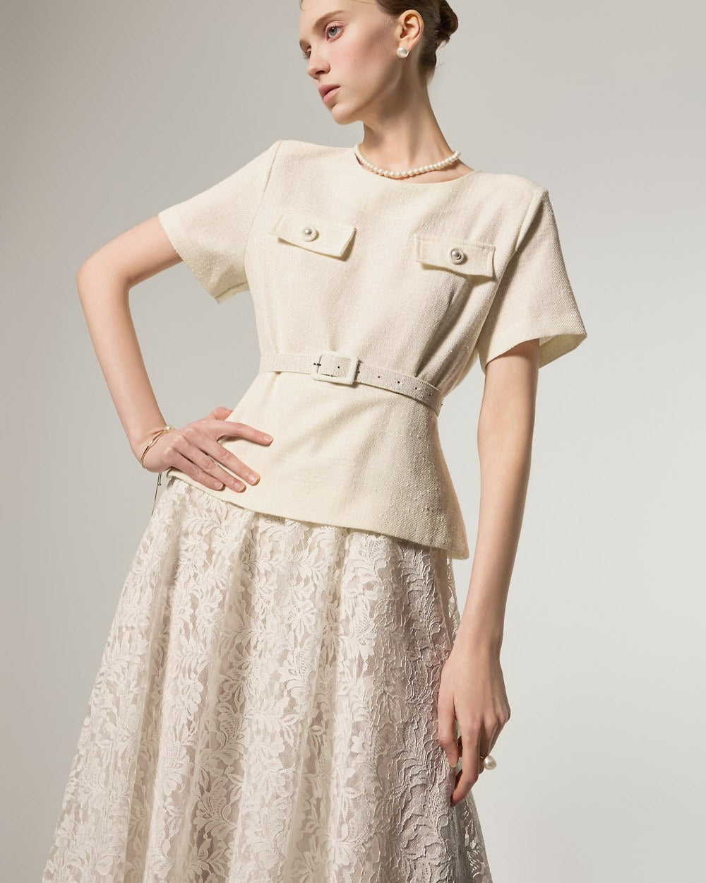 并通过分层蕾丝和粗花呢设计增添了奢华感。