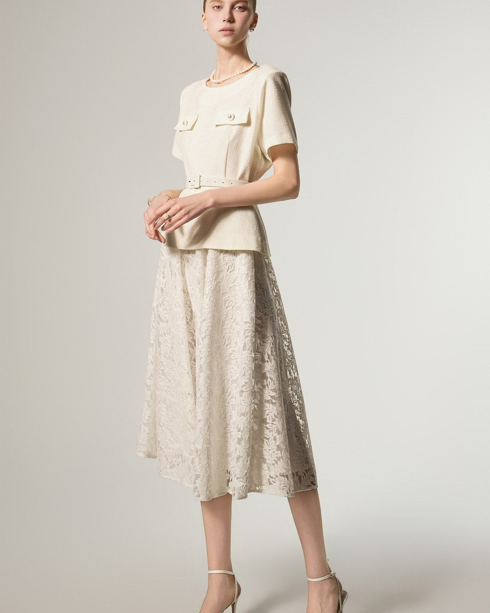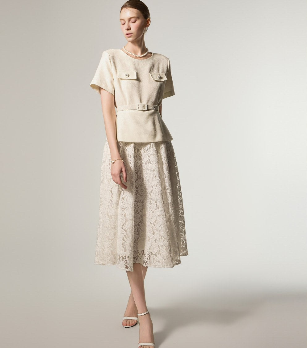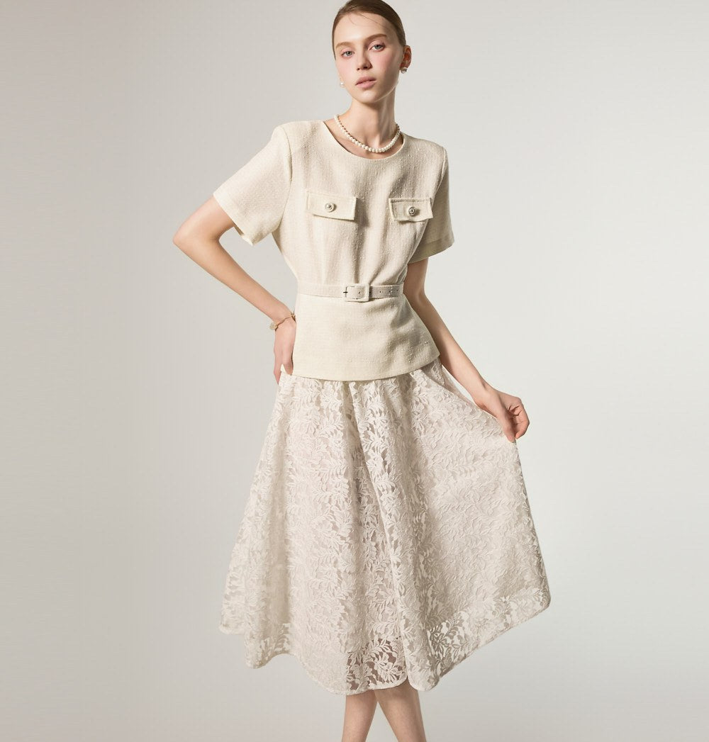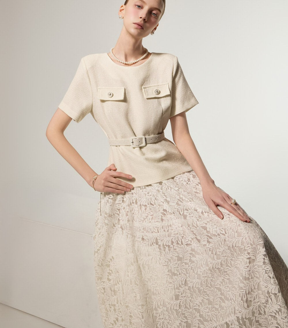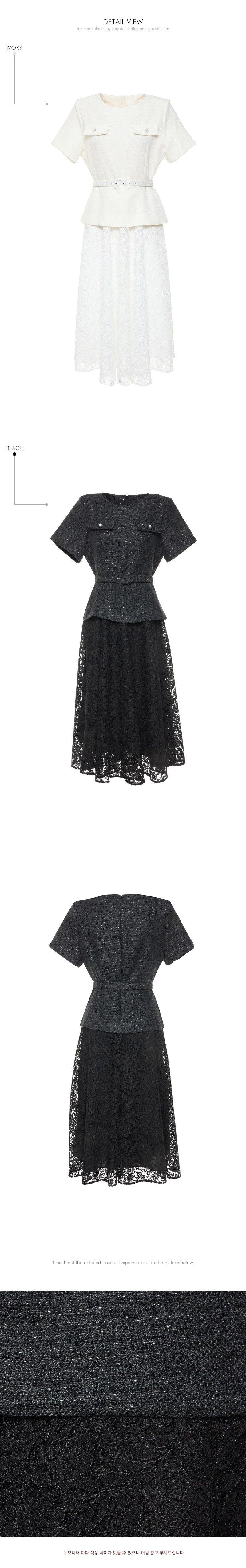 这是一款蕾丝连衣裙,搭配腰带套装,彰显现代女性气质。
