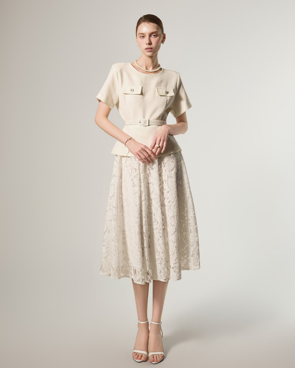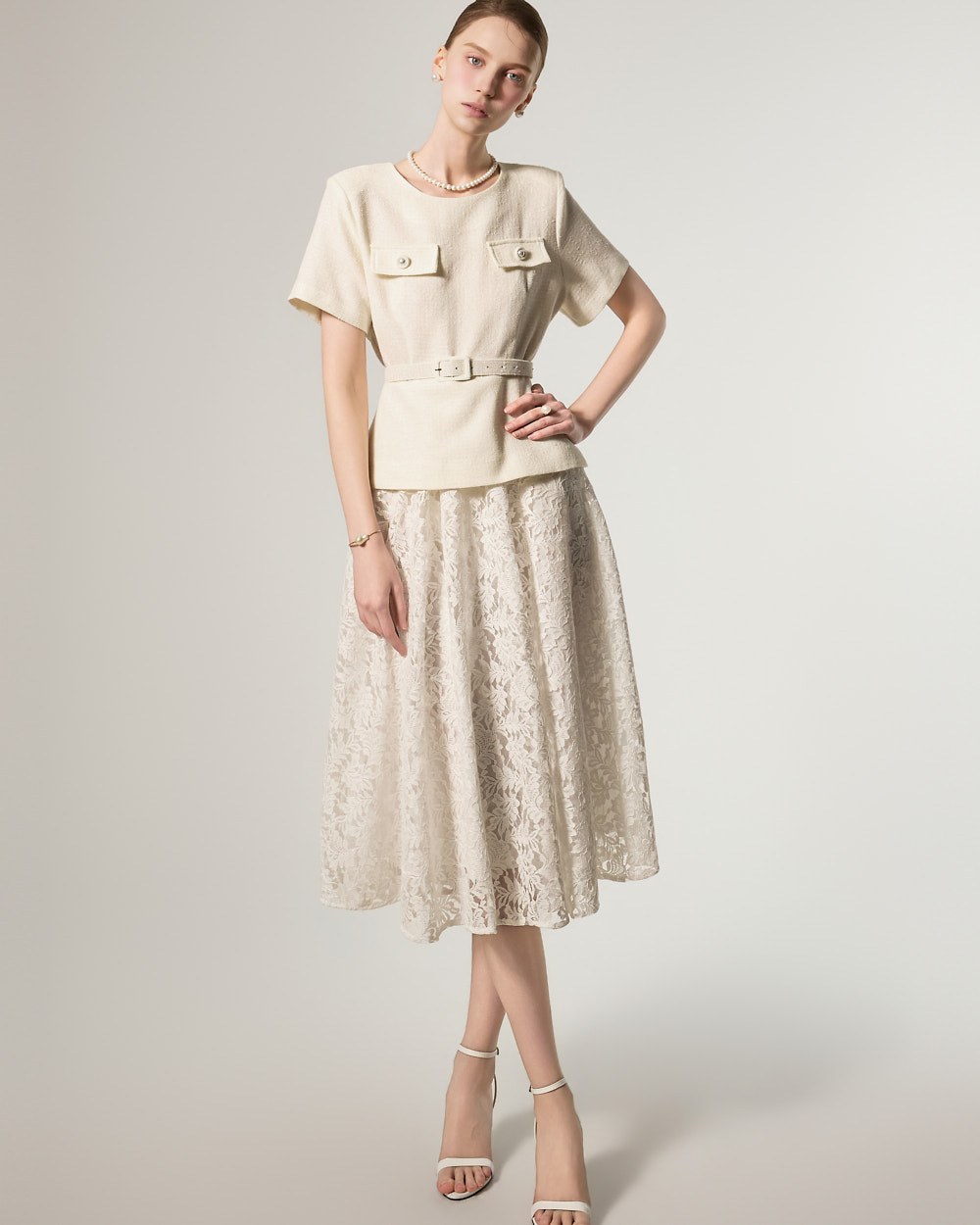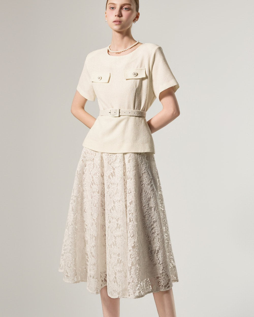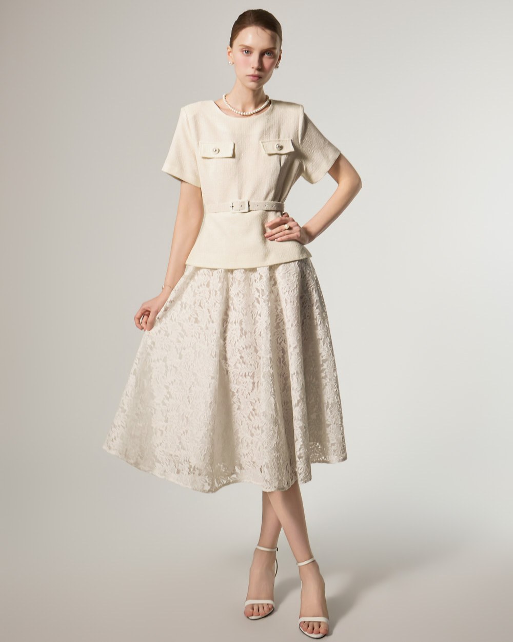 这是一款蕾丝连衣裙,搭配腰带套装,彰显现代女性气质。