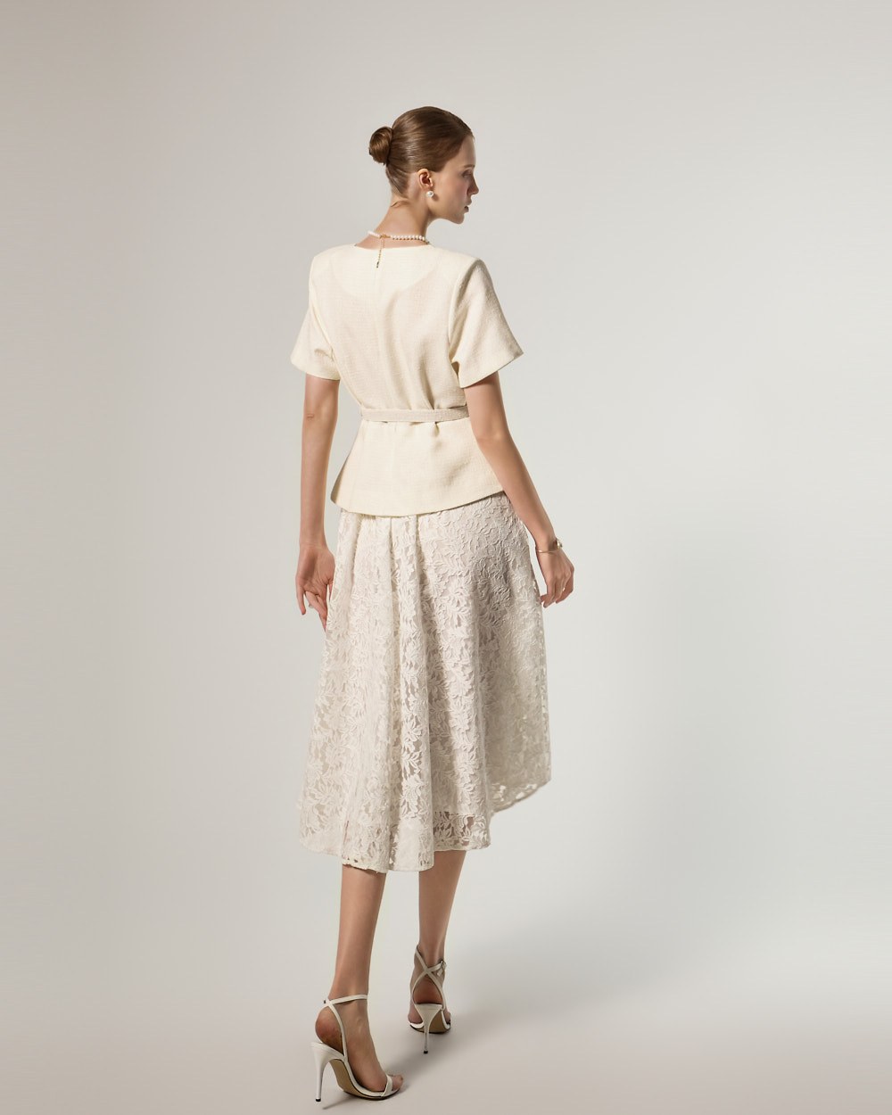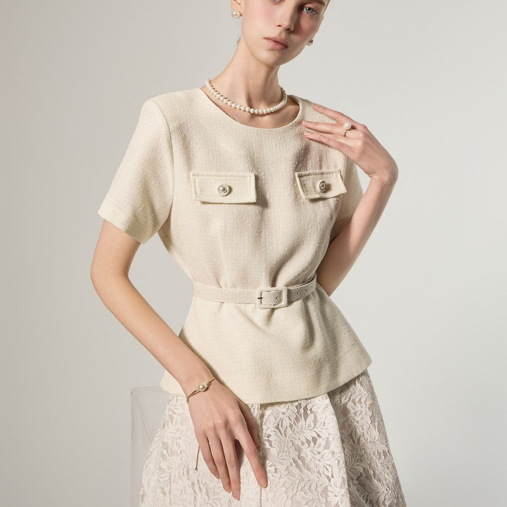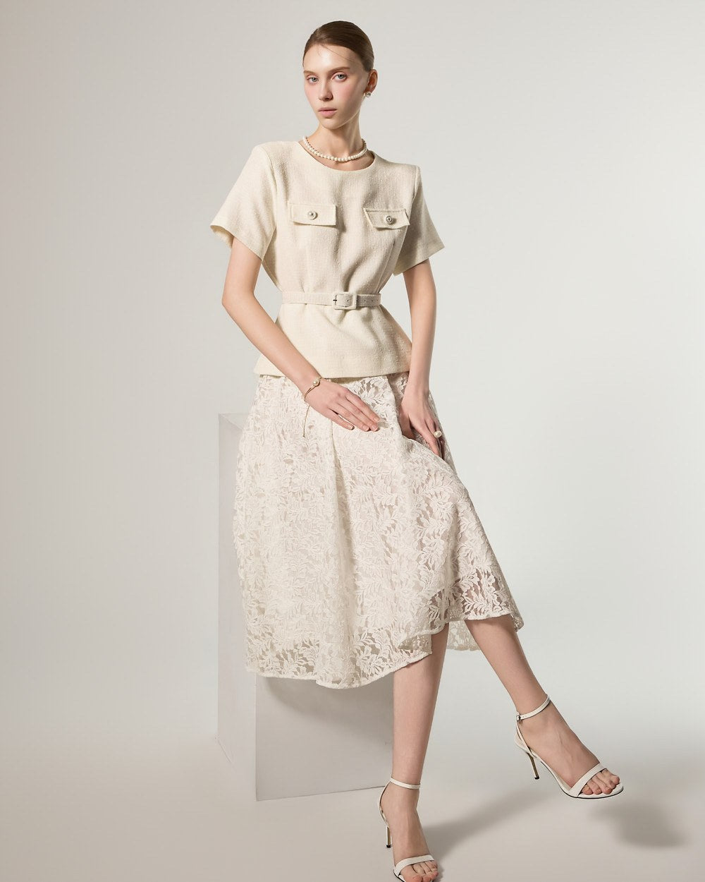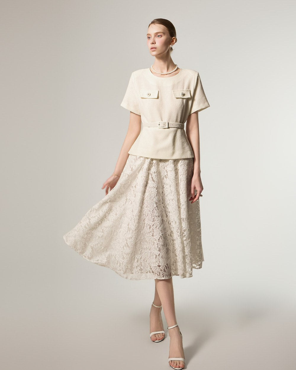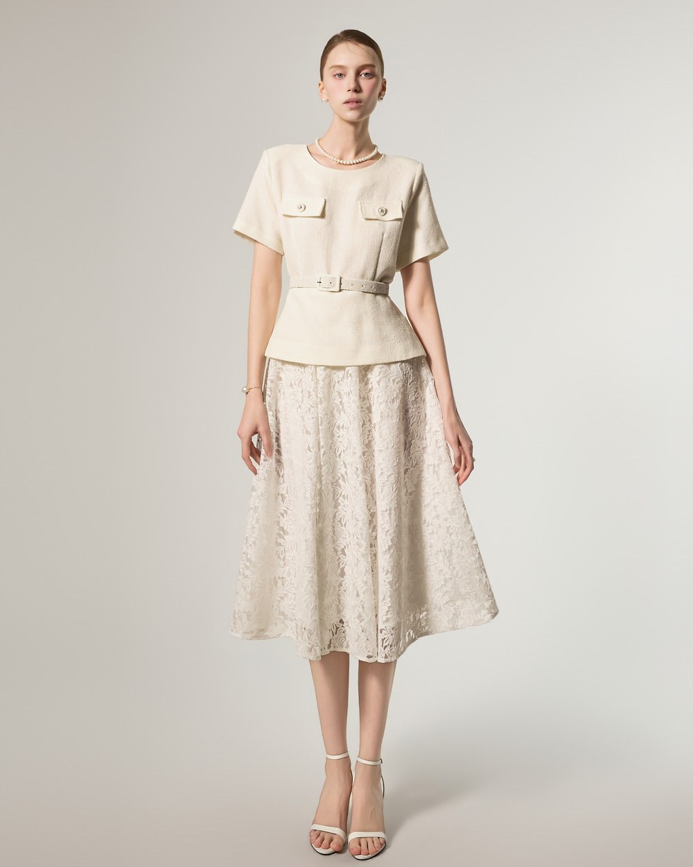 这是一款蕾丝连衣裙,搭配腰带套装,彰显现代女性气质。